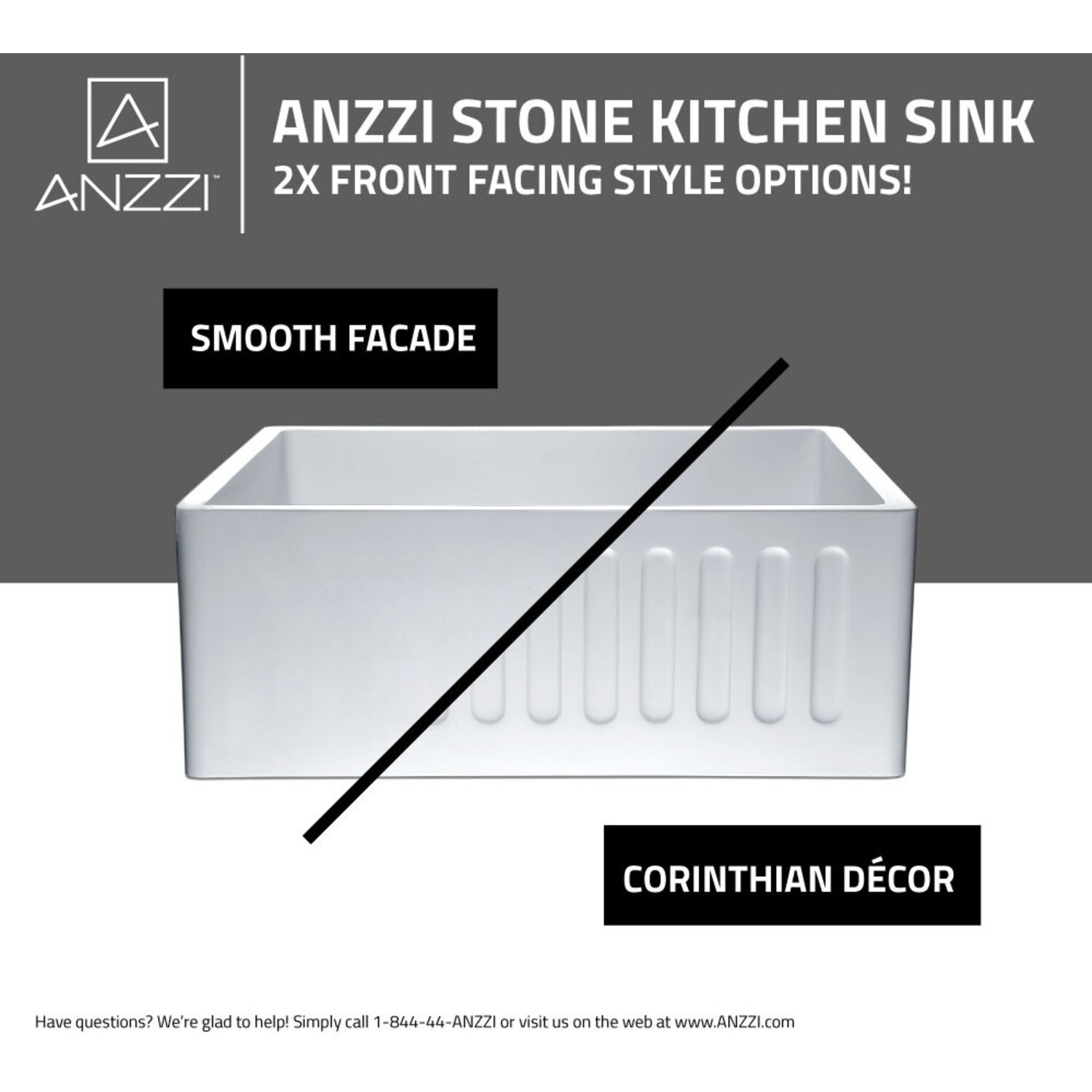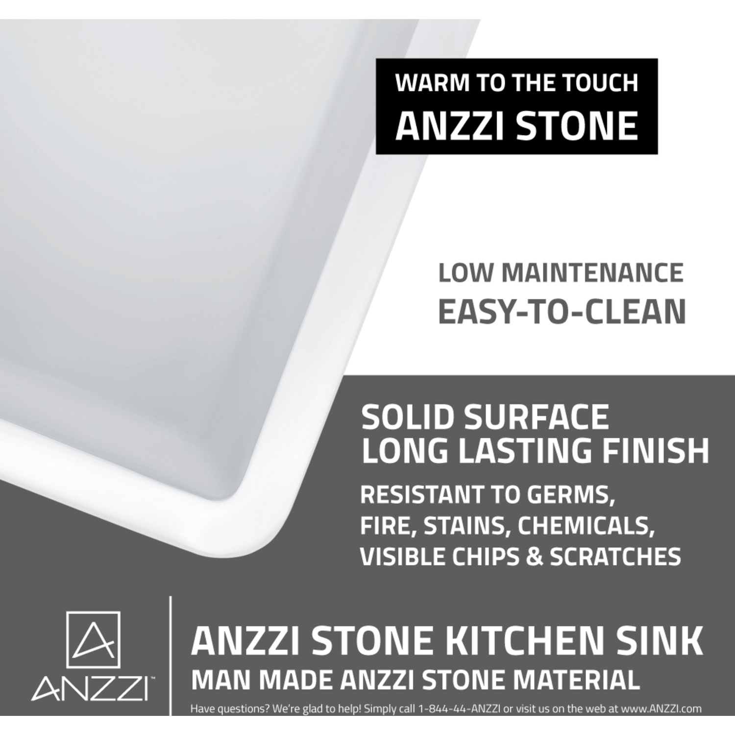 The renaissance of kitchen hardware has arrived with ANZZI’s ROINE series kitchen sinks. Crafted of rich Solid Surface man made ANZZI stone the ROINE grants a smooth, non-porous surface that is warm and inviting to the touch. But the beauty of an ANZZI stone surface is its uncanny resilience to germs, stains, discoloration, visible chipping and more. The solid core nature allows you to easily sand away scuffs and marks without effecting the finish. ANZZI sinks are crafted to stand the test of time both structurally and aesthetically.Easy to clean, low maintenance non-porous surface resists germs, stains, fire and chemicalsRHINO ALLOY certified ANZZI Stone craftsmanship for unrivaled durabilityReversible smooth or decorative front installationSeamless 10 mm radius corners for easier cleaning3.5 in. drain openingExterior dimensions: 23.62 in. L x 17.91 in. W x 9.06 in. HBasin dimensions: 21.9 in. L x 16.14 in. W x 7.87 in. HSmooth and warm to the touch matte finishShips from factory within 24 hours once order is processedLifetime warrantyTo speak to a knowledgeable and dedicated ANZZI specialist simply call 1-844-44-ANZZI or visit us on the web at www.ANZZI.comDue to a +/- 5 mm tolerance in the measurements it is recommended that cutting or building the countertop is not performed until the sink is received and measured