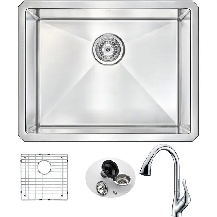 Single deep soak basin openingANZZI Accent kitchen sink faucet KF-AZ031ANZZI Echo-STOP sound absorbing technology drastically reduces noiseTriple coated underside shielding prevents condensationDimensions: 23 in. L x 18 in. W x 10 in. H (Basin Depth: 10 in.)Minimum Cabinet Space: 26 in.Standard 3.5 in. drain openingLaser precise diverting lines allow for more efficient water drainageQuality assured handmade constructionRHINO ALLOY certified 304 Stainless Steel with 16 gauge strengthcUPC certifiedLustrous Satin finishIncludes perfect fitting strainer and drain assembly, insert strainer basket, mounting hardwareShips from factory within 24 hours once order is processed