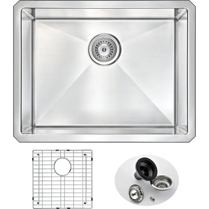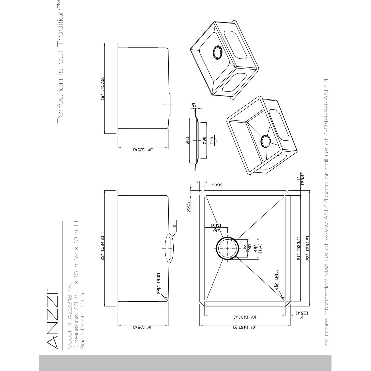 Single Deep Soak basin openingANZZI Echo-STOP sound absorbing technology drastically reduces noise and are among the largest pads available in the marketTriple coated underside shielding prevents condensationDimensions: 23 in. L x 18 in. W x 10 in. H (Basin Depth: 10 in.)Minimum Cabinet Space: 26 in.Standard 3.5 in. drain openingLaser precise diverting lines allow for more efficient water drainageQuality assured handmade constructionRHINO ALLOY certified 304 Stainless Steel with 16 gauge strengthcUPC certifiedLustrous Satin finishIncludes perfect fitting strainer and drain assembly, insert strainer basket, mounting hardwareShips from factory within 24 hours once order is processedLifetime Warranty