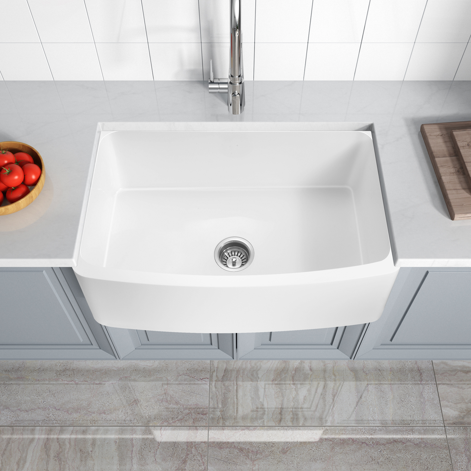 Anzzi Mesa Series Farmhouse Solid Surface 33 in. 0-Hole Single Bowl Kitchen Sink with 1 Strainer in Matte White, 191042049604, K-AZ272-A1