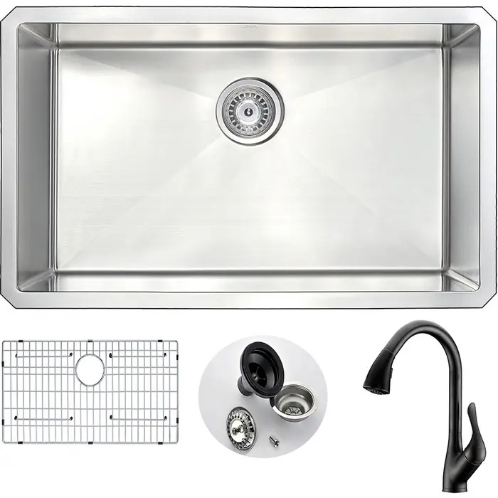 Single deep soak basin openingANZZI Accent kitchen sink faucet KF-AZ031ORBANZZI Echo-STOP sound absorbing technology drastically reduces noiseTriple coated underside shielding prevents condensationDimensions: 30 in. L x 18 in. W x 10 in. H (Basin Depth: 10 in.)Minimum Cabinet Space: 33 in.Standard 3.5 in. drain openingLaser precise diverting lines allow for more efficient water drainageQuality assured handmade constructionRHINO ALLOY certified 304 Stainless Steel with 18 gauge strengthcUPC certifiedLustrous Satin finishIncludes perfect fitting strainer and drain assembly, insert strainer basket, mounting hardwareShips from factory within 24 hours once order is processed
