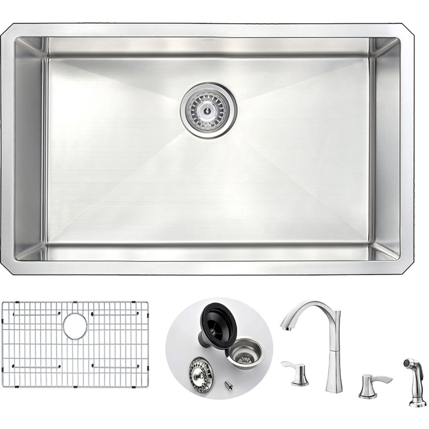 Single deep soak basin openingANZZI Soave kitchen sink faucet KF-AZ032BNANZZI Echo-STOP sound absorbing technology drastically reduces noiseTriple coated underside shielding prevents condensationDimensions: 30 in. L x 18 in. W x 10 in. H (Basin Depth: 10 in.)Minimum Cabinet Space: 33 in.Standard 3.5 in. drain openingLaser precise diverting lines allow for more efficient water drainageQuality assured handmade constructionRHINO ALLOY certified 304 Stainless Steel with 18 gauge strengthcUPC certifiedLustrous Satin finishIncludes perfect fitting strainer and drain assembly, insert strainer basket, mounting hardwareShips from factory within 24 hours once order is processed