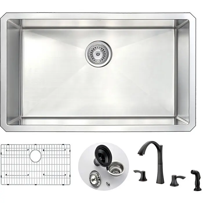 Single deep soak basin openingANZZI Soave kitchen sink faucet KF-AZ032ORBANZZI Echo-STOP sound absorbing technology drastically reduces noiseTriple coated underside shielding prevents condensationDimensions: 30 in. L x 18 in. W x 10 in. H (Basin Depth: 10 in.)Minimum Cabinet Space: 33 in.Standard 3.5 in. drain openingLaser precise diverting lines allow for more efficient water drainageQuality assured handmade constructionRHINO ALLOY certified 304 Stainless Steel with 18 gauge strengthcUPC certifiedLustrous Satin finishIncludes perfect fitting strainer and drain assembly, insert strainer basket, mounting hardwareShips from factory within 24 hours once order is processed