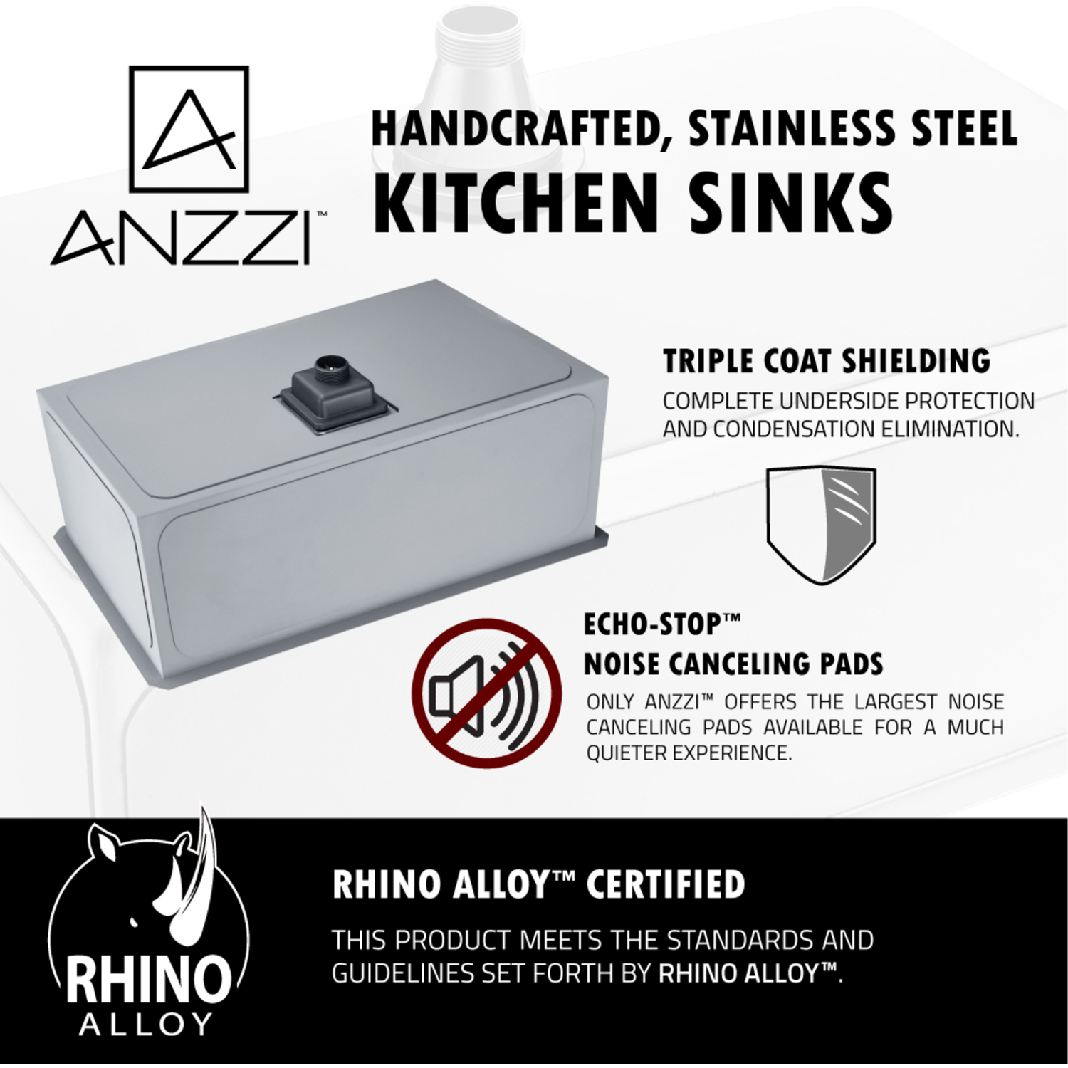 ANZZI presents the 30" VANGUARD SERIES hand crafted under mount kitchen sink. Representing the latest in modern home fixture designs and traditional European crafting technique this stunning display of artistry is hand shaped to perfection using RHINO ALLOY certified 16 gauge 304 stainless steel. Only ANZZI hand crafted kitchen sinks utilize RHINO ALLOY certified materials for superior strength and quality. The cavernous deep soaking basin will comfortably accommodate the largest dish loads including pots, pans and more. And every ANZZI sink features the largest Echo-STOP sound dampening pads available and a layer of protective composite coating to further quiet noise and prevent condensation. Well defined diversion lines ensure quick and total water drainage and the subtly curved corners allow of easier cleaning. ANZZI carries a proud tradition of crafting long lasting, quality home fixtures. With ANZZI perfection is our tradition.