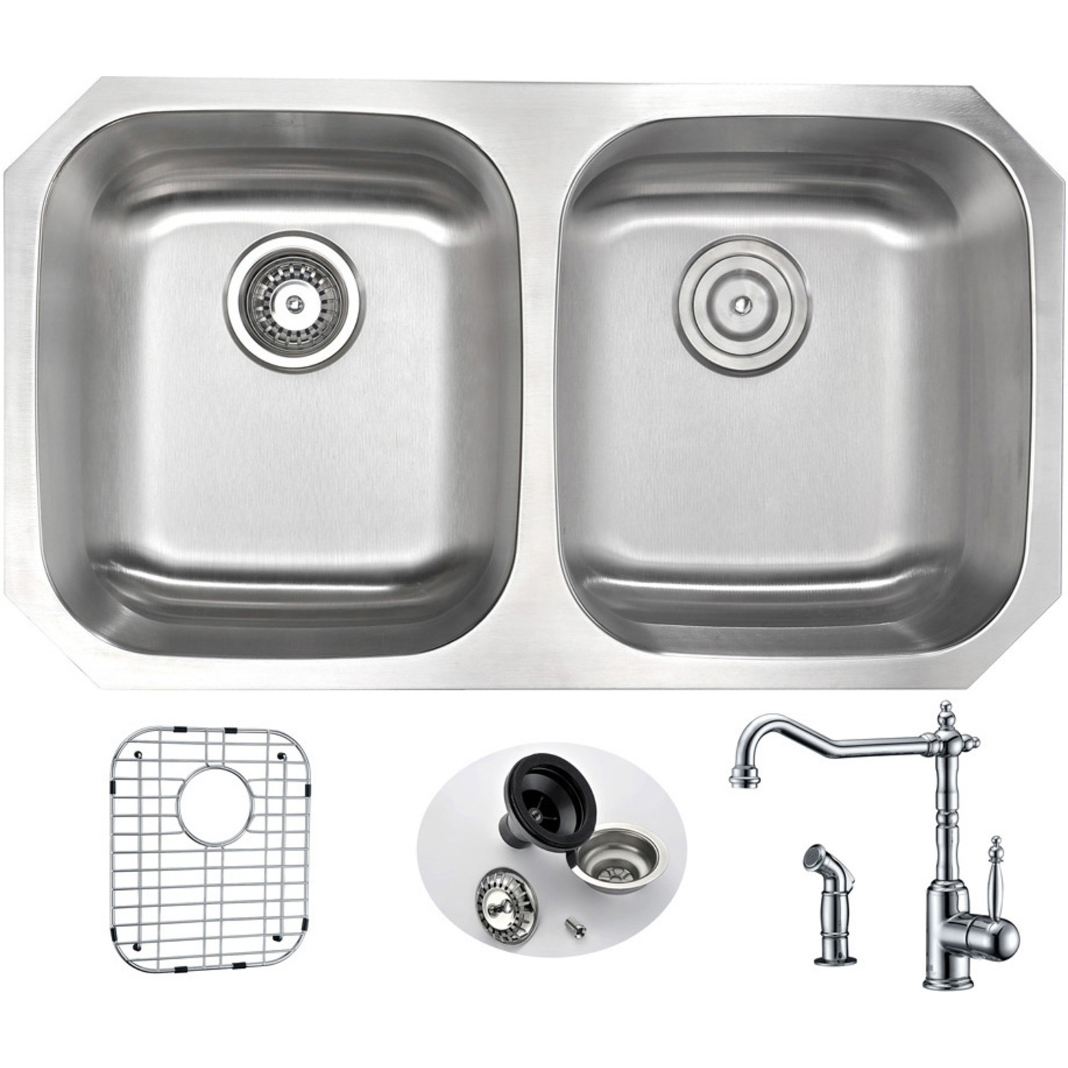 Dual deep soak basin with 50/50 splitANZZI Winston kitchen sink faucet KF-AZ037ANZZI Echo-STOP sound absorbing technology drastically reduces noiseTriple coated underside shielding prevents condensationDimensions: 32.25 in. L x 18.5 in. W x 9 in. H (Basin Depth: 9 in.)Minimum Cabinet Space: 36 in.Standard 3.5 in. drain openingGentle bowing base design makes for more efficient water drainageHigh tolerance machine pressed precisionRHINO ALLOY certified 304 Stainless Steel with 16 gauge strengthcUPC certifiedLustrous Satin finishIncludes perfect fitting strainer and drain assembly, insert strainer basket, mounting hardwareShips from factory within 24 hours once order is processed