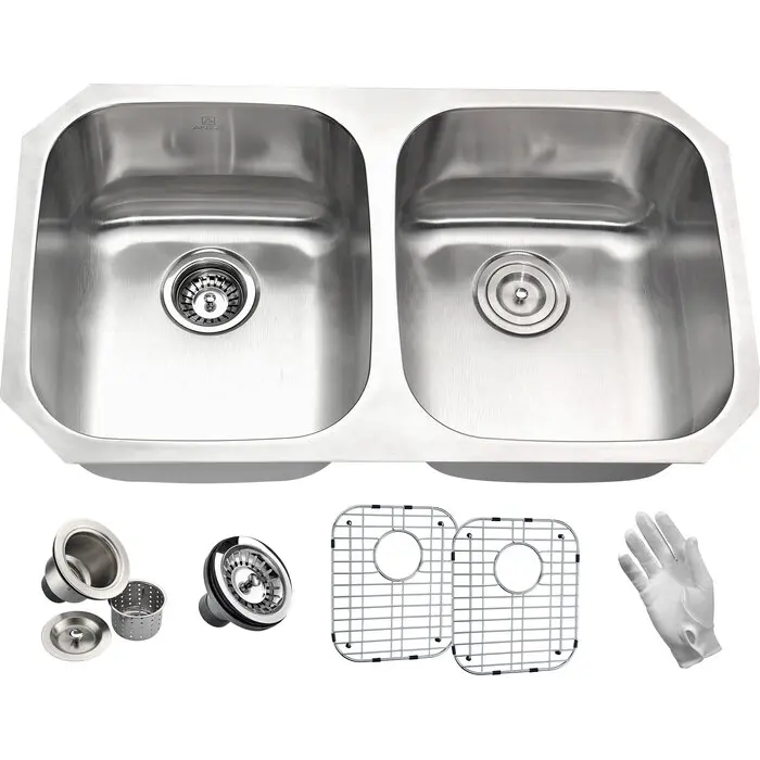 Anzzi Moore Undermount Stainless Steel 32 in. 0-Hole 50/50 Double Bowl Kitchen Sink in Brushed Satin, 848308073513, K-AZ3218-2B