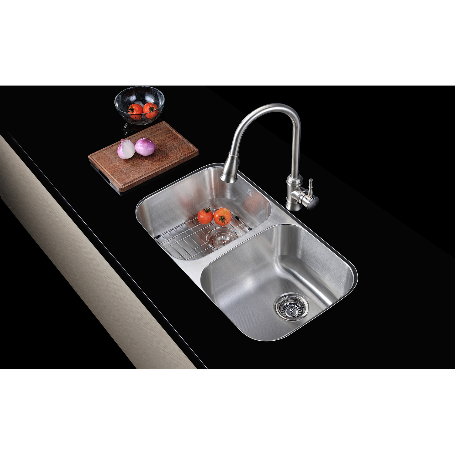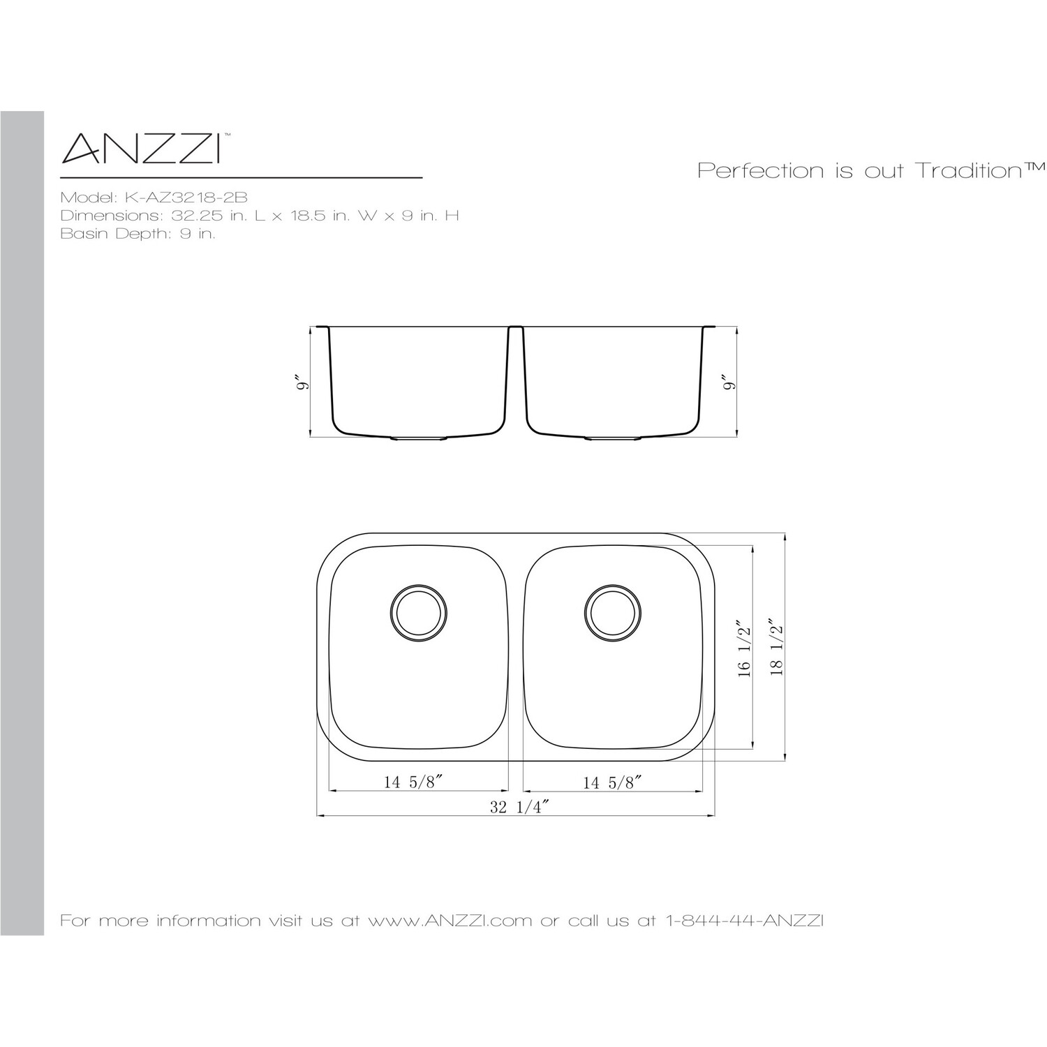 Dual Deep Soak basin with 50/50 splitANZZI Echo-STOP sound absorbing technology drastically reduces noise and are among the largest pads available in the marketTriple coated underside shielding prevents condensationDimensions: 32.25 in. L x 18.5 in. W x 9 in. H (Basin Depth: 9 in.)Minimum Cabinet Space: 36 in.Standard 3.5 in. drain openingGentle bowing base design makes for more efficient water drainageHigh tolerance machine pressed precisionRHINO ALLOY certified 304 Stainless Steel with 16 gauge strengthLustrous Satin finishIncludes perfect fitting strainer and drain assembly, insert strainer basket, mounting hardwareShips from factory within 24 hours once order is processedLifetime WarrantyTo speak to a knowledgeable and dedicated ANZZI specialist simply call 1-844-44-ANZZI or visit us on the web at www.ANZZI.com