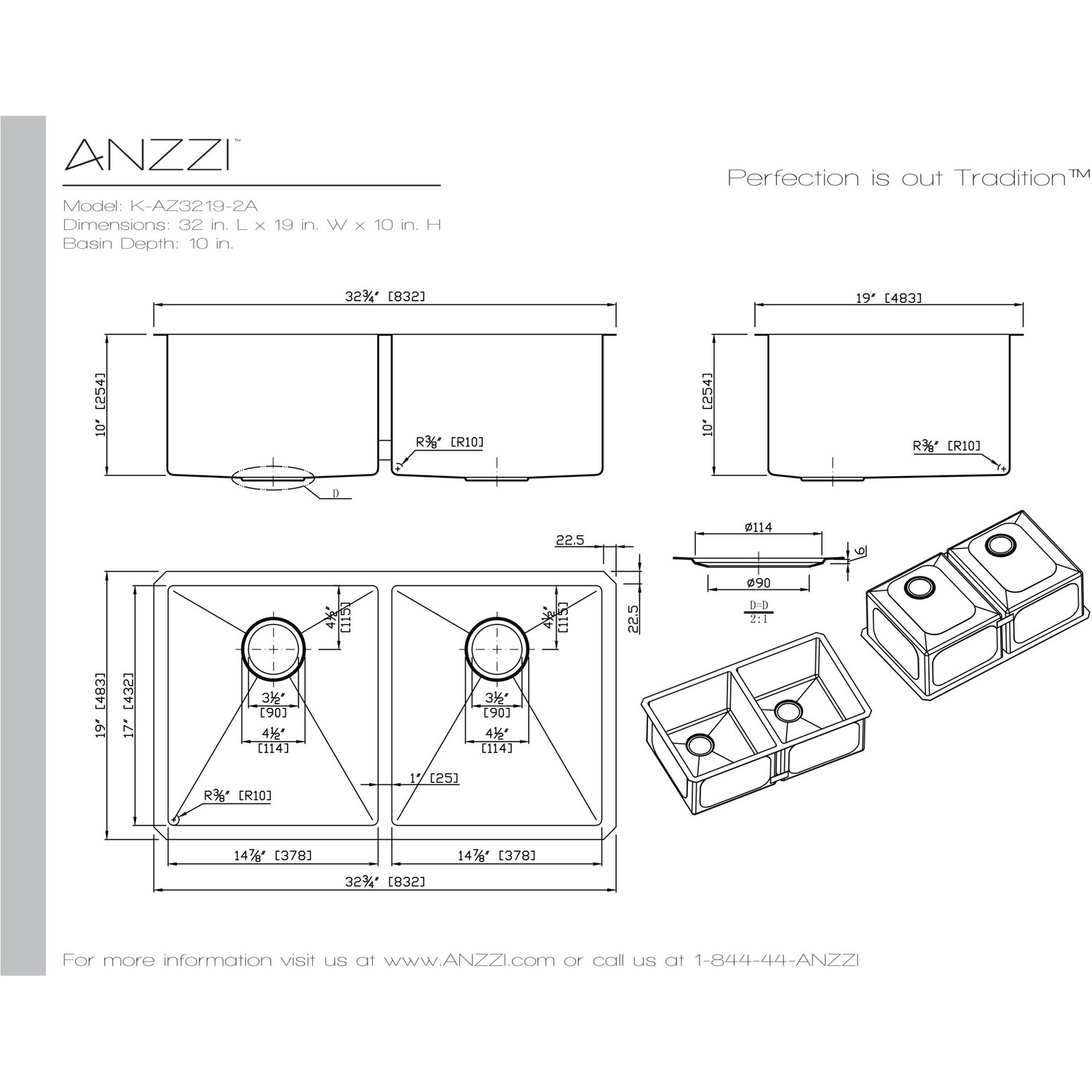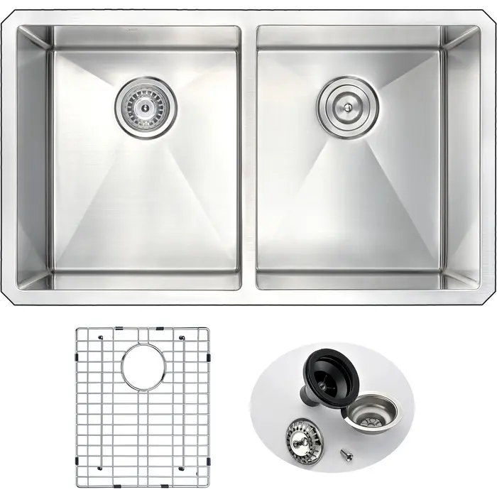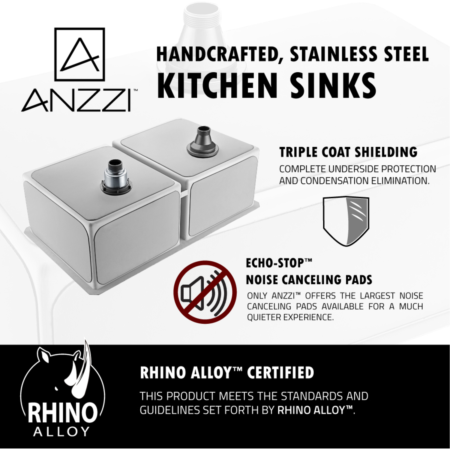 Dual Deep Soak basin openingANZZI Echo-STOP sound absorbing technology drastically reduces noise and are among the largest pads available in the marketTriple coated underside shielding prevents condensationDimensions: 32 in. L x 18 in. W x 10 in. H (Basin Depth: 10 in.)Minimum Cabinet Space: 36 in.Standard 3.5 in. drain openingLaser precise diverting lines allow for more efficient water drainageQuality assured handmade constructionRHINO ALLOY certified 304 Stainless Steel with 16 gauge strengthcUPC certifiedLustrous Satin finishIncludes perfect fitting strainer and drain assembly, insert strainer basket, mounting hardwareShips from factory within 24 hours once order is processedLifetime Warranty
