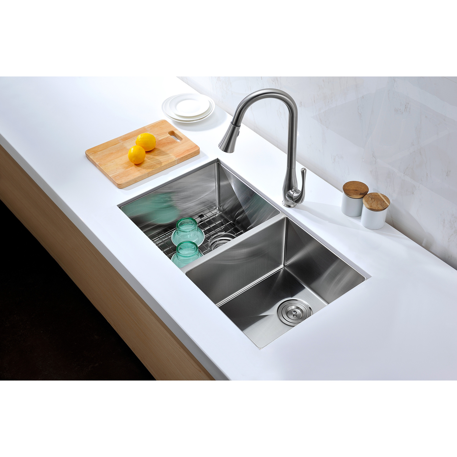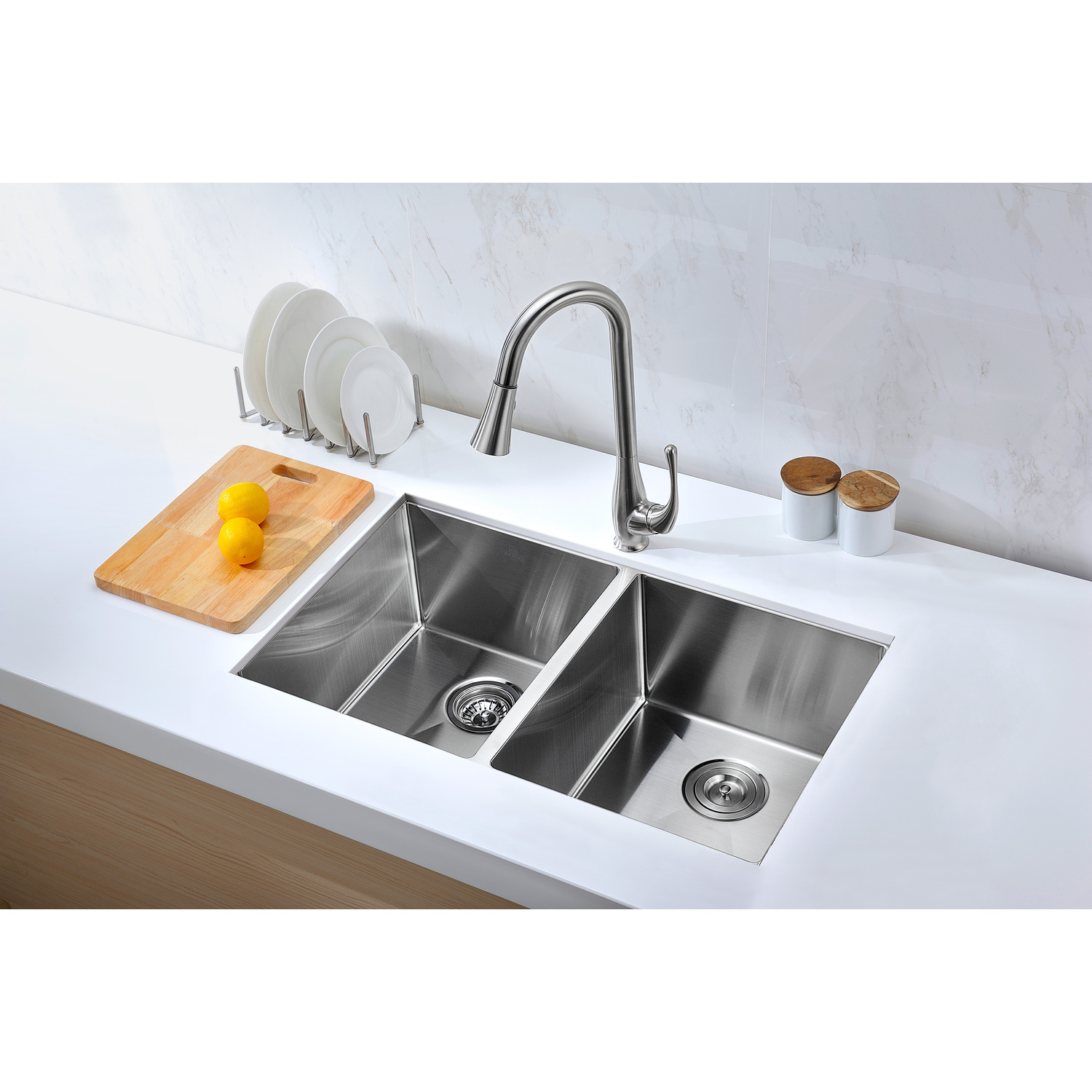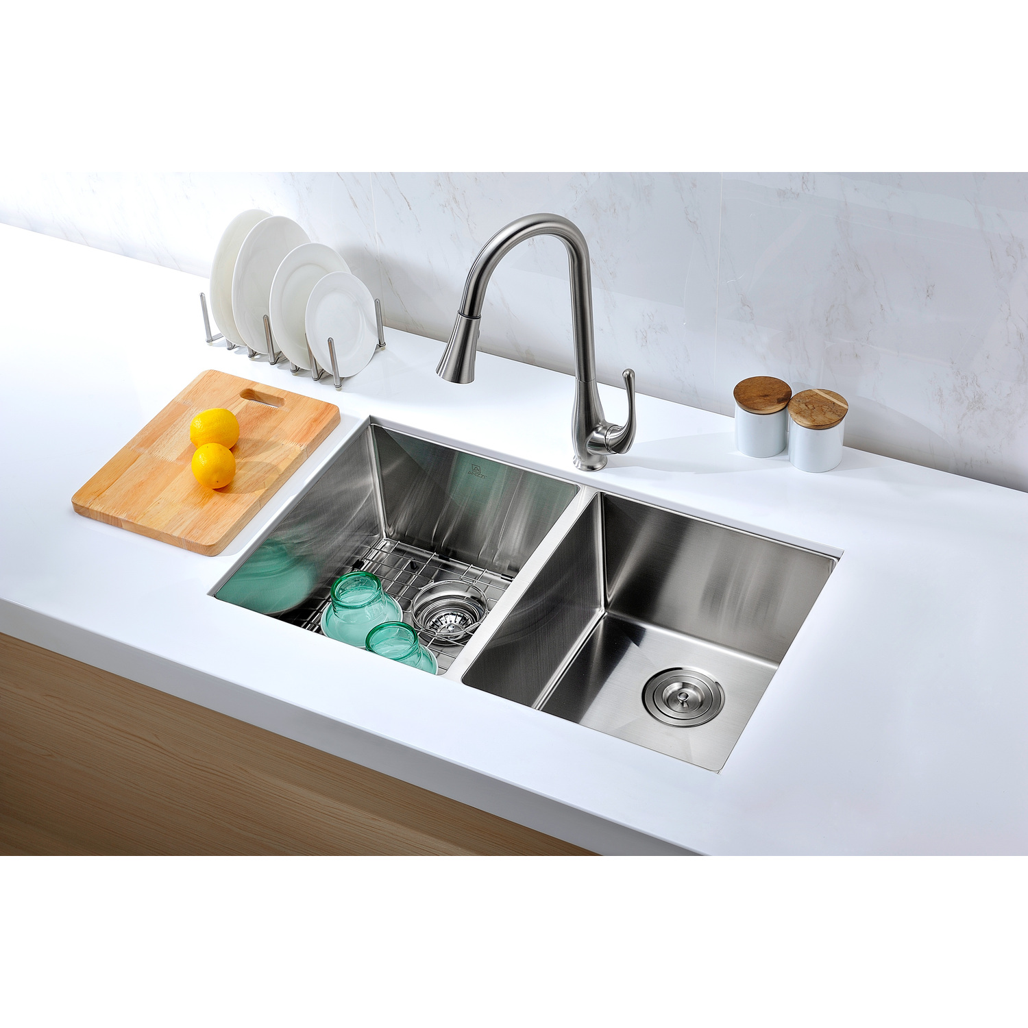 Dual Deep Soak basin openingANZZI Echo-STOP sound absorbing technology drastically reduces noise and are among the largest pads available in the marketTriple coated underside shielding prevents condensationDimensions: 32 in. L x 18 in. W x 10 in. H (Basin Depth: 10 in.)Minimum Cabinet Space: 36 in.Standard 3.5 in. drain openingLaser precise diverting lines allow for more efficient water drainageQuality assured handmade constructionRHINO ALLOY certified 304 Stainless Steel with 16 gauge strengthcUPC certifiedLustrous Satin finishIncludes perfect fitting strainer and drain assembly, insert strainer basket, mounting hardwareShips from factory within 24 hours once order is processedLifetime Warranty