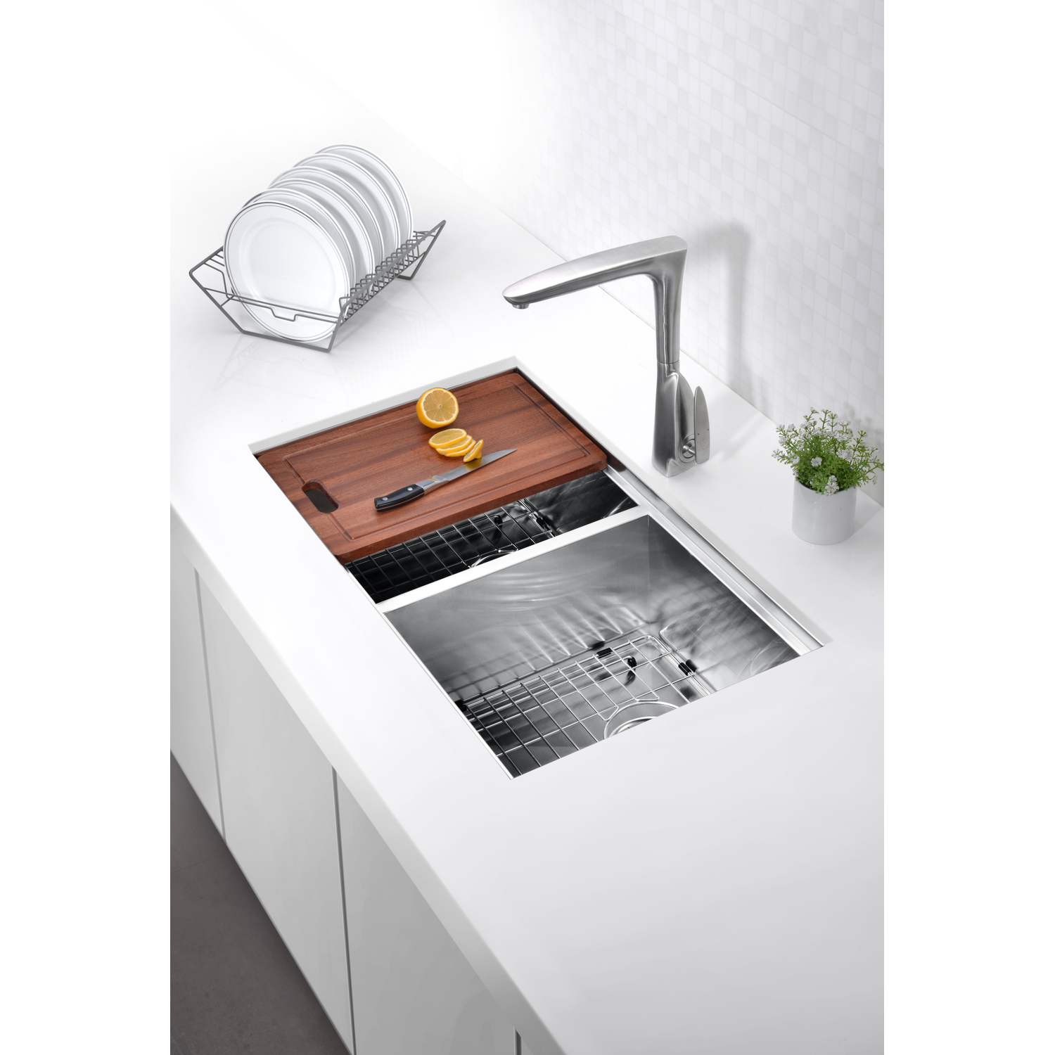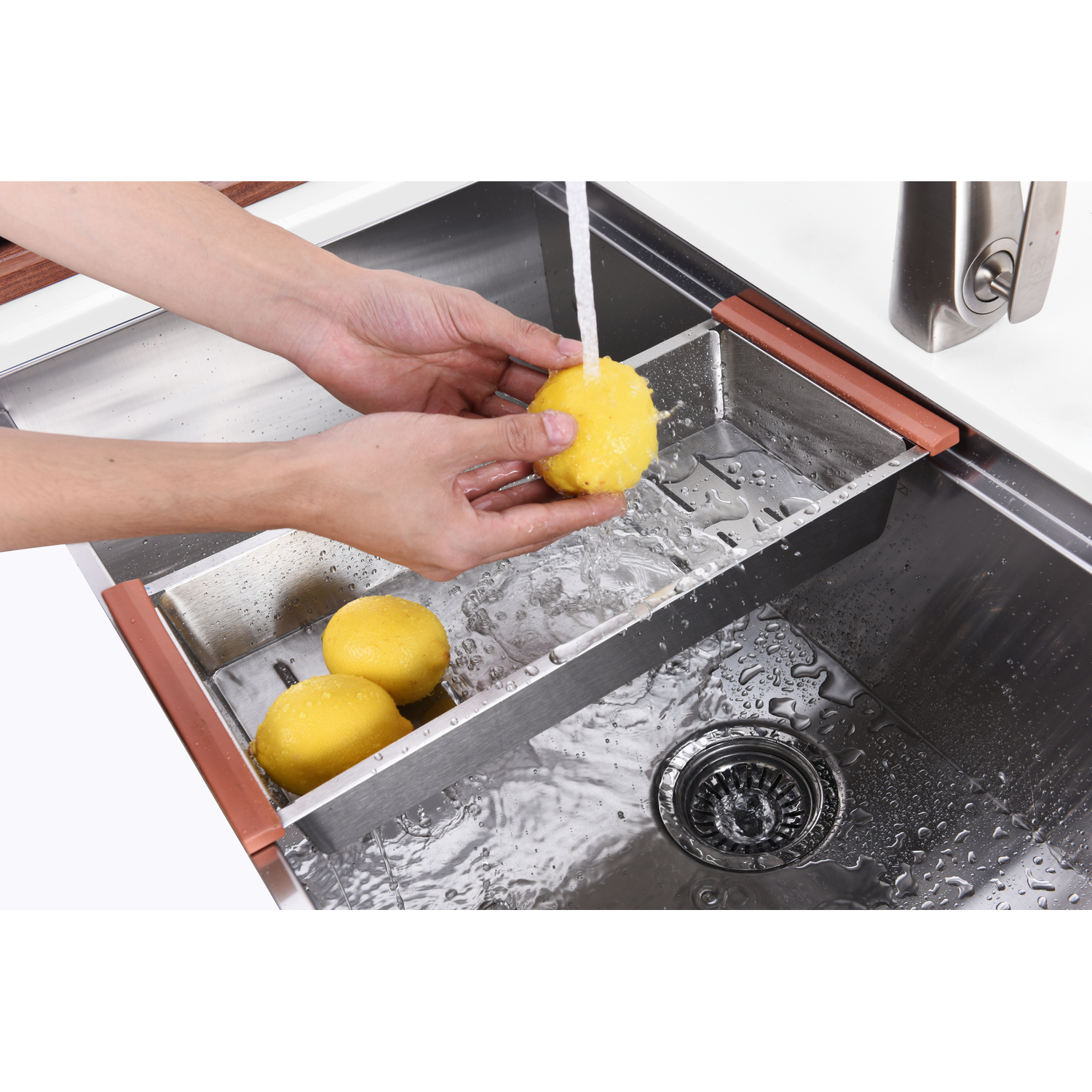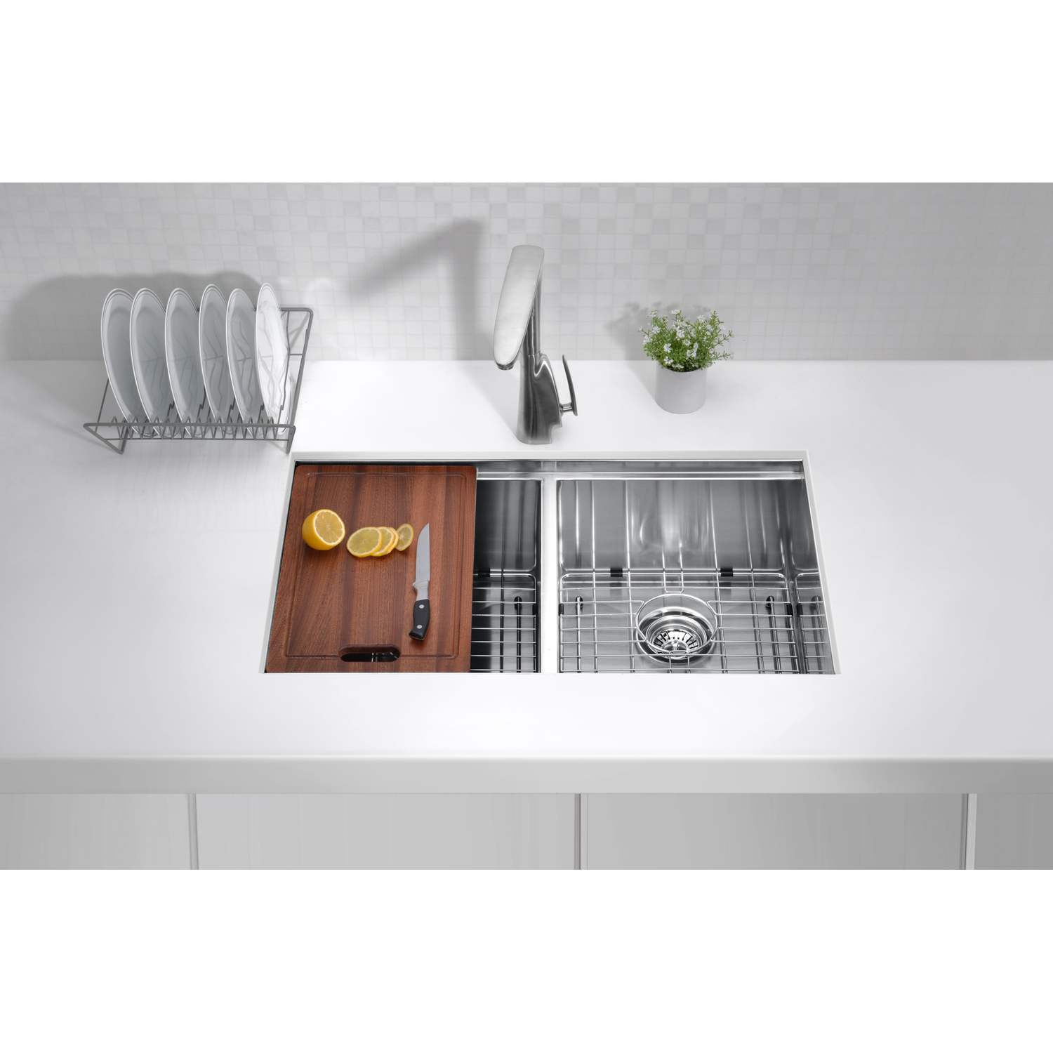 - Includes: hanging colander, chopping board, drain strainer, mounting hardware, and rough-in template