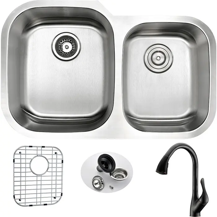 ANZZI presents the 32 in. MOORE SERIES precision pressed under mount kitchen sink. Representing the latest in modern home fixture designs and traditional European crafting technique this stunning display of artistry is pressed and shaped to perfection using RHINO ALLOY certified 16-Gauge 304 stainless steel. Only ANZZI precision pressed kitchen sinks utilize RHINO ALLOY certified materials for superior strength and quality. The cavernous 60/40 deep soaking dual basin will comfortably accommodate the largest dish loads including pots, pans and more. And every ANZZI sink features extra-large Echo-STOP sound dampening pads and a layer of protective composite coating to further quiet noise and prevent condensation. We have paired this sink with the ANZZI Accent Kitchen Sink Faucet. Each ANZZI faucet has been certified as Water Sense approved with solid brass construction and valve included. Well defined diversion lines ensure quick and total water drainage and the subtly curved corners allow of easier cleaning. ANZZI carries a proud tradition of crafting long lasting, quality home fixtures. With ANZZI perfection is our tradition.