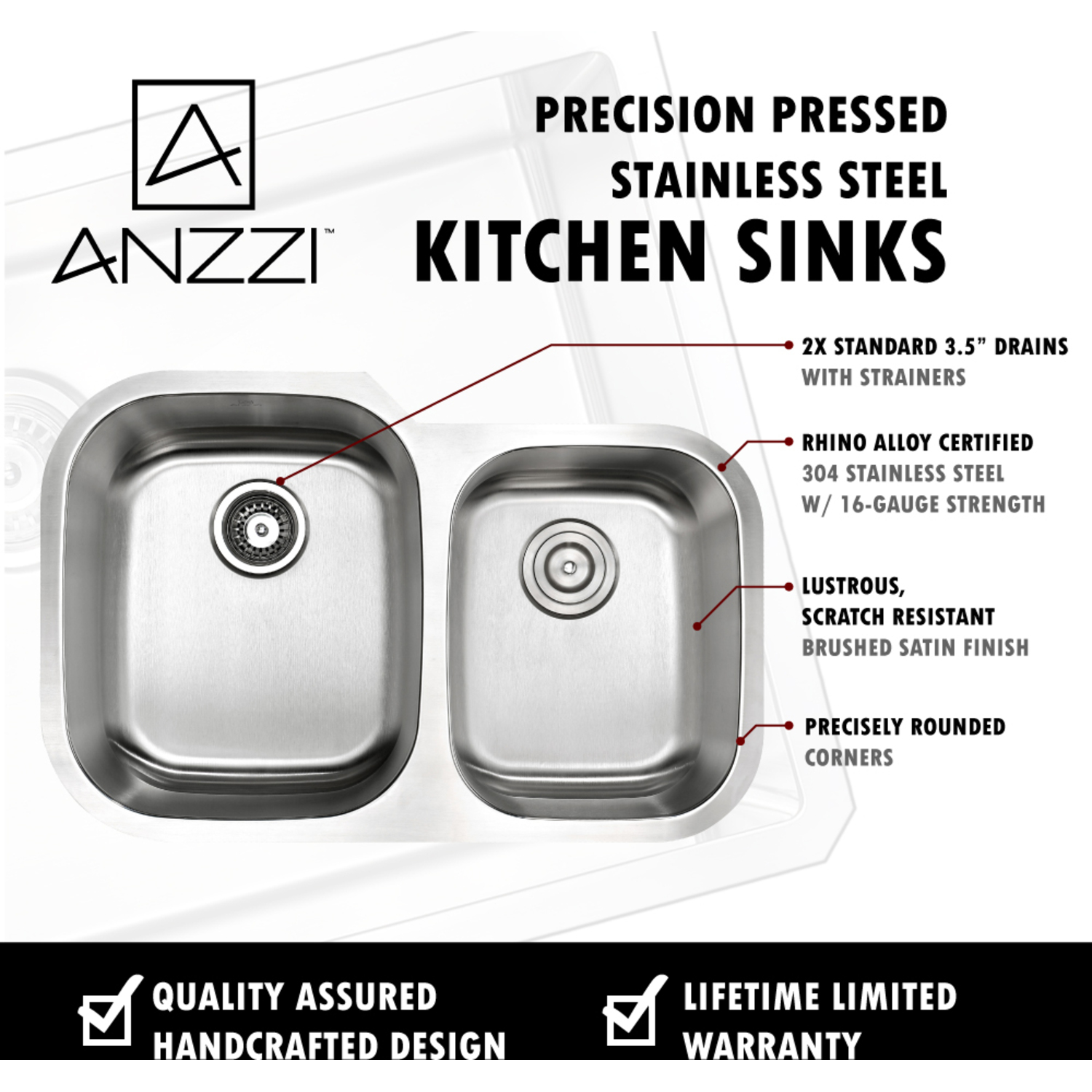 Dual deep soak basin opening with 60/40 splitANZZI Accent kitchen sink faucet KF-AZ031ORBANZZI Echo-STOP sound absorbing technology drastically reduces noiseTriple coated underside shielding prevents condensationDimensions: 32 in. L x 20.75 in. W x 9 in. H (Basin Depth: 9 in.)Minimum Cabinet Space: 36 in.Standard 3.5 in. drain openingGentle bowing base design makes for more efficient water drainageHigh tolerance machine pressed precisionRHINO ALLOY certified 304 Stainless Steel with 16 gauge strengthcUPC certifiedLustrous Satin finishIncludes perfect fitting strainer and drain assembly, insert strainer basket, mounting hardwareShips from factory within 24 hours once order is processed