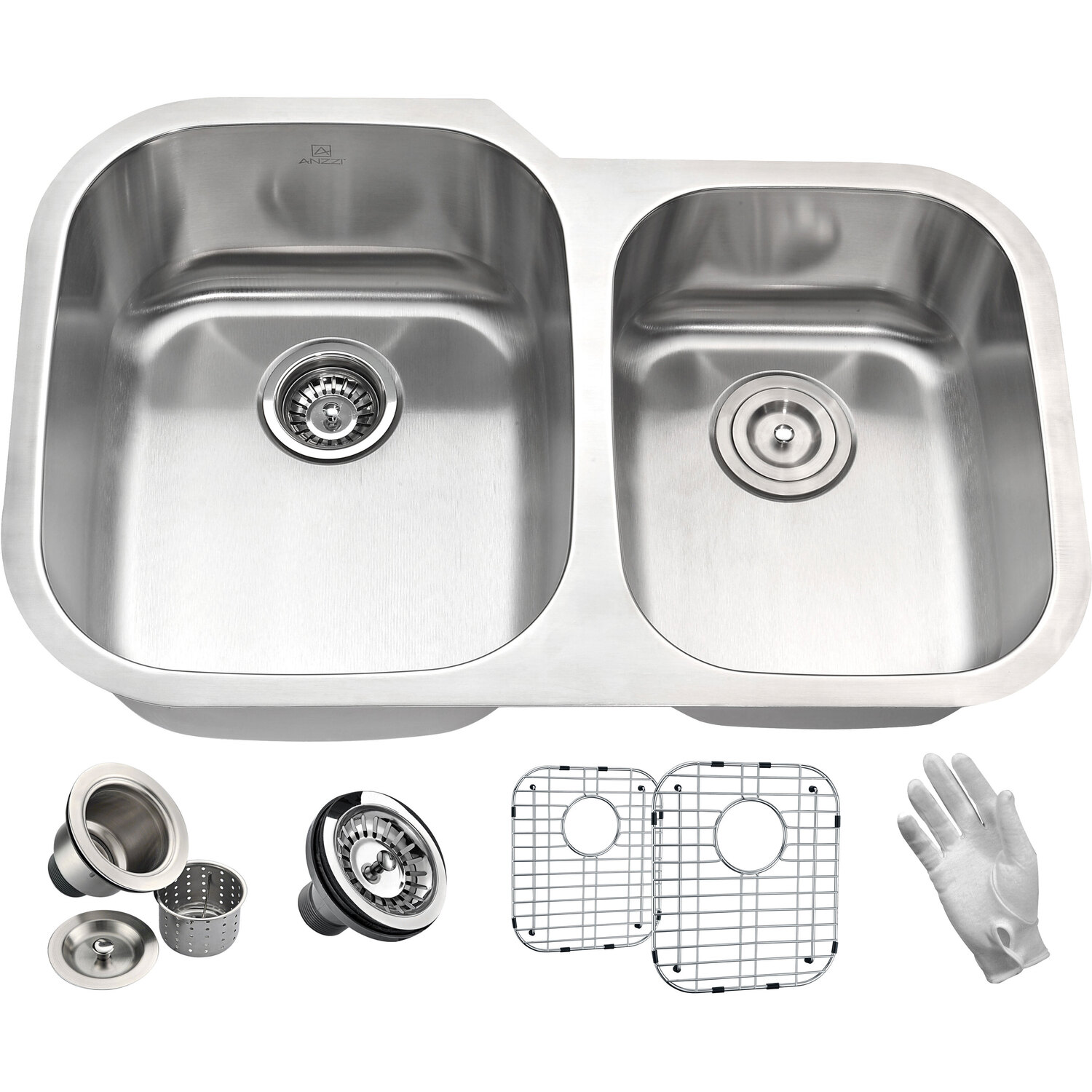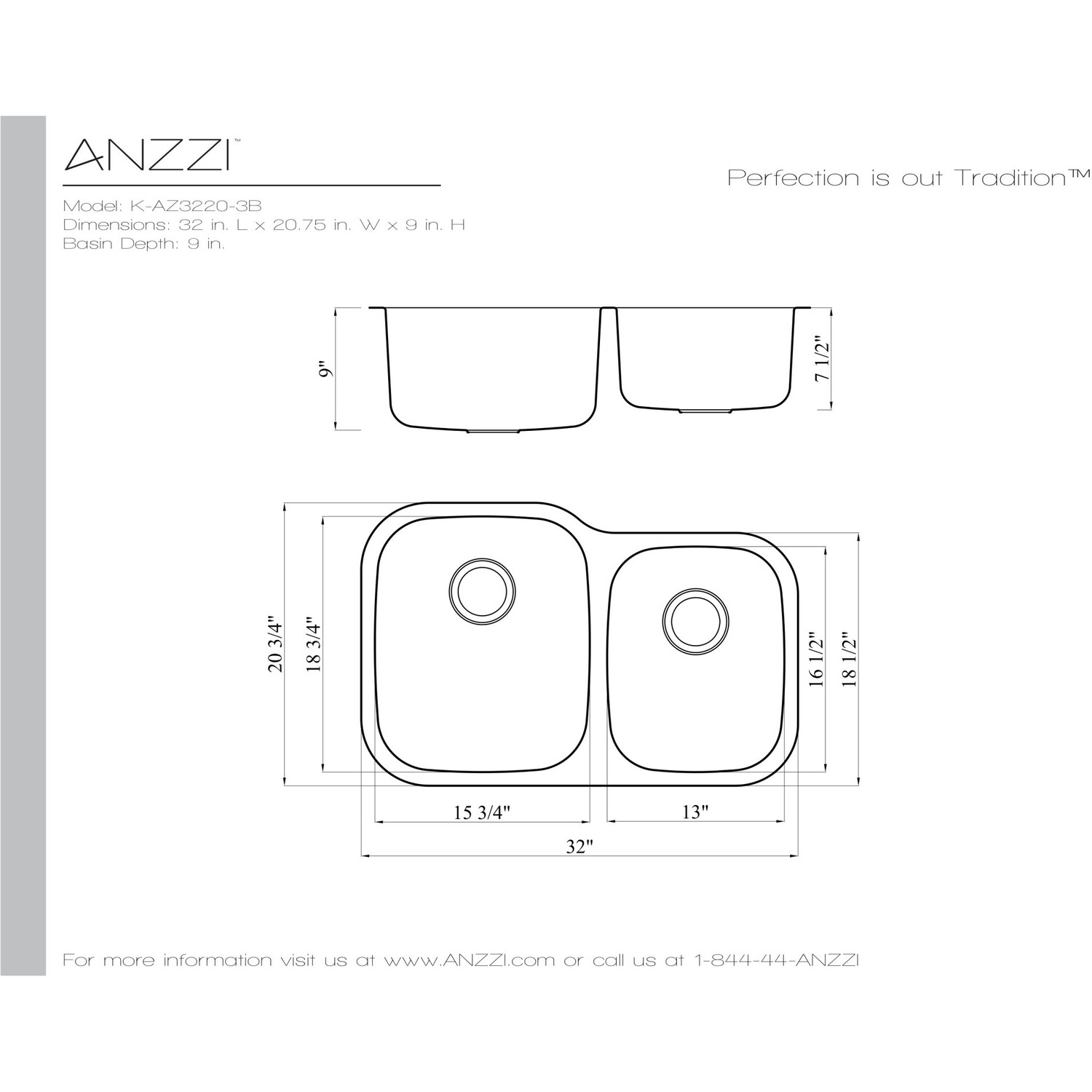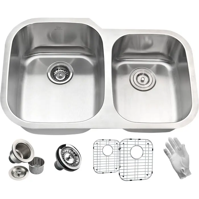 Dual Deep Soak basin opening with 60/40 splitANZZI Echo-STOP sound absorbing technology drastically reduces noise and are among the largest pads available in the marketTriple coated underside shielding prevents condensationDimensions: 32 in. L x 20.75 in. W x 9 in. H (Basin Depth: 9 in.)Minimum Cabinet Space: 36 in.Standard 3.5 in. drain openingGentle bowing base design makes for more efficient water drainageHigh tolerance machine pressed precisionRHINO ALLOY certified 304 Stainless Steel with 16 gauge strengthLustrous Satin finishIncludes perfect fitting strainer and drain assembly, insert strainer basket, mounting hardwareShips from factory within 24 hours once order is processedLifetime WarrantyTo speak to a knowledgeable and dedicated ANZZI specialist simply call 1-844-44-ANZZI or visit us on the web at www.ANZZI.com