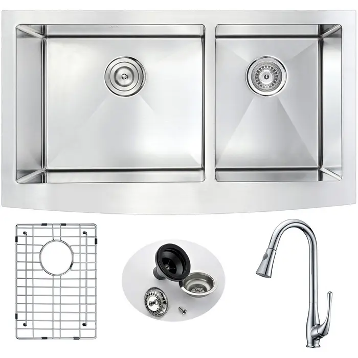 ANZZI presents the 33 in. ELYSIAN SERIES hand crafted farmhouse kitchen sink. Representing the latest in modern home fixture designs and traditional European crafting technique this stunning display of artistry is hand shaped to perfection using RHINO ALLOY certified 18-Gauge 304 stainless steel. Only ANZZI hand crafted farmhouse kitchen sinks utilize RHINO ALLOY certified materials for superior strength and quality. The cavernous 60/40 deep soaking dual basin will comfortably accommodate the largest dish loads including pots, pans and more. And every ANZZI sink features extra-large Echo-STOP sound dampening pads and a layer of protective composite coating to further quiet noise and prevent condensation. We have paired this sink with the ANZZI Singer Kitchen Sink Faucet. Each ANZZI faucet has been certified as Water Sense approved with solid brass construction and valve included. Well defined diversion lines ensure quick and total water drainage and the subtly curved corners allow of easier cleaning. ANZZI carries a proud tradition of crafting long lasting, quality home fixtures. With ANZZI perfection is our tradition.