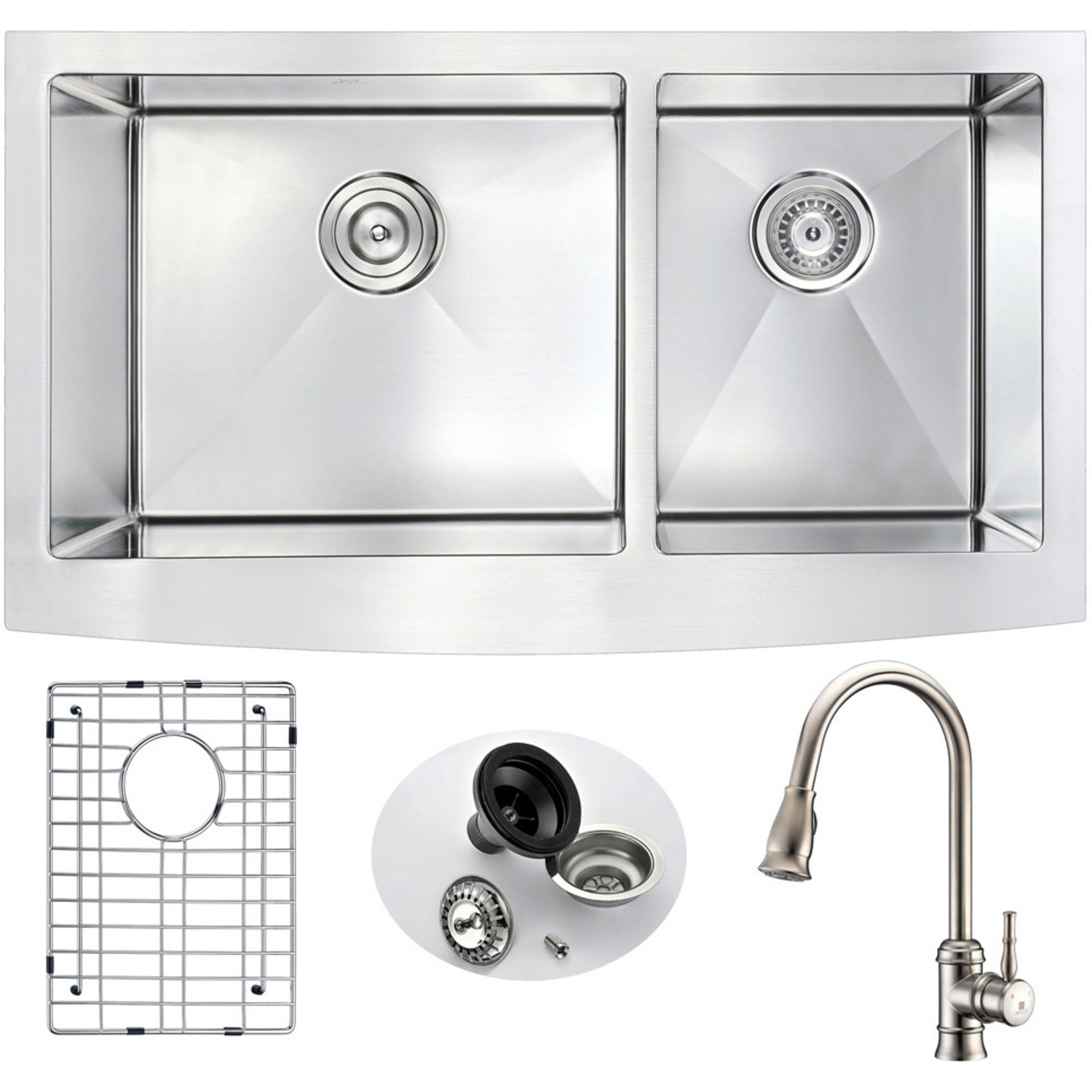 Anzzi Elysian Farmhouse 33 in. Double Bowl Kitchen Sink with Sails Faucet in Brushed Nickel, 848308081952, KAZ3320-130