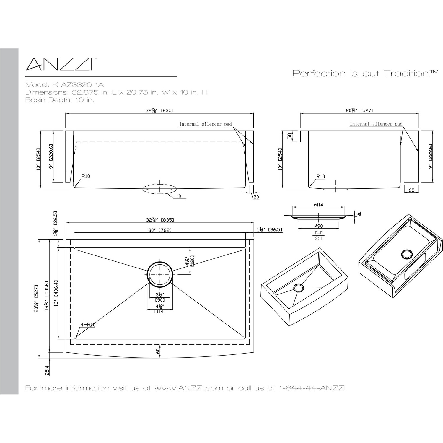 Single Deep Soak basin openingANZZI Echo-STOP sound absorbing technology drastically reduces noise and are among the largest pads available in the marketTriple coated underside shielding prevents condensationDimensions: 32.875 in. L x 20.75 in. W x 10 in. H (Basin Depth: 10 in.)Minimum Cabinet Space: 33 in.Standard 3.5 in. drain openingLaser precise diverting lines allow for more efficient water drainageQuality assured handmade constructionRHINO ALLOY certified 304 Stainless Steel with 16 gauge strengthcUPC certifiedLustrous Satin finishIncludes perfect fitting strainer and drain assembly, insert strainer basket, mounting hardwareShips from factory within 24 hours once order is processedLifetime Warranty