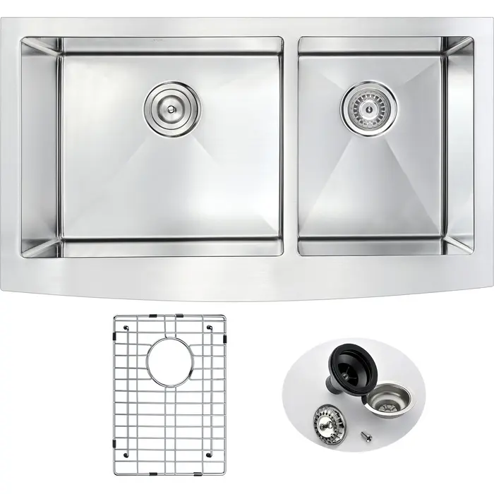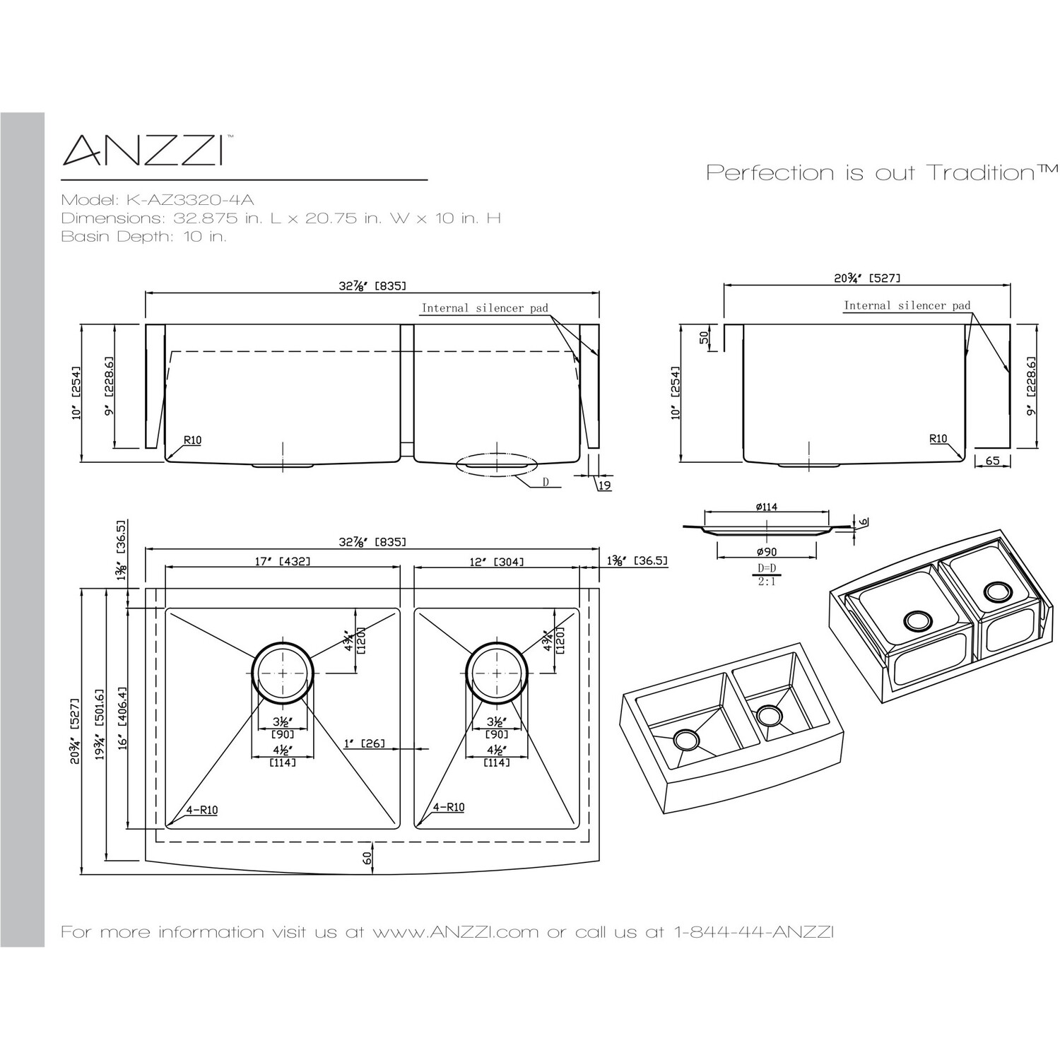 Dual Deep Soak basin opening 60/40 splitANZZI Echo-STOP sound absorbing technology drastically reduces noise and are among the largest pads available in the marketTriple coated underside shielding prevents condensationDimensions: 32.875 in. L x 20.75 in. W x 10 in. H (Basin Depth: 10 in.)Minimum Cabinet Space: 33 in.Standard 3.5 in. drain openingLaser precise diverting lines allow for more efficient water drainageQuality assured handmade constructionRHINO ALLOY certified 304 Stainless Steel with 18 gauge strengthcUPC certifiedLustrous Satin finishIncludes perfect fitting strainer and drain assembly, insert strainer basket, mounting hardwareShips from factory within 24 hours once order is processedLifetime Warranty