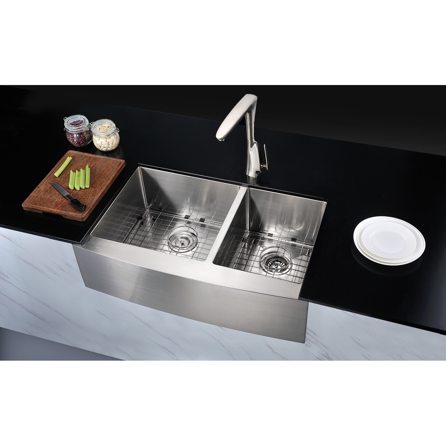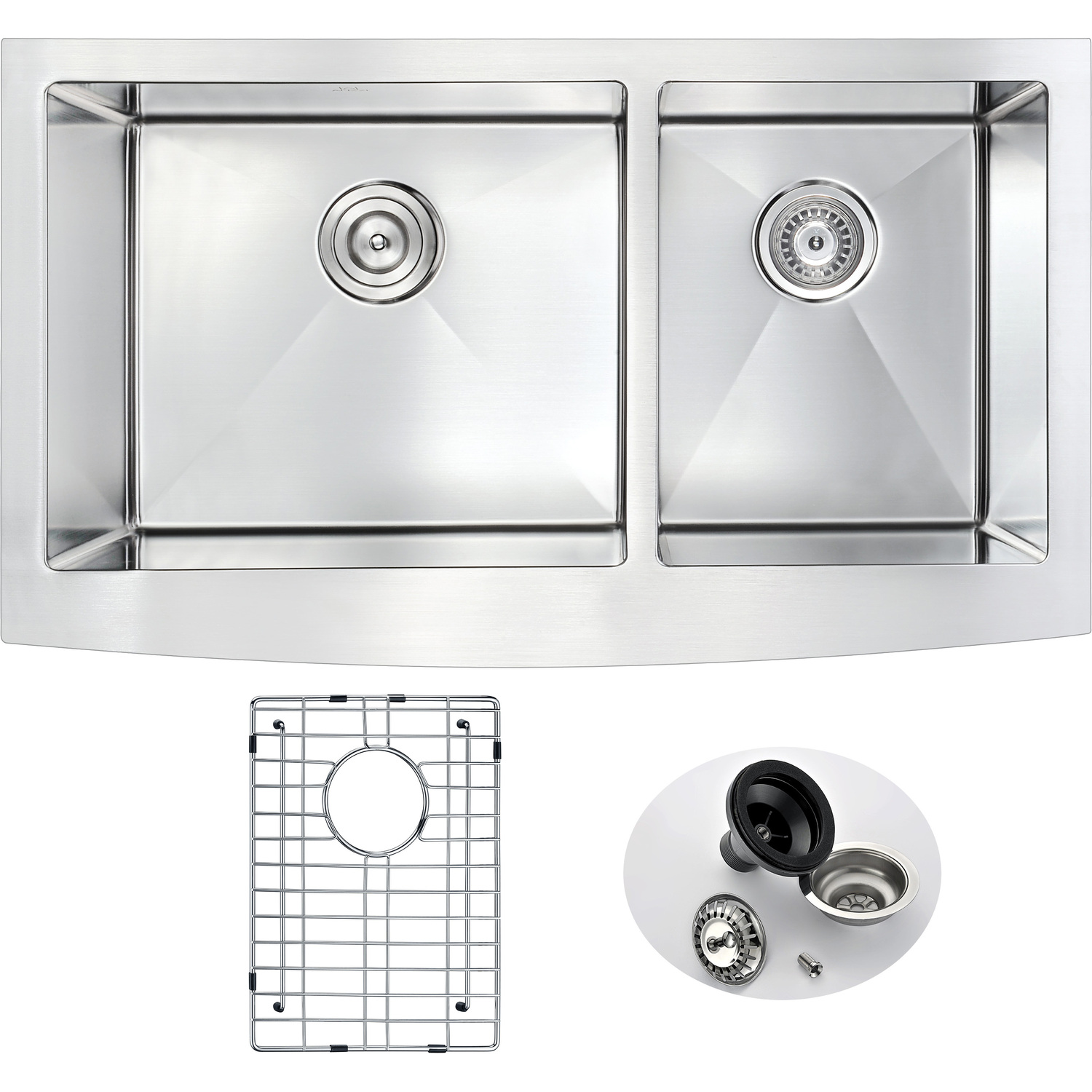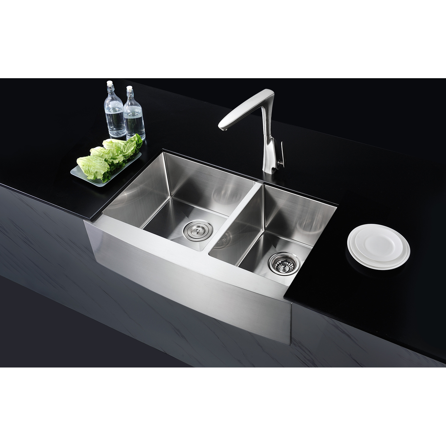 Anzzi Elysian Farmhouse Stainless Steel 33 in. 0-Hole 60/40 Double Bowl Kitchen Sink in Brushed Satin, 848308073544, K-AZ3320-4A