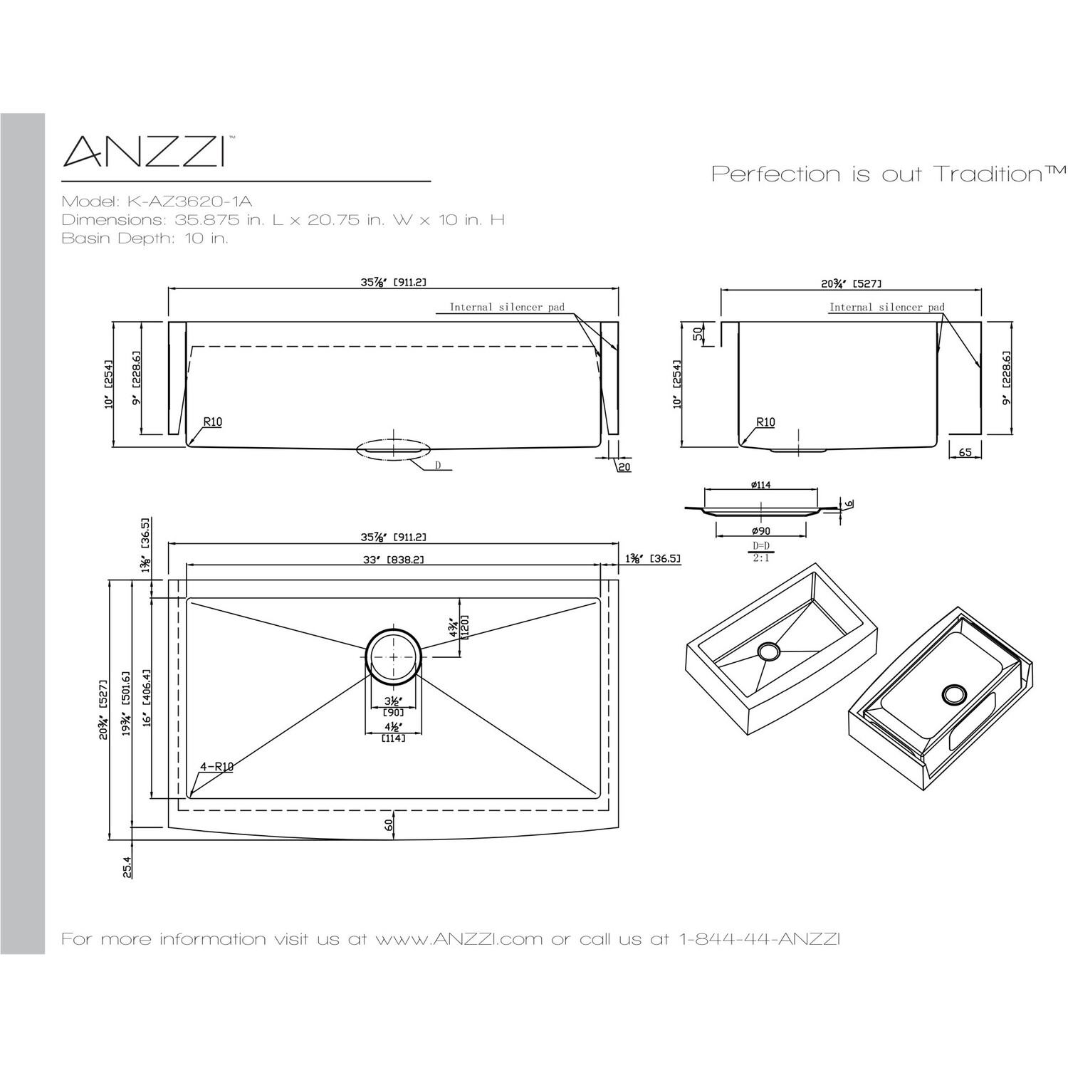 Single Deep Soak basin openingANZZI Echo-STOP sound absorbing technology drastically reduces noise and are among the largest pads available in the marketTriple coated underside shielding prevents condensationDimensions: 35.875 in. L x 20.75 in. W x 10 in. H (Basin Depth: 10 in.)Minimum Cabinet Space: 36 in.Standard 3.5 in. drain openingLaser precise diverting lines allow for more efficient water drainageQuality assured handmade constructionRHINO ALLOY certified 304 Stainless Steel with 18 gauge strengthcUPC certifiedLustrous Satin finishIncludes perfect fitting strainer and drain assembly, insert strainer basket, mounting hardwareShips from factory within 24 hours once order is processedLifetime Warranty