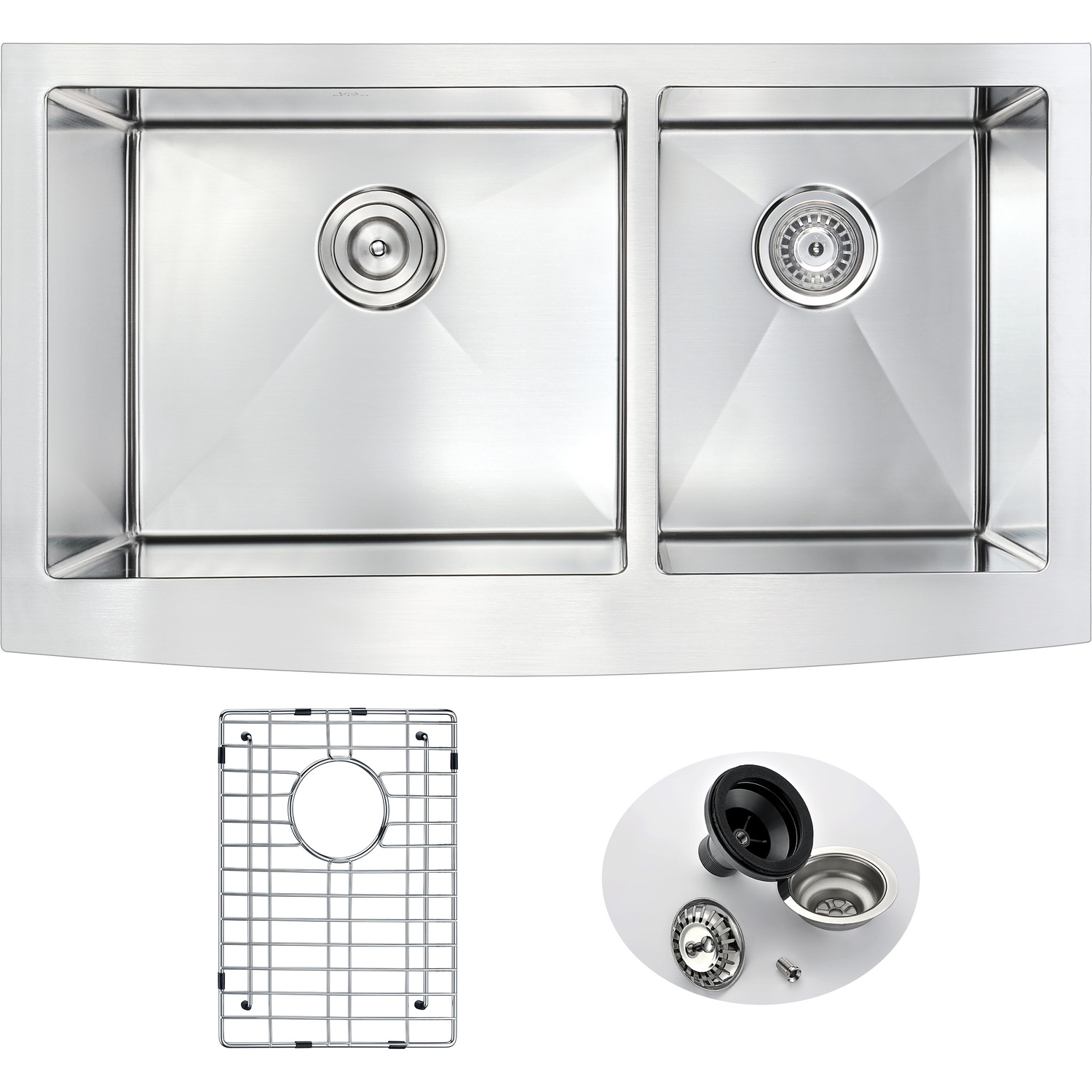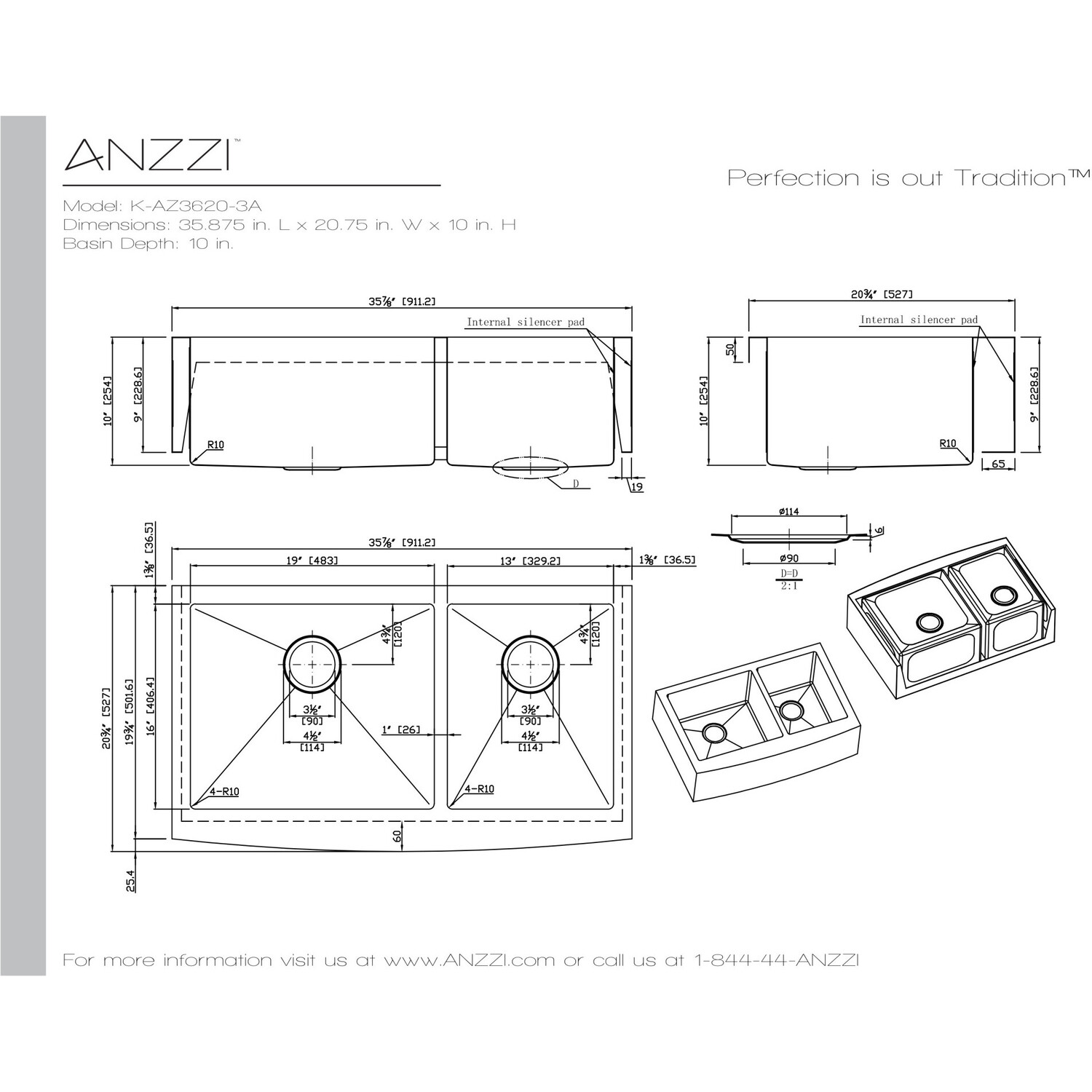 Dual Deep Soak basin opening with 60/40 splitANZZI Echo-STOP sound absorbing technology drastically reduces noise and are among the largest pads available in the marketTriple coated underside shielding prevents condensationDimensions: 35.875 in. L x 20.75 in. W x 10 in. H (Basin Depth: 10 in.)Minimum Cabinet Space: 36 in.Standard 3.5 in. drain openingLaser precise diverting lines allow for more efficient water drainageQuality assured handmade constructionRHINO ALLOY certified 304 Stainless Steel with 18 gauge strengthcUPC certifiedLustrous Satin finishIncludes perfect fitting strainer and drain assembly, insert strainer basket, mounting hardwareShips from factory within 24 hours once order is processedLifetime Warranty