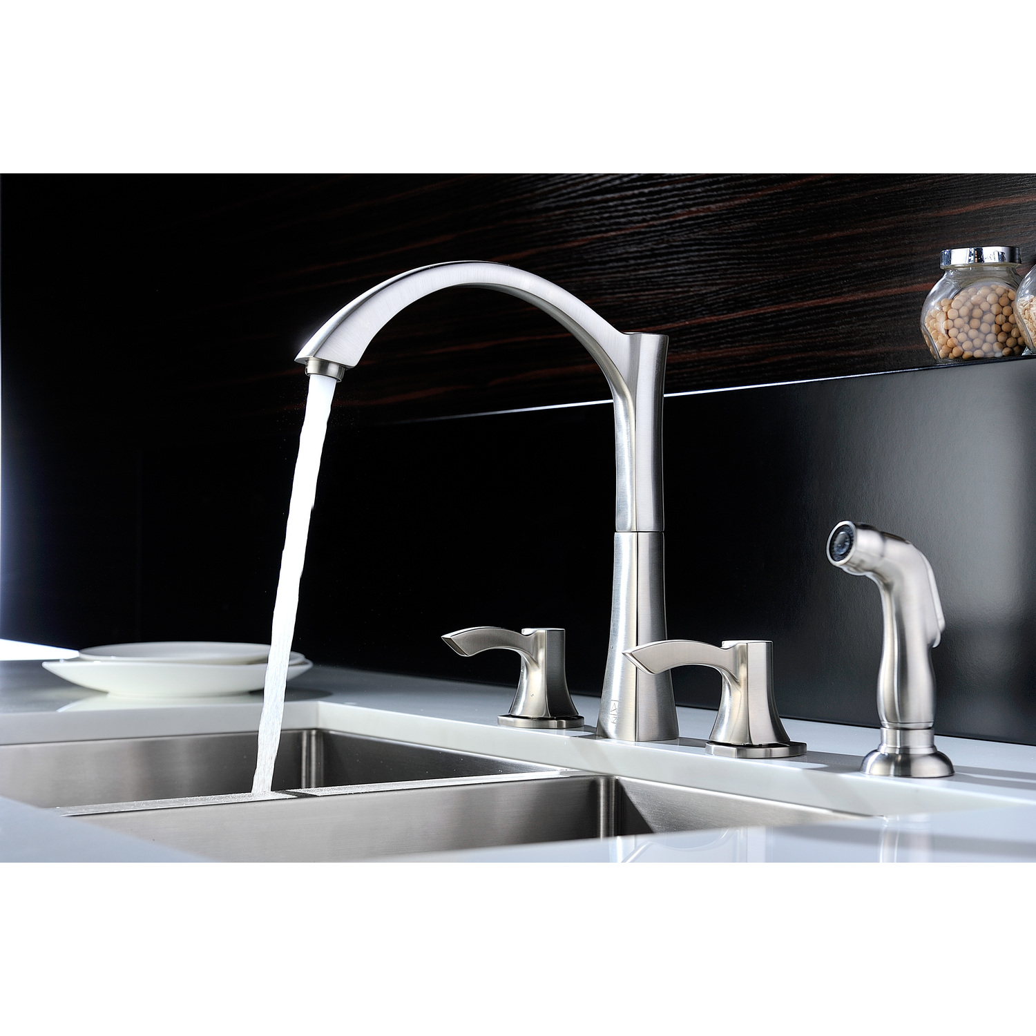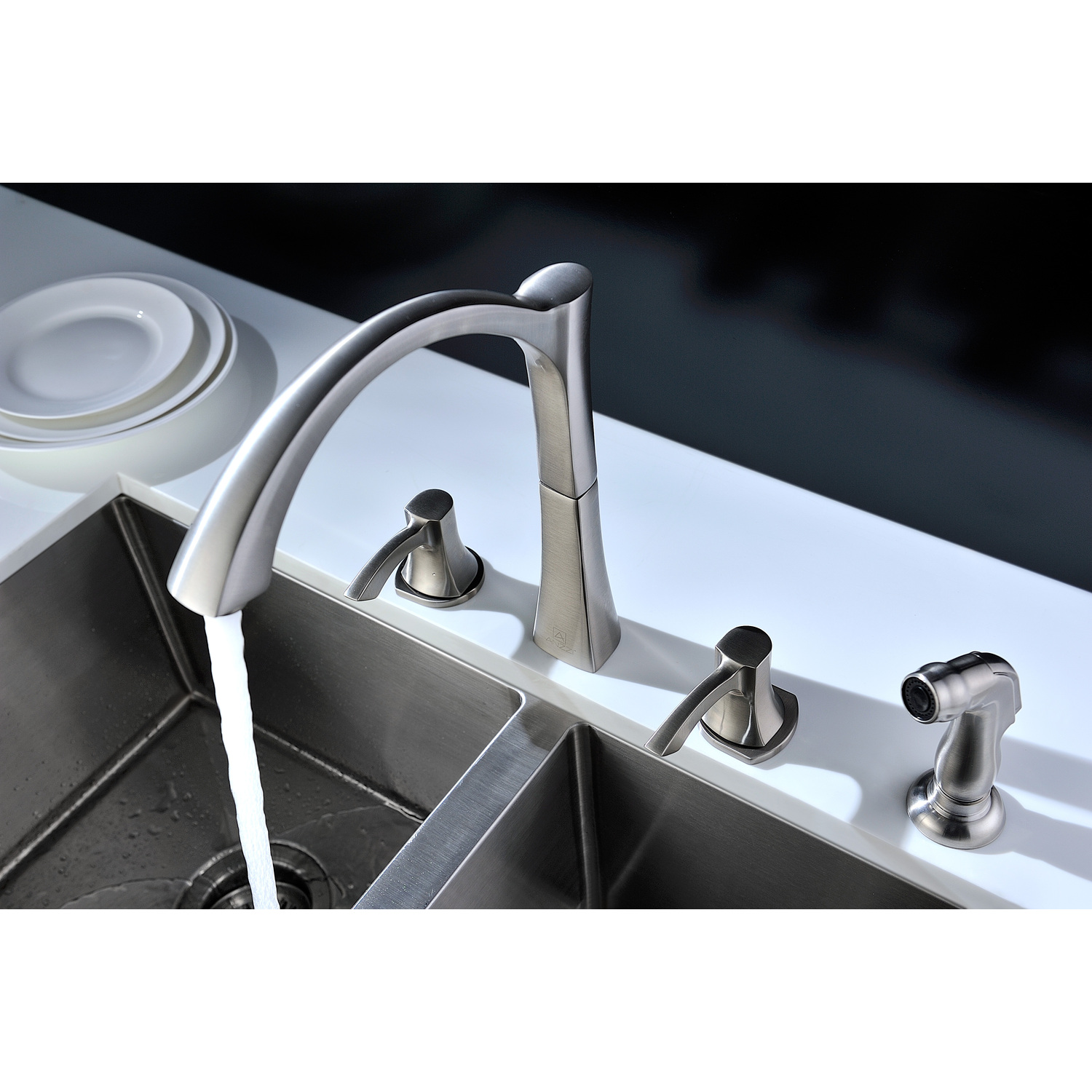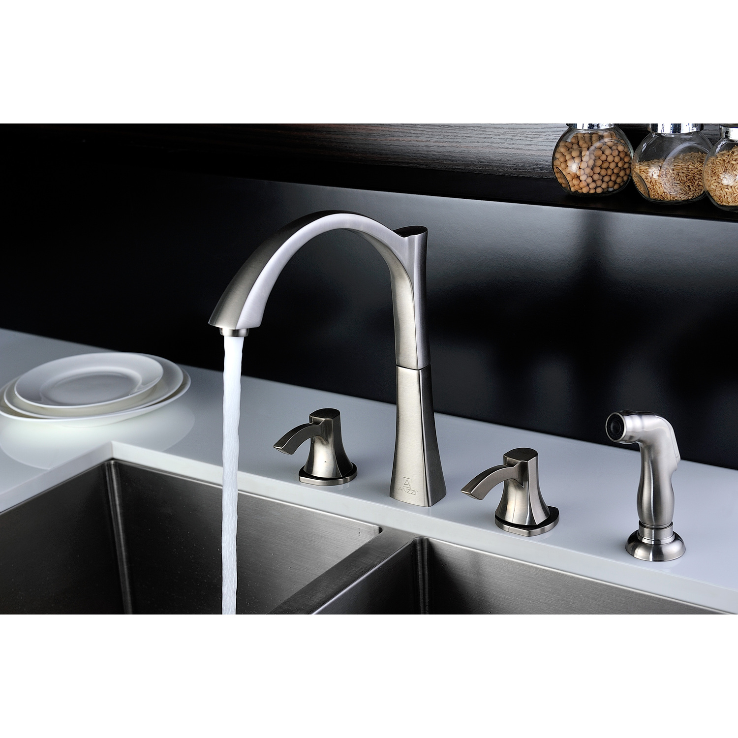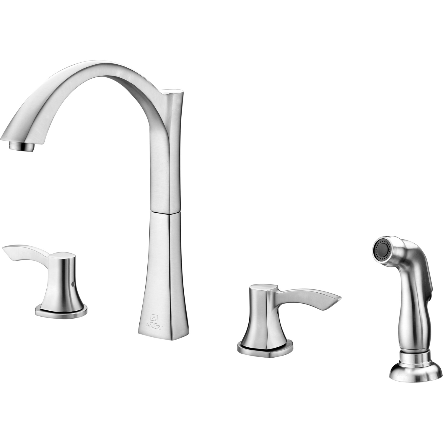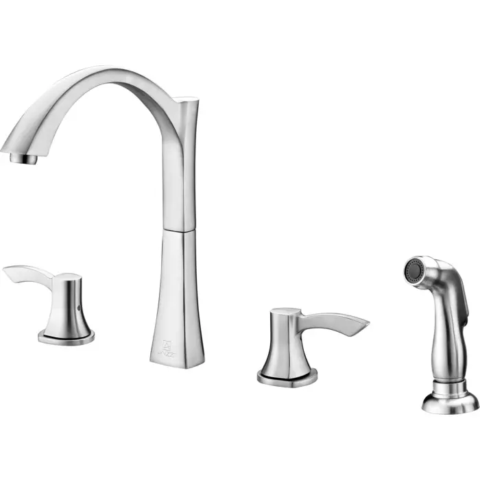 Traditional Brushed Nickel finishRHINO ALLOY certified lead-free solid brass with rust resistant finishTwin dual (2) lever handle controlElegantly arching spout inspired by the latest European stylesComplete motion 360 degree turning spoutValve includedANZZI Euro-grip sprayer with high quality low flow aeratorDeck mounted three (3) hole installationSpout Reach: 8.7 in.; Spout Height: 8.8 in.Flow Rate: 1.5 gpm flow ratecUPC, NSF, AB1953 certified and listed for North AmericaMarine grade quality ceramic disk valve includeShips from factory within 24 hours once order is processedLifetime Warranty