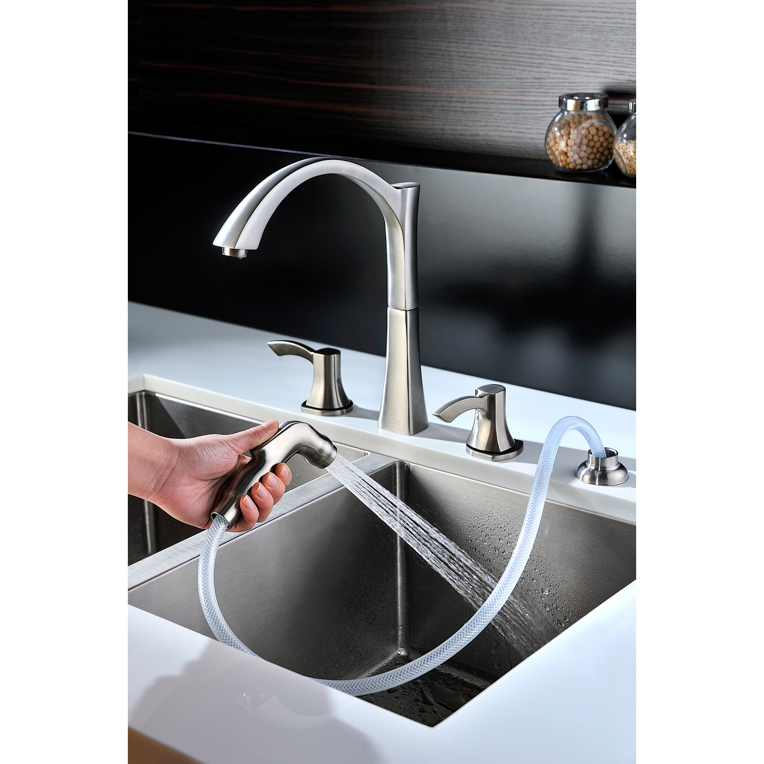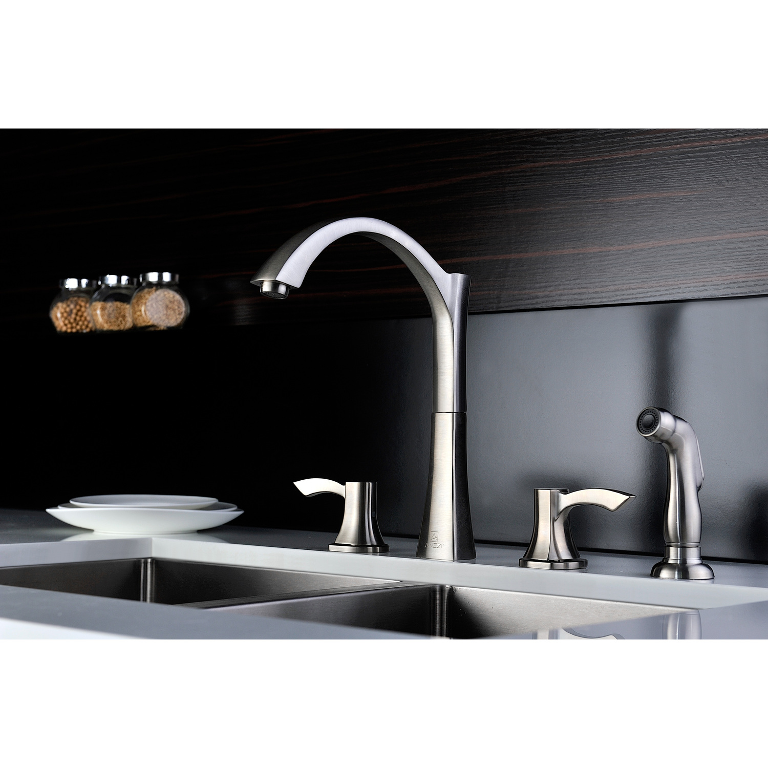 ANZZI is committed to introducing the latest in European bath fixture design to the North American home. ANZZI presents the Soave Series Dual Handle Kitchen Faucet with Pull Out Sprayer. Crafted using lead-free RHINO ALLOY certified brass as the interior and our Traditional Brushed Nickel rust resistant finish. This all metal combination of high quality materials ensures you will enjoy a flawlessly performing faucet for many years to come. The elegantly simple dual handle design allows for complete and easy control of both water flow and temperature while maintain the fine minimalist aesthetic to match with any modern or contemporary décor style. Additionally, the ANZZI Soave Series features a simple to use and easy to handle Euro-grip pull out sprayer offering the full range of motion needed for even the toughest washes. The ANZZI Soave Series is listed certified under cUPC / NSF / AB1953 for installation within North America.