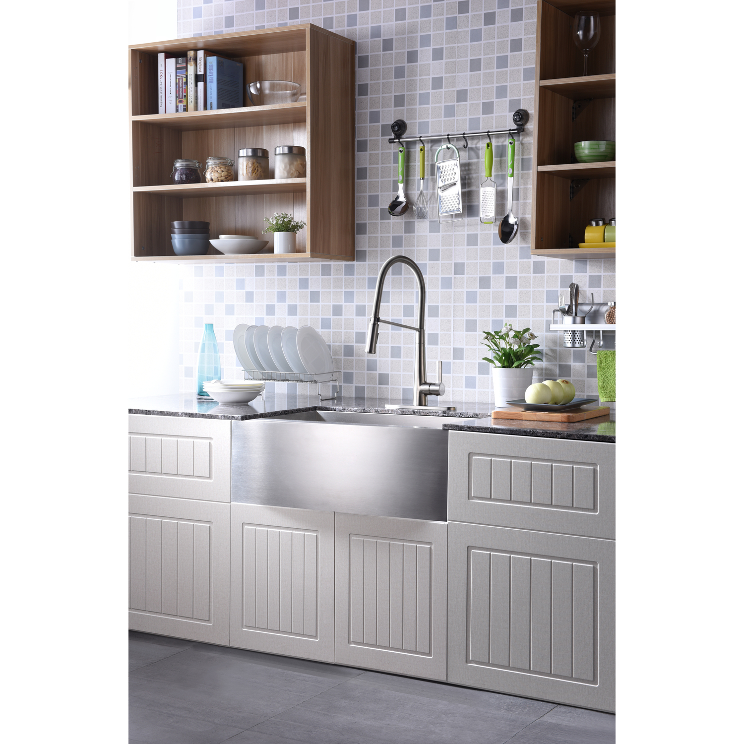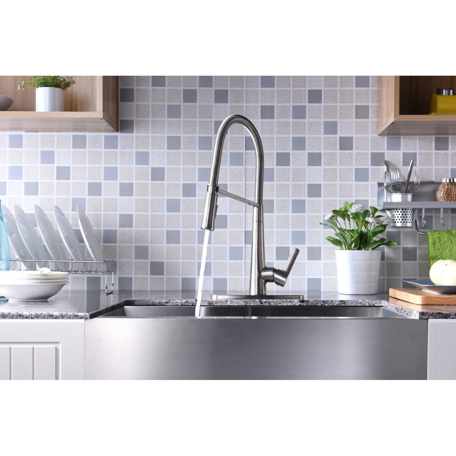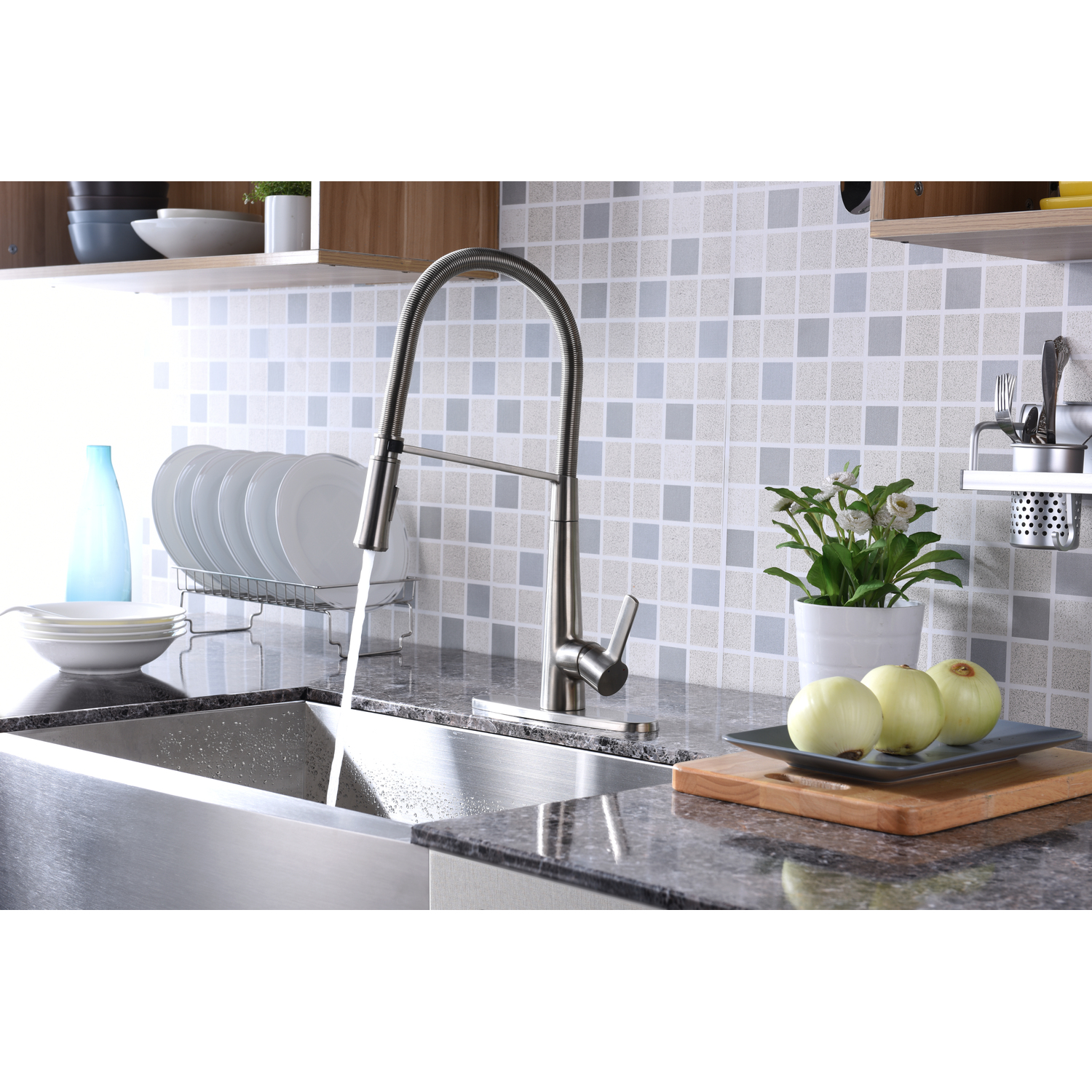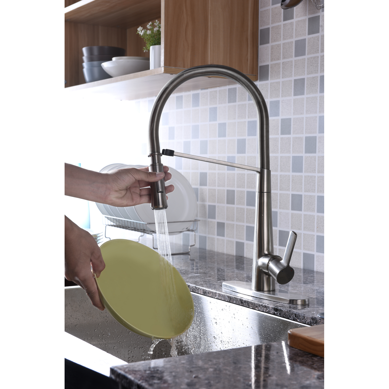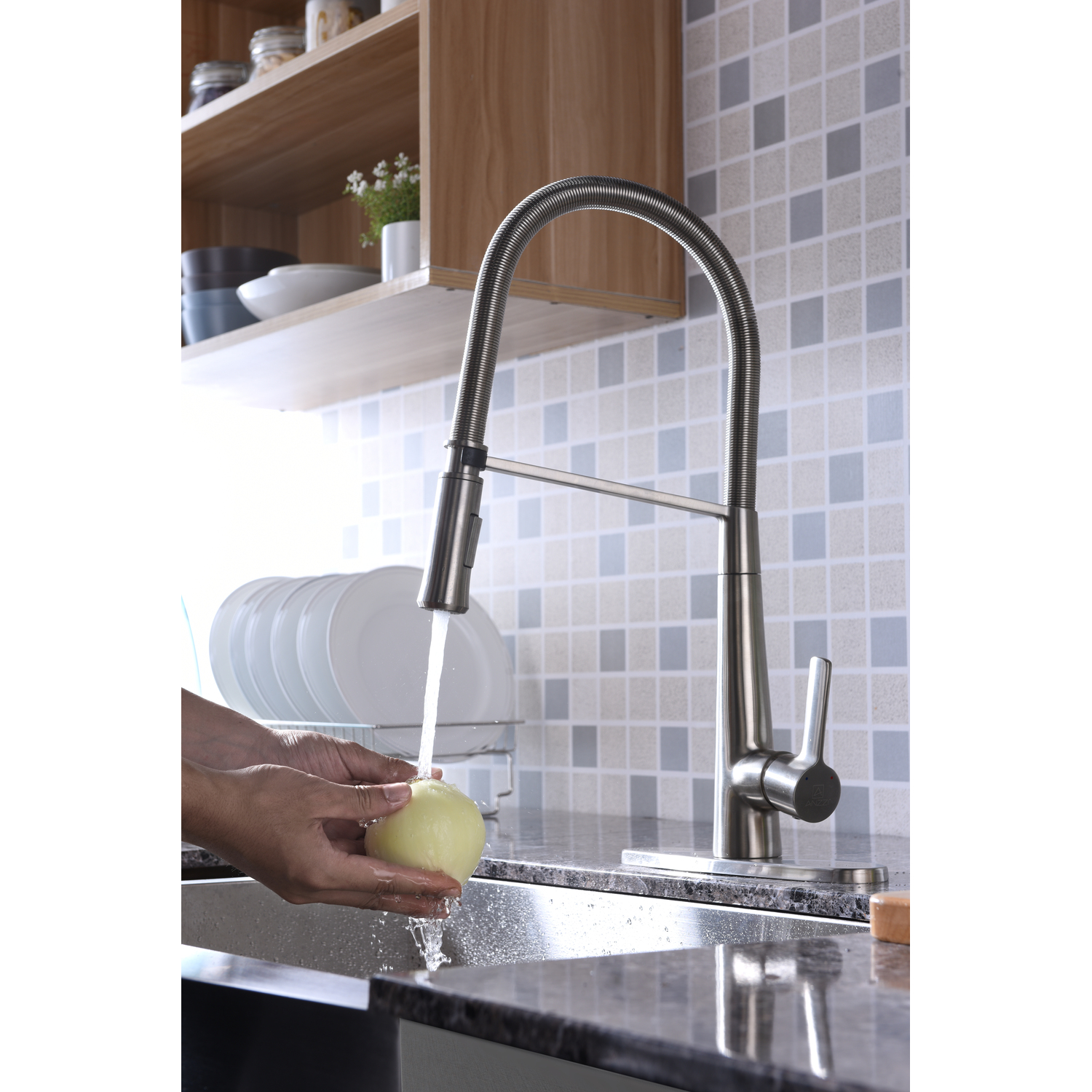 ANZZI presents the Apollo series pull down kitchen faucet encased with a stunning brushed nickel finish. ANZZI has built its reputation of creating the best kitchen faucets by using only high quality RHINO ALLOY certified parts, lead free brass valves and rust resistant exterior plating. The Apollo series kitchen sink faucets feature the ANZZI Euro-Grip pull down sprayer offering the full range of motion needed for even the toughest dish washing. The deceptively simple single handle design allows for complete and easy control of both water flow and temperature while keeping the gorgeous minimalist aesthetic intact. In our commitment to long lasting quality and design ANZZI has built a reputation for creating the most reliable design faucets for the kitchen and bath space.Euro-Grip pull down high mobility sprayerShips in 24 hoursLead free solid brass valve includedNSF, cUPC and AB1953 certifiedLimited lifetime warrantyDual spray settingsSpout height: 7.13" - spout reach 9.13"Single handle hot and cold water mixerRust and stain resistant brushed nickel finishTo speak to a knowledgeable and dedicated ANZZI specialist simply call 1-844-44-ANZZI or visit us on the web at www.ANZZI.com