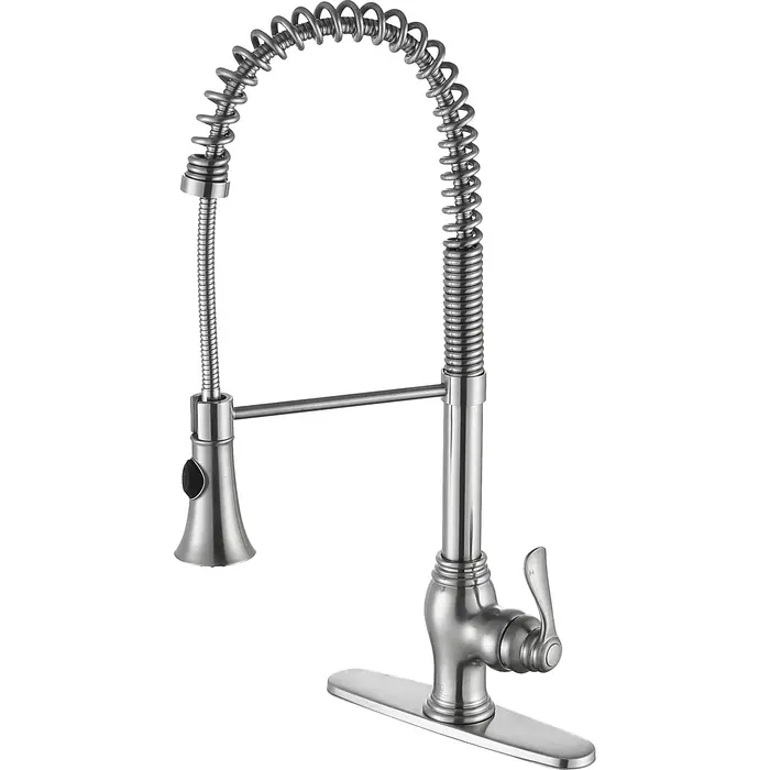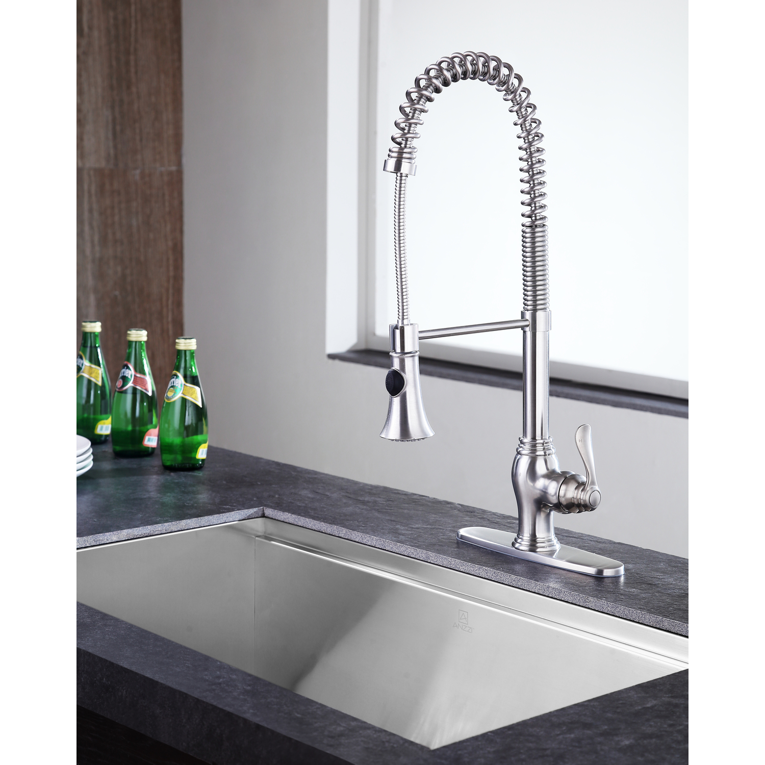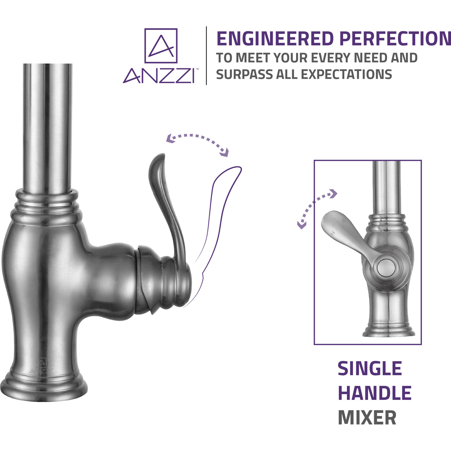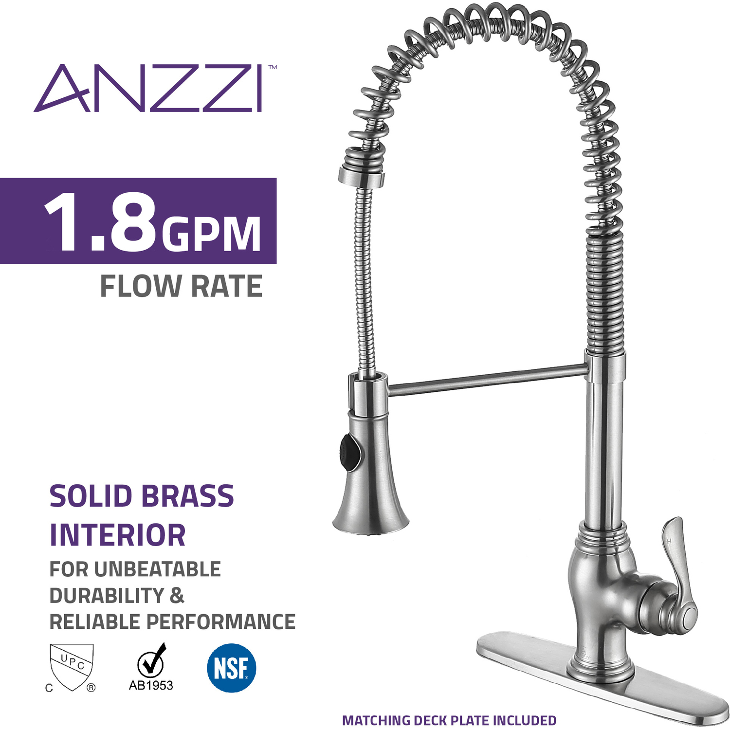 ANZZI is committed to introducing the latest in European bath fixture design to the North American home. ANZZI presents the Bastion single handle kitchen sink faucet. Crafted using RHINO ALLOY certified brass interior, marine grade ceramic disk and brushed nickel lead-free rust resistant finish. The elegance and style of our ANZZI faucets is matched by their proven performance and reliability. Which is why our faucets are backed by the ANZZI Limited Lifetime Warranty. Become a member of the ANZZI family and experience why Perfection is our Tradition.Stunning brushed nickel finishRHINO ALLOY certified lead-free solid brass with rust resistant finishSingle (1) handle operationSingle (1) hole installation; three (3) hole compatible with included deck platePull down sprayer with 12.3 in. reachMarine grade ceramic disk includedSpout reach: 7.87 in.; spout height: 6.69 in.Flow rate: 1.8 gpmConnection size: 3/8 in.cUPC, NSF, AB1953 and Watersense certifiedLimited lifetime warrantyShips from factory within 24 hours of orderTo speak to a knowledgeable and dedicated ANZZI specialist simply call 1-844-44-ANZZI or visit us on the web at www.ANZZI.com