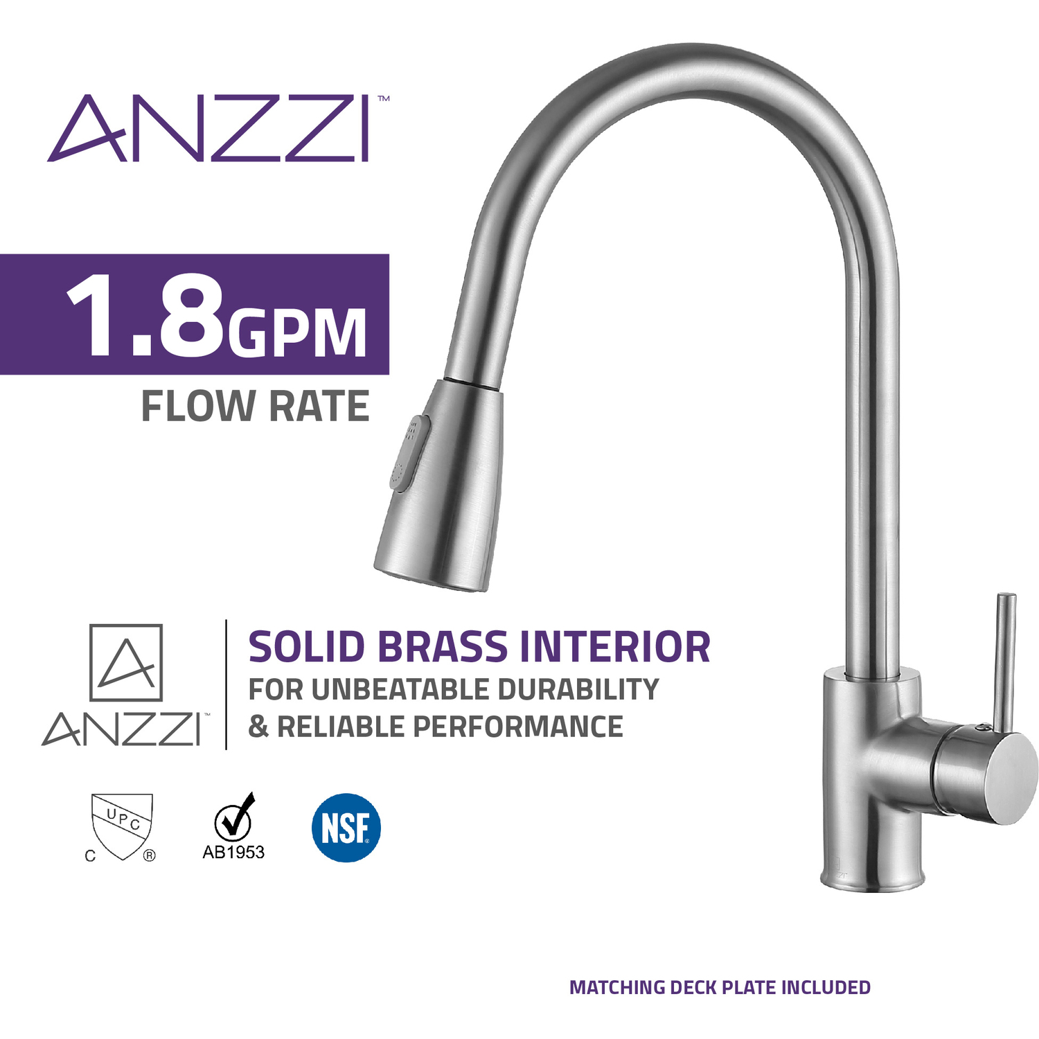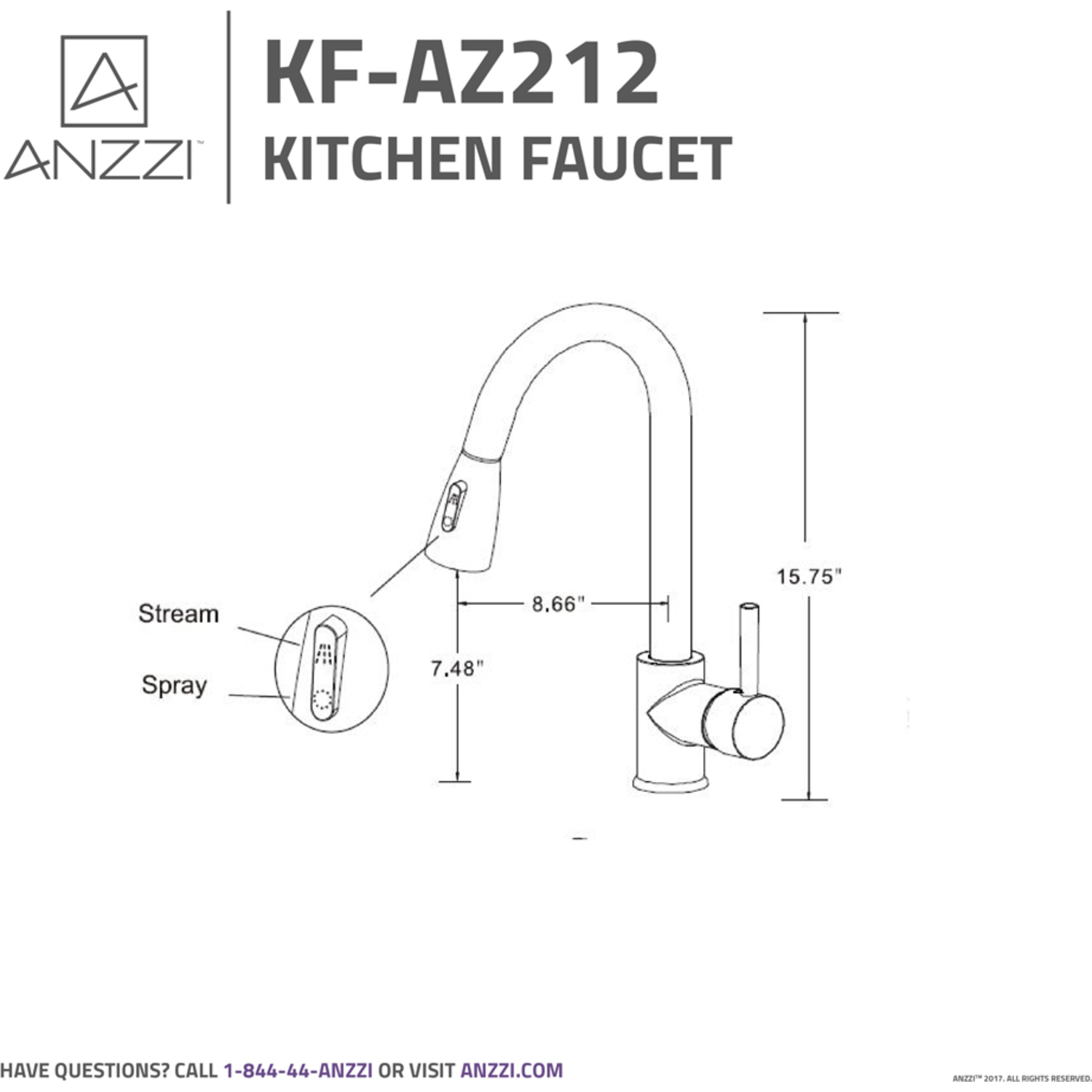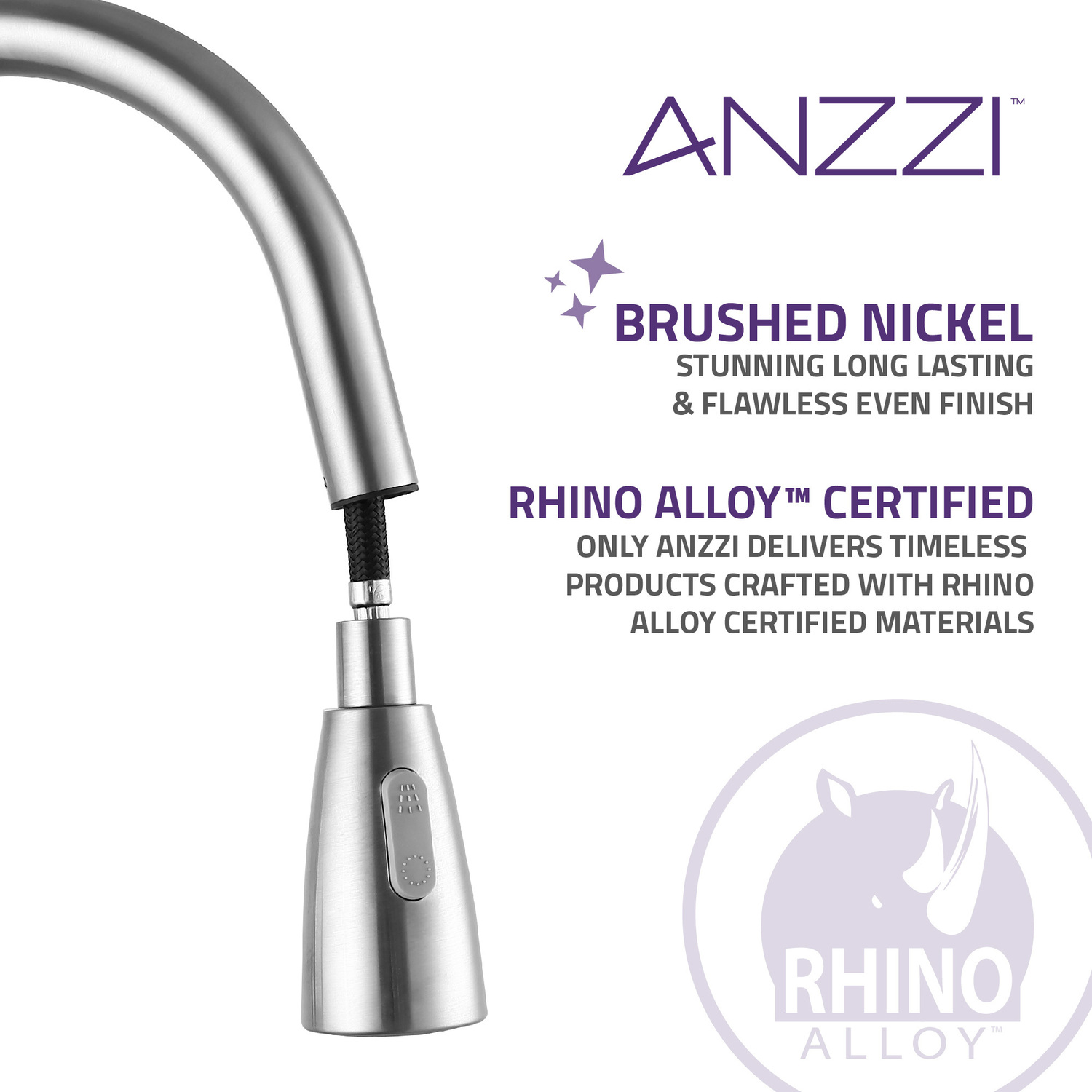ANZZI is committed to introducing the latest in European bath fixture design to the North American home. ANZZI presents the Sire single handle kitchen sink faucet. Crafted using RHINO ALLOY certified brass interior, marine grade ceramic disk and brushed nickel lead-free rust resistant finish. The elegance and style of our ANZZI faucets is matched by their proven performance and reliability. Which is why our faucets are backed by the ANZZI Limited Lifetime Warranty. Become a member of the ANZZI family and experience why Perfection is our Tradition.Stunning brushed nickel finishRHINO ALLOY certified lead-free solid brass with rust resistant finishSingle (1) handle operationSingle (1) hole installationPull out sprayer with 12.4 in. reachMarine grade ceramic disk includedSpout reach: 8.66 in.; spout height: 7.48 in.Flow rate: 1.8 gpmConnection size: 3/8 in.cUPC, NSF, AB1953 and Watersense certifiedLimited lifetime warrantyShips from factory within 24 hours of orderTo speak to a knowledgeable and dedicated ANZZI specialist simply call 1-844-44-ANZZI or visit us on the web at www.ANZZI.com