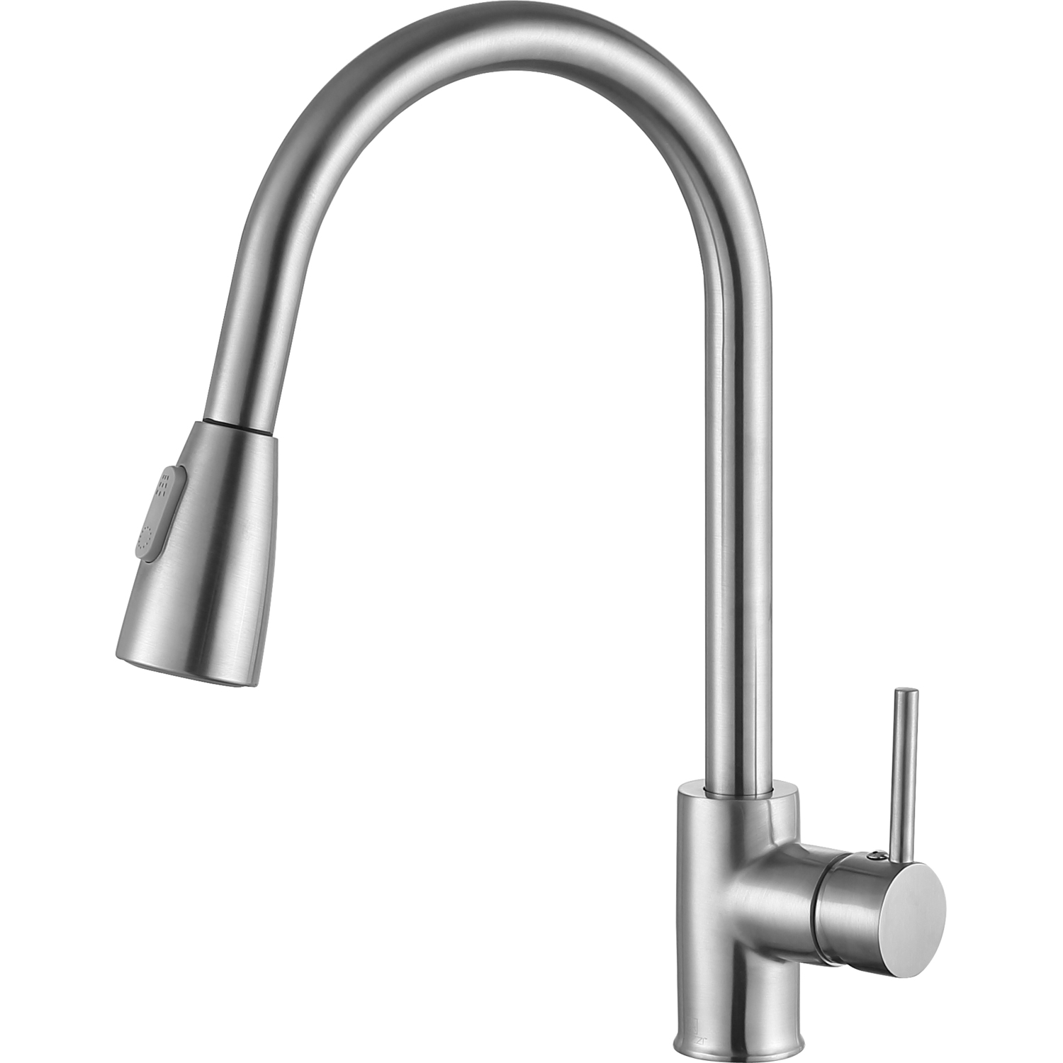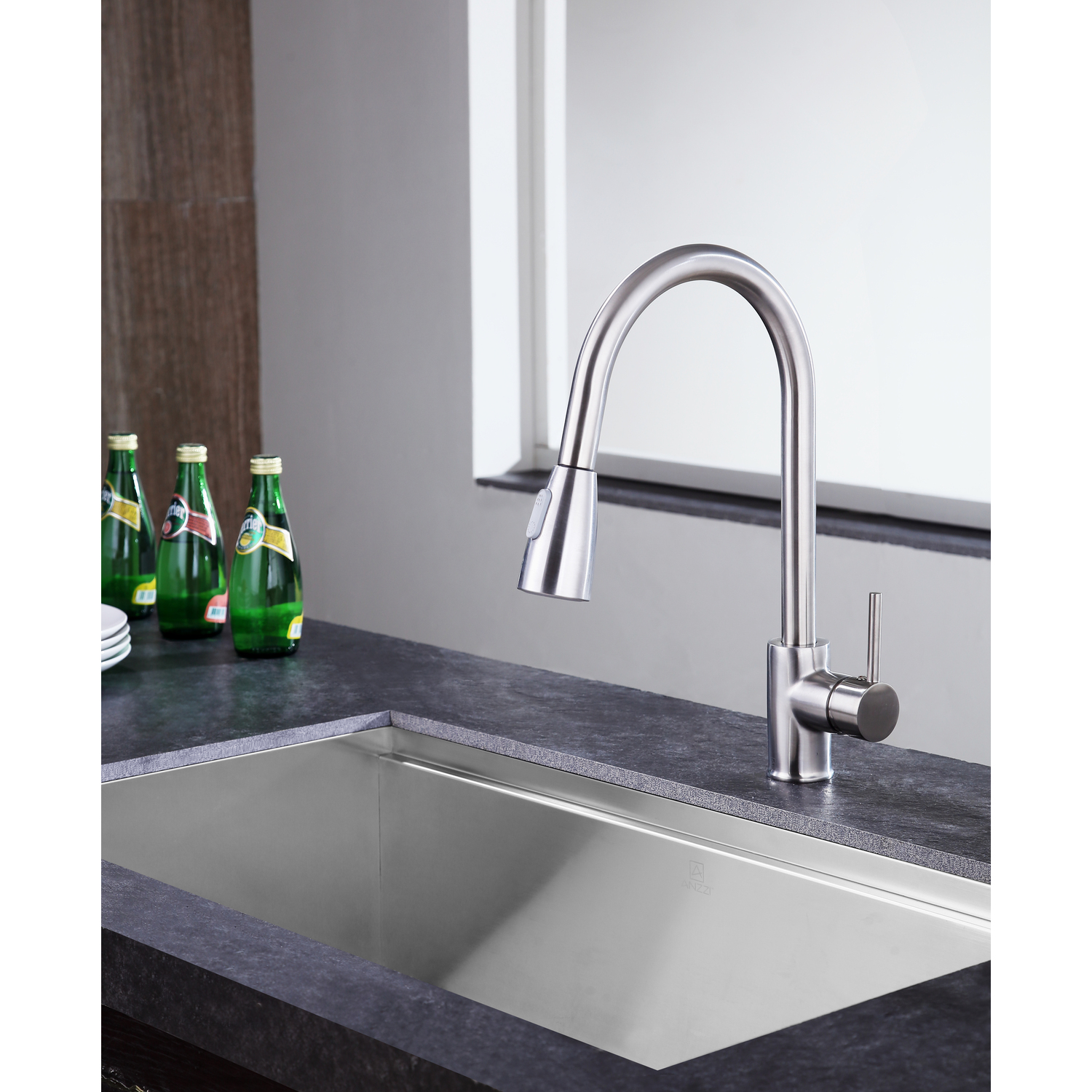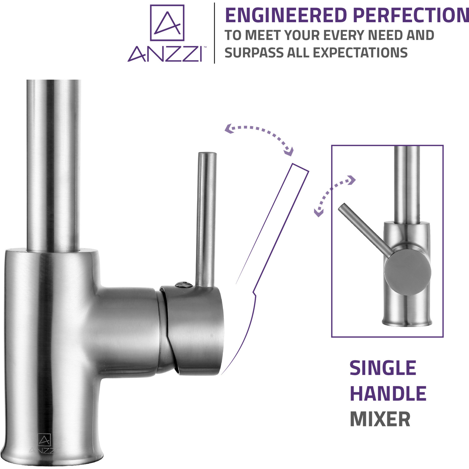 ANZZI is committed to introducing the latest in European bath fixture design to the North American home. ANZZI presents the Sire single handle kitchen sink faucet. Crafted using RHINO ALLOY certified brass interior, marine grade ceramic disk and brushed nickel lead-free rust resistant finish. The elegance and style of our ANZZI faucets is matched by their proven performance and reliability. Which is why our faucets are backed by the ANZZI Limited Lifetime Warranty. Become a member of the ANZZI family and experience why Perfection is our Tradition.Stunning brushed nickel finishRHINO ALLOY certified lead-free solid brass with rust resistant finishSingle (1) handle operationSingle (1) hole installationPull out sprayer with 12.4 in. reachMarine grade ceramic disk includedSpout reach: 8.66 in.; spout height: 7.48 in.Flow rate: 1.8 gpmConnection size: 3/8 in.cUPC, NSF, AB1953 and Watersense certifiedLimited lifetime warrantyShips from factory within 24 hours of orderTo speak to a knowledgeable and dedicated ANZZI specialist simply call 1-844-44-ANZZI or visit us on the web at www.ANZZI.com