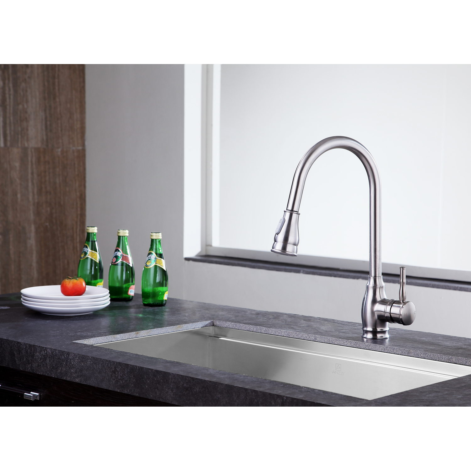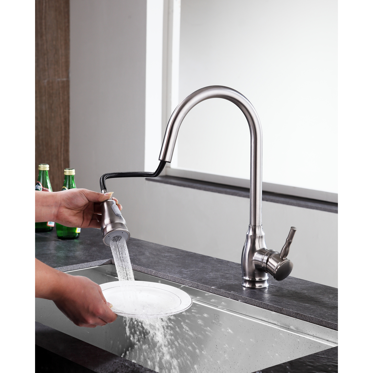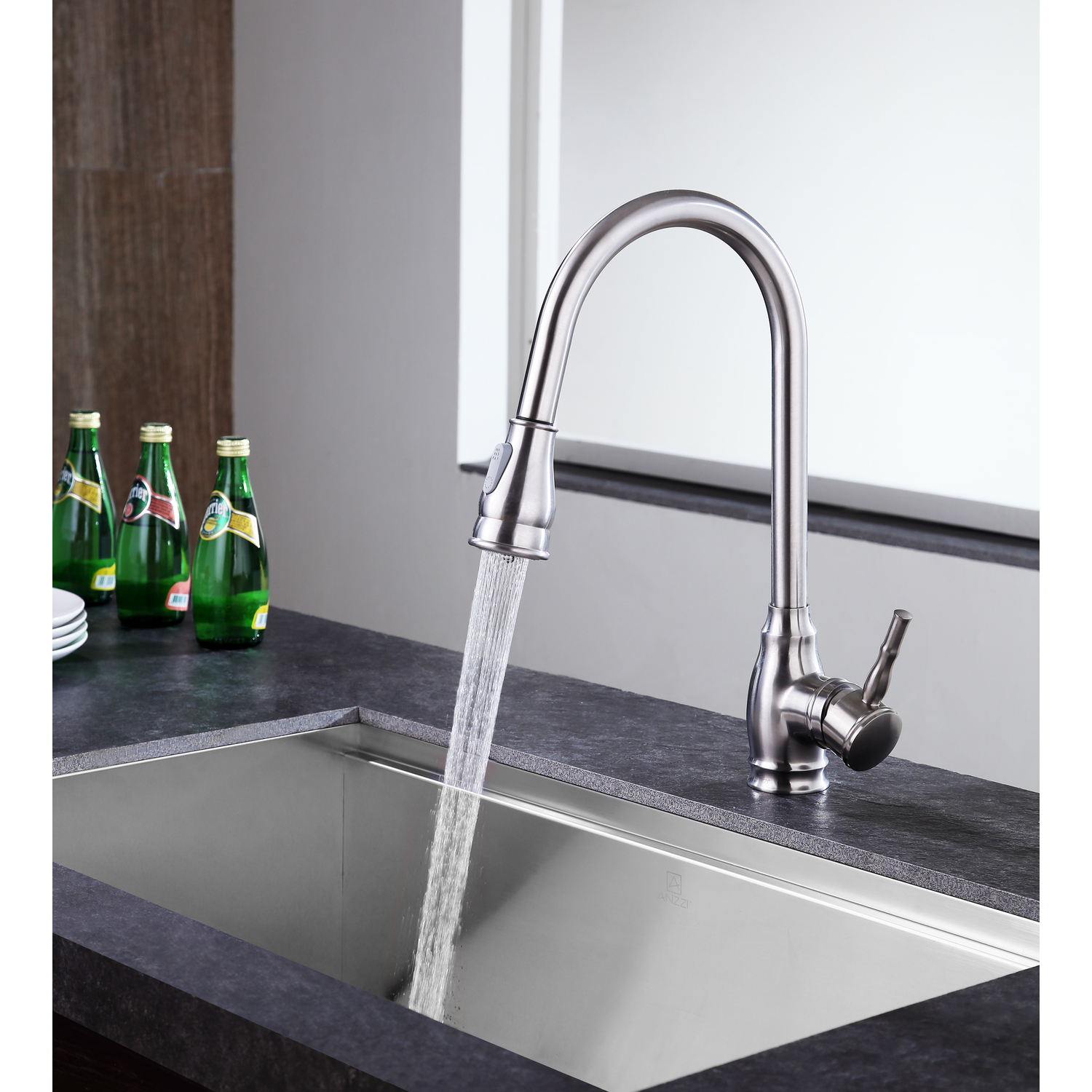 ANZZI is committed to introducing the latest in European bath fixture design to the North American home. ANZZI presents the Bell single handle kitchen sink faucet. Crafted using RHINO ALLOY certified brass interior, marine grade ceramic disk and brushed nickel lead-free rust resistant finish. The elegance and style of our ANZZI faucets is matched by their proven performance and reliability. Which is why our faucets are backed by the ANZZI Limited Lifetime Warranty. Become a member of the ANZZI family and experience why Perfection is our Tradition.Stunning brushed nickel finishRHINO ALLOY certified lead-free solid brass with rust resistant finishSingle (1) handle operationSingle (1) hole installationPull out sprayer with 12.6 in. reachMarine grade ceramic disk includedSpout reach: 9.45 in.; spout height: 7.87 in.Flow rate: 1.8 gpmConnection size: 3/8 in.cUPC, NSF, AB1953 and CEC certifiedLimited lifetime warrantyShips from factory within 24 hours of orderTo speak to a knowledgeable and dedicated ANZZI specialist simply call 1-844-44-ANZZI or visit us on the web at www.ANZZI.com