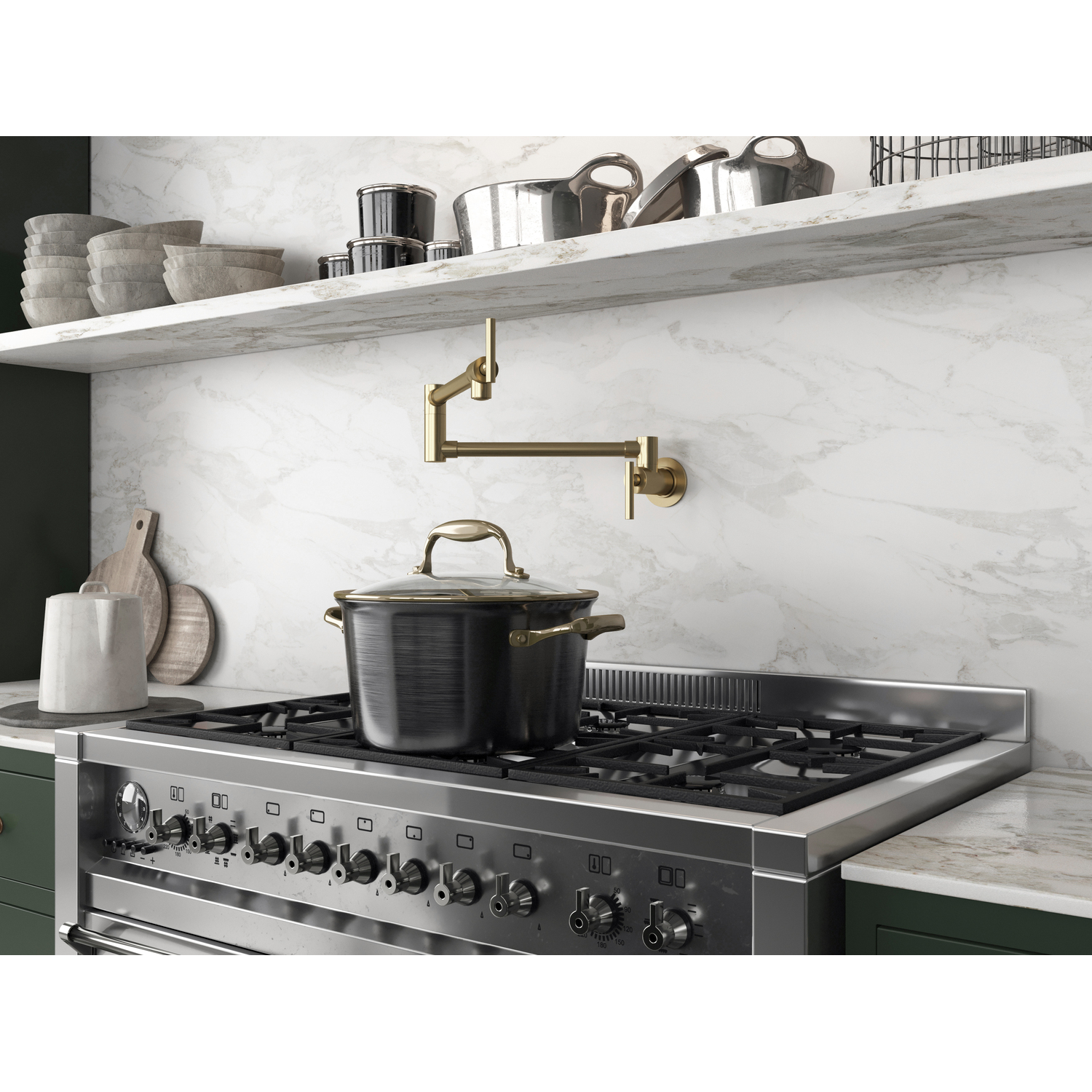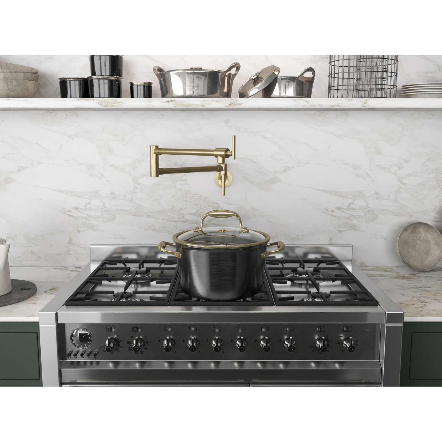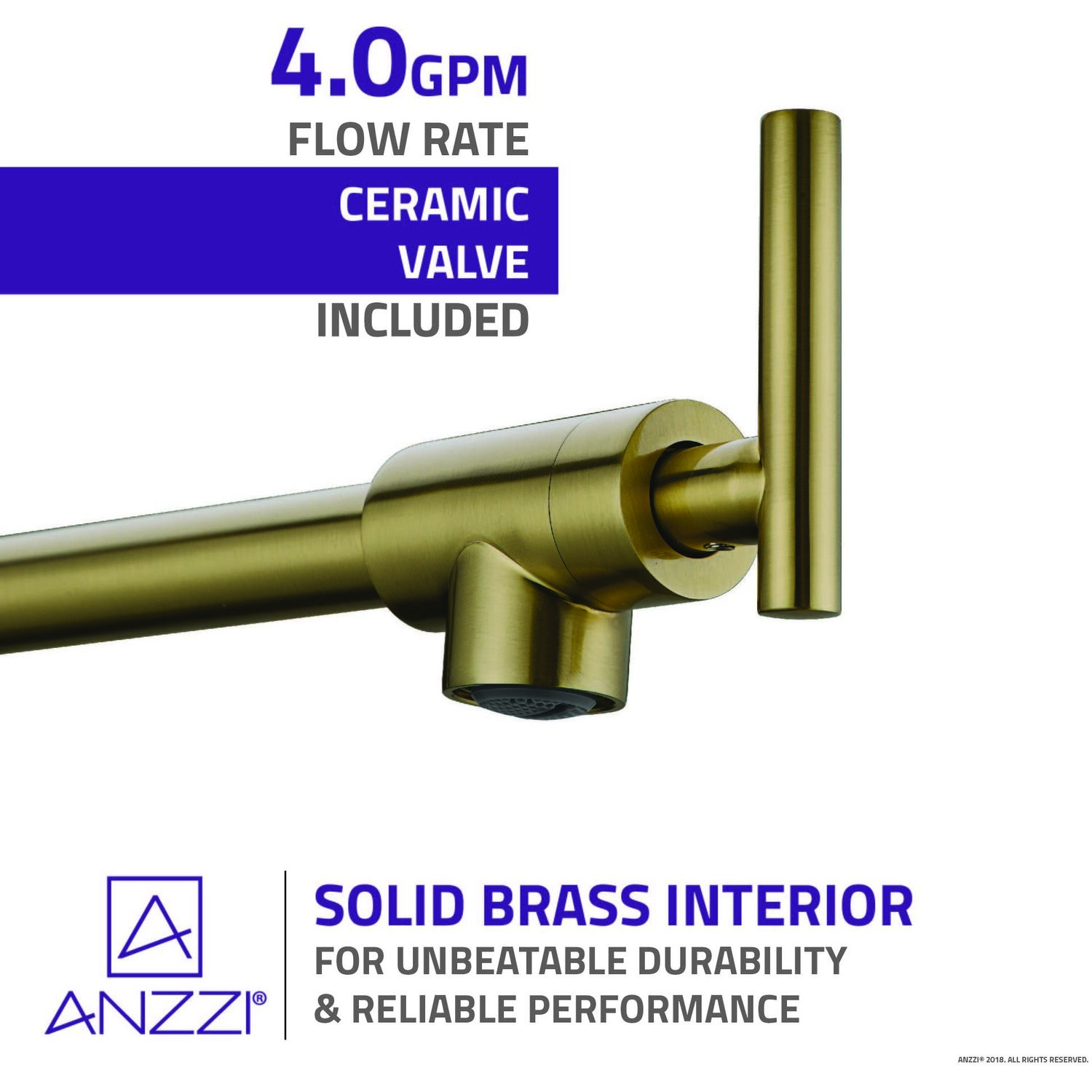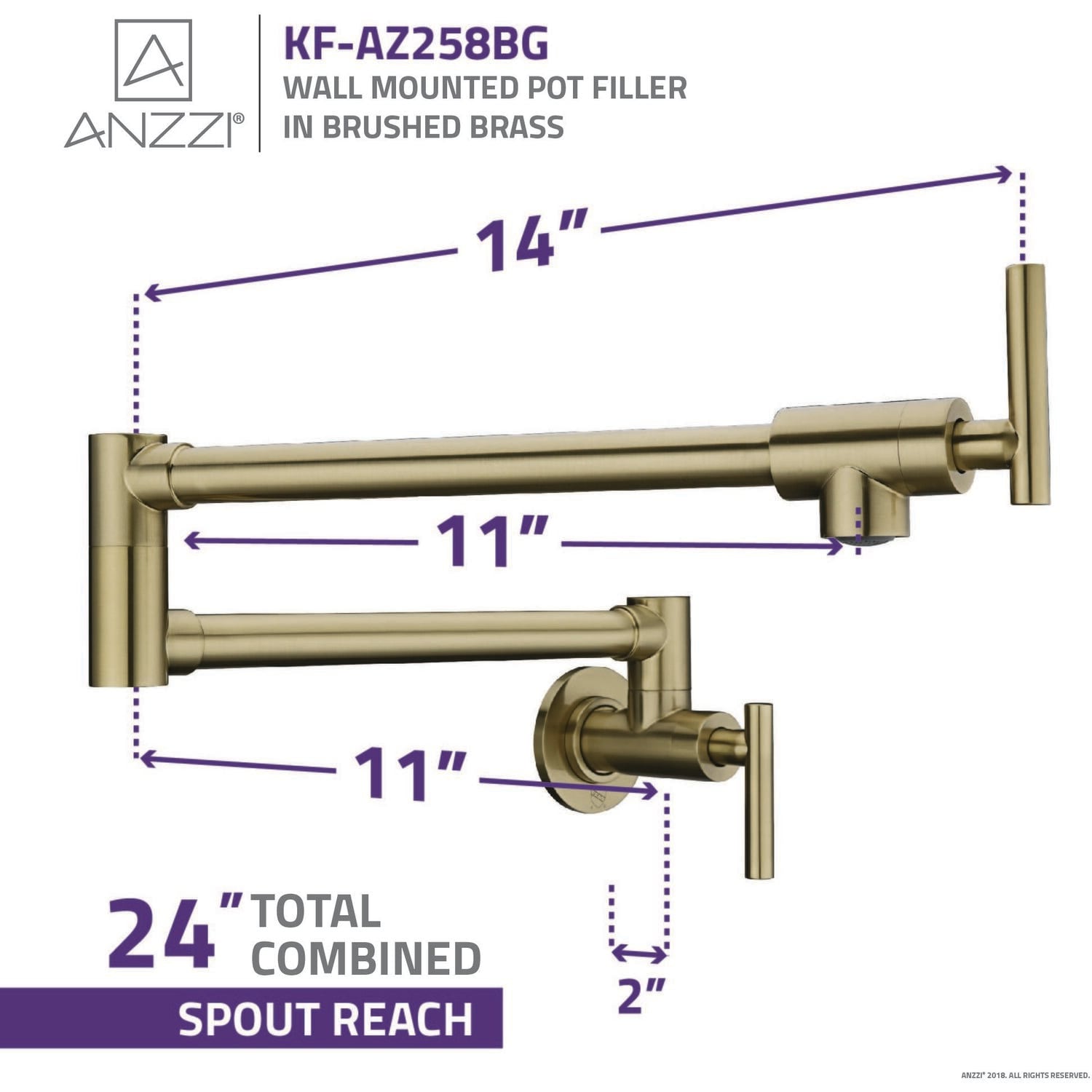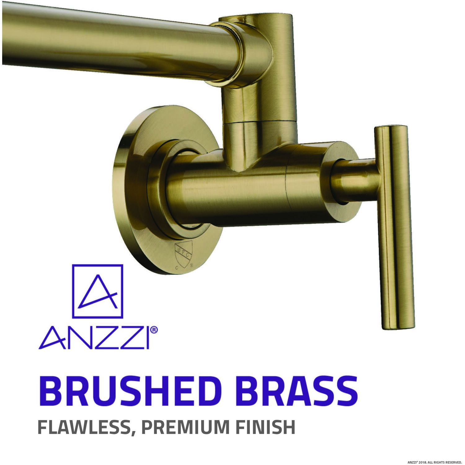 The ANZZI Braccia Series wall mounted pot fillers perfectly blend today’s modern design and reliability with classical elegance and grace. The featured dual pivot joint allows for maximum reach and positional flexibility ensuring the 4 gpm spout is always positioned exactly where you need it to be. The strategic double water valve system also for initial water flow activation at the base along with convenient water flow control on the spout itself. Built using RHINO ALLOY certified steel and brass the Braccia Series pot filler delivers reliable durability, convenient articulation and long-lasting performance.Solid brass interior for superior strength and reliabilityFlawless brushed brass finishSingle hole, wall mounted installationTwo handle, dual shut-off valve system for independent water flow controlDual joint offers complete positional control and flexibility360 degree swivel range at each joint for maximum maneuverabilityFlow rate: 4 gpmNo thermostatic water mixing, cold water onlyTotal spout reach of 24"Ships from warehouse within 24 hours of order processingANZZI Lifetime WarrantyTo speak to a knowledgeable and dedicated ANZZI specialist simply call 1-844-44-ANZZI or visit us on the web at www.ANZZI.com