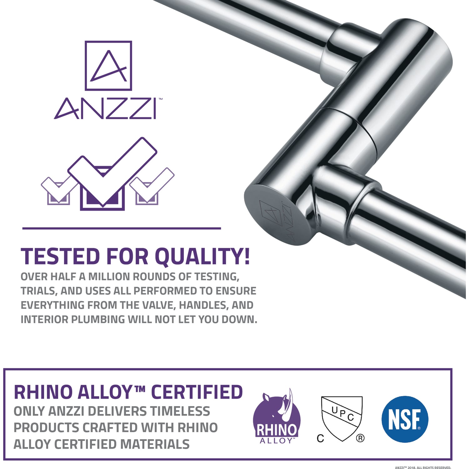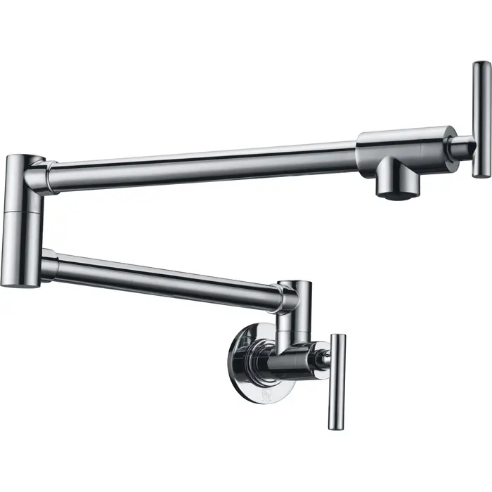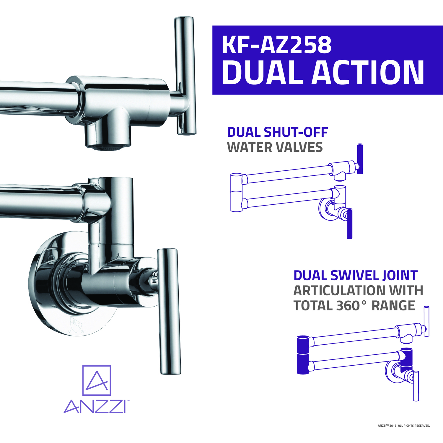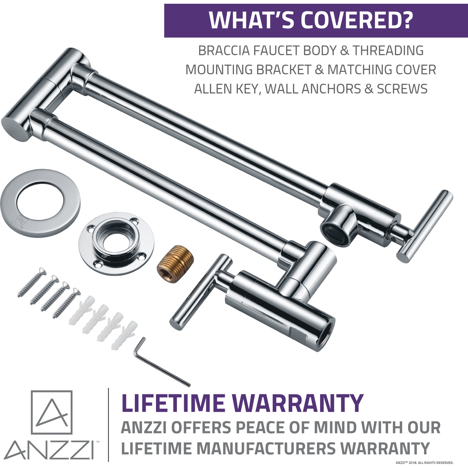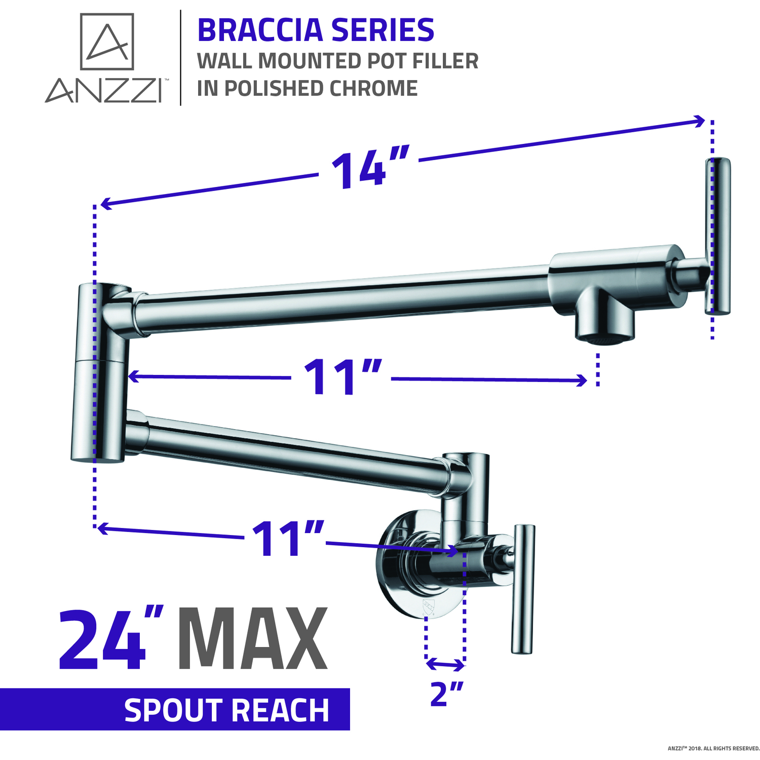 The ANZZI Braccia Series wall mounted pot fillers perfectly blend today’s modern design and reliability with classical elegance and grace. The featured dual pivot joint allows for maximum reach and positional flexibility ensuring the 4 gpm spout is always positioned exactly where you need it to be. The strategic double water valve system also for initial water flow activation at the base along with convenient water flow control on the spout itself. Built using RHINO ALLOY certified steel and brass the Braccia Series pot filler delivers reliable durability, convenient articulation and long-lasting performance.Solid brass interior for superior strength and reliabilityVibrant and stunning polished chrome finishSingle hole, wall mounted installationTwo handle, dual shut-off valve system for independent water flow controlDual joint offers complete positional control and flexibility360 degree swivel range at each joint for maximum maneuverabilityFlow rate: 4 gpmNo thermostatic water mixing, cold water onlyTotal spout reach of 24"Ships from warehouse within 24 hours of order processingANZZI Lifetime WarrantyTo speak to a knowledgeable and dedicated ANZZI specialist simply call 1-844-44-ANZZI or visit us on the web at www.ANZZI.com