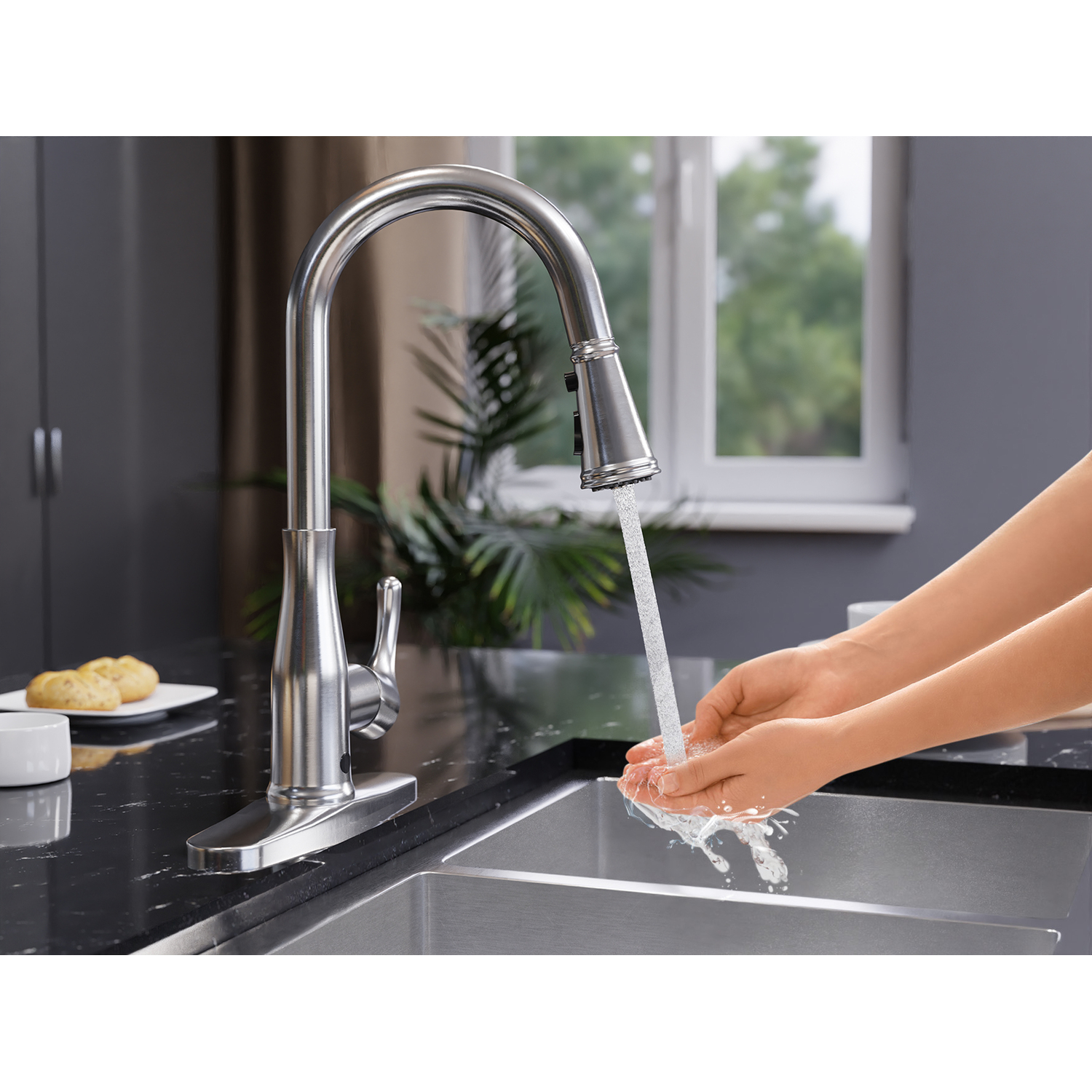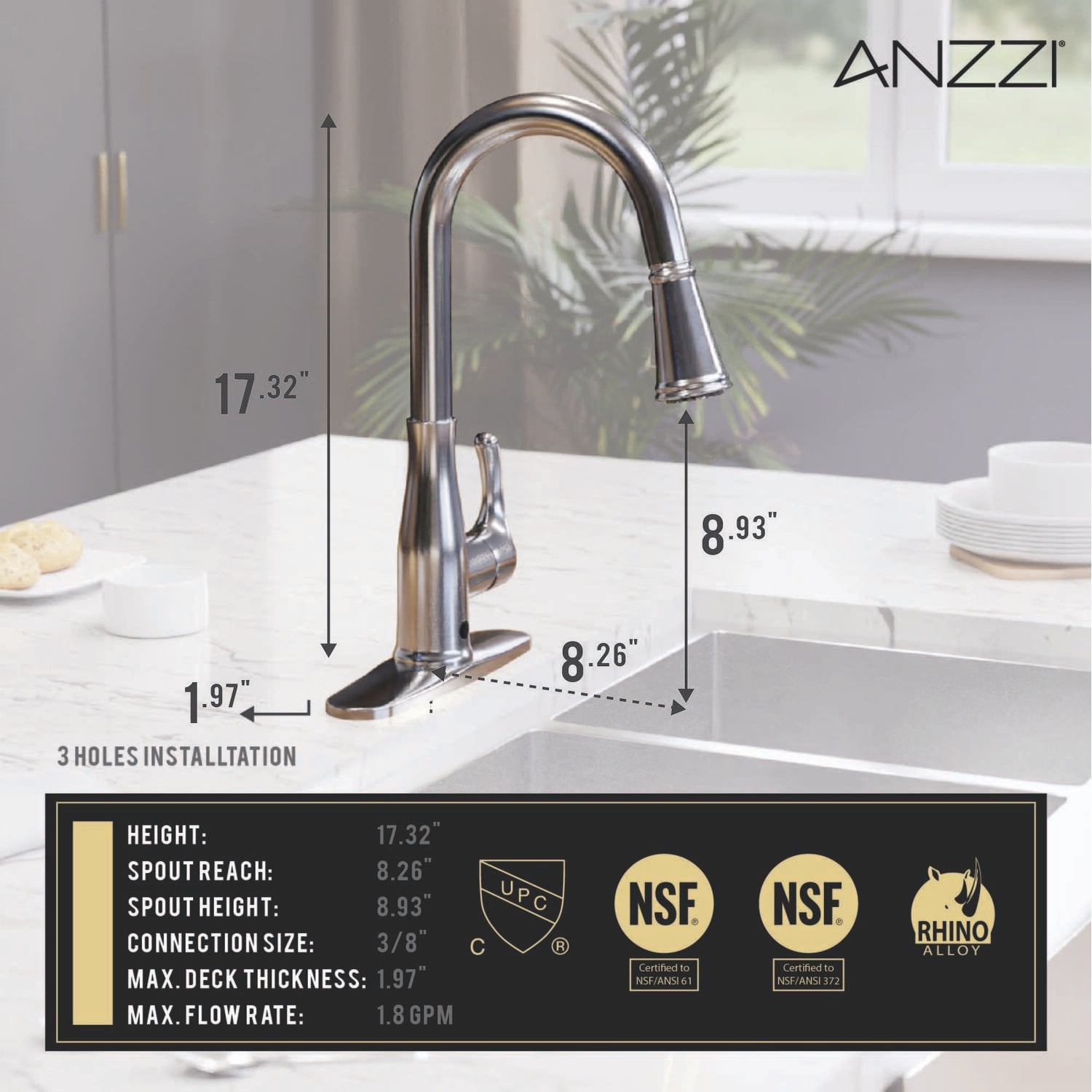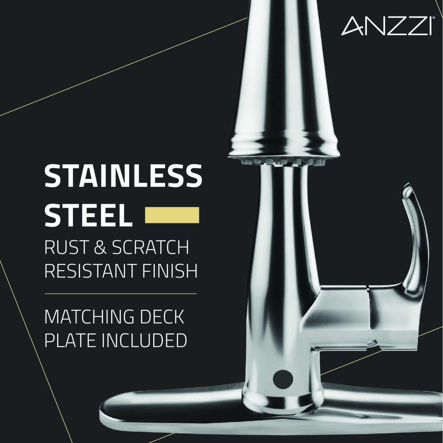 You’ll wonder how you ever lived without the touchless convenience of this premium kitchen upgrade! We built this faucet with the latest motion-detection technology so it’s simple to use, sanitary and super helpful — just wave your hand near the sensor to easily turn the water flow on or off. The sleek, stylish design features a pull-down spray head with three powerful spray modes and a swiveling spout. Available in three finishes — Brushed Steel, Brushed Gold, Matte Black.Like what you see? You can make this kitchen suite a reality with ANZZIALSO AVAILABLE FOR PURCHASE (Search #) : Pot Filler (KF-AZ258BKM), Farmhouse Sink (K-AZ3620-3A)TOUCHLESS MOTION-SENSOR TECHNOLOGY — hands-free operation makes faucet super easy to use, keeps the fixture cleaner and helps prevent the spread of germsPOWERFUL FAN SPRAY MODE – focuses the jet in a powerful rinse spray for heavy duty cleaningPULL DOWN SPRAY HEAD & SWIVELING SPOUT — makes it simple to direct a powerful spray of water right where you need itAVAILABLE IN THREE BEAUTIFUL FINISHES — choose from Stainless Steel, Brushed Gold, or Matte BlackRHINO-ALLOY CERTIFIED — you’re guaranteed the best quality and long-lasting durabilityDECK PLATE INCLUDED — can be installed in 1-, 2- or 3-hole sinksCONNECTION SIZE: 3/8 in.POWERED by 4 AA Batteries (not included)LIMITED LIFETIME WARRANTY — when you buy it, we back it, so you can be confident in the quality of our productsGET IT FAST — ships from warehouse within 24 hours of order processingProfessional installation highly recommendedTo speak to a knowledgeable and dedicated ANZZI specialist simply call 1-844-44-ANZZI or visit us on the web at www.ANZZI.com