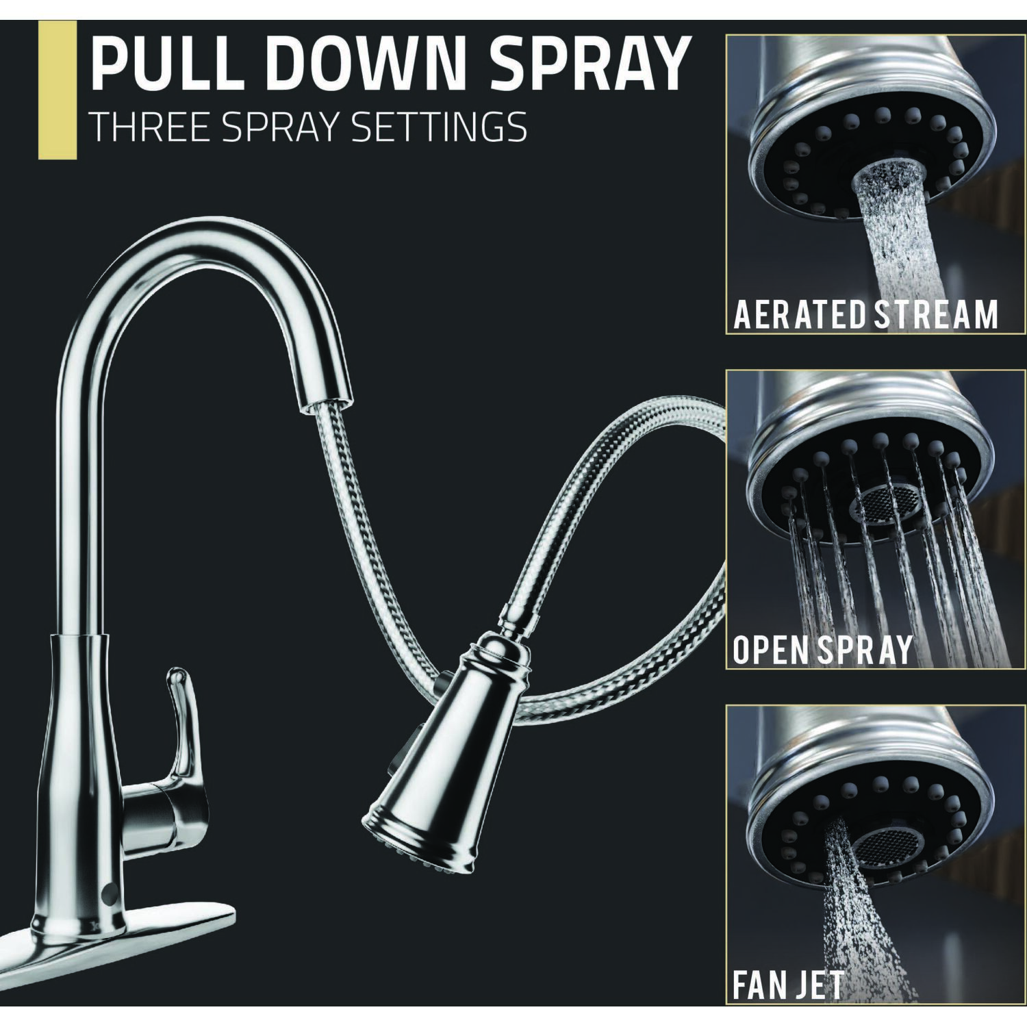 - PULL DOWN SPRAY HEAD & SWIVELING SPOUT — makes it simple to direct a powerful spray of water right where you need it