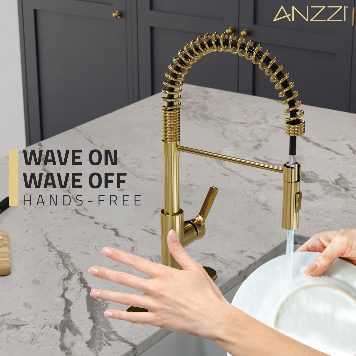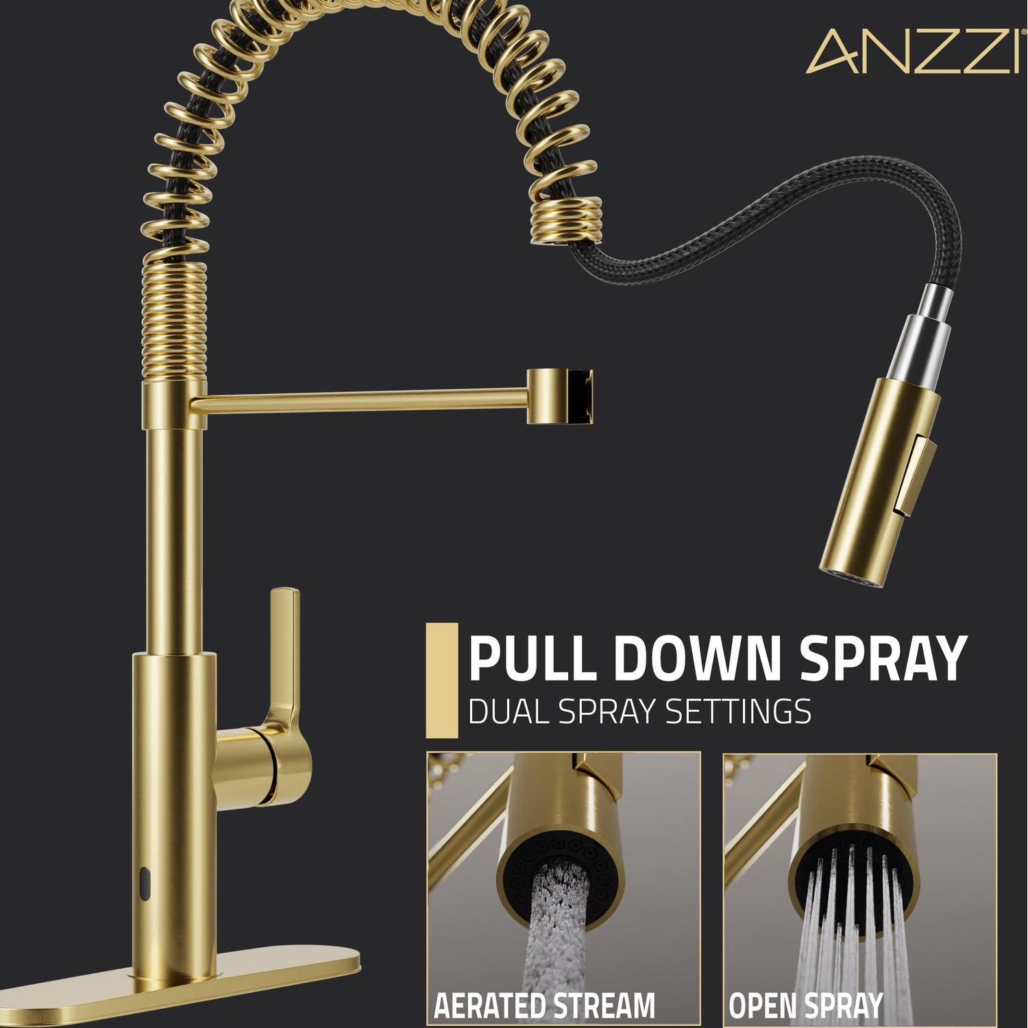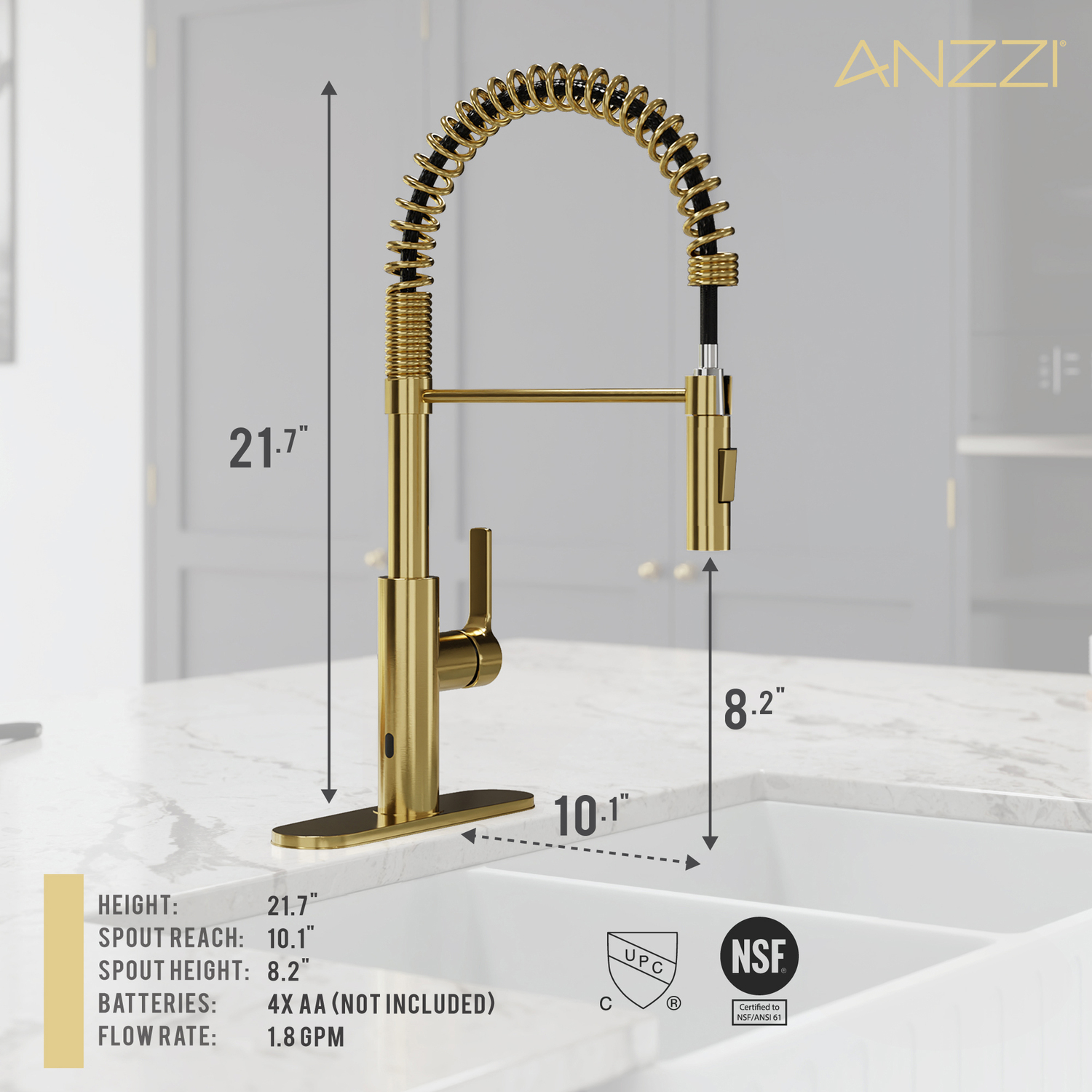 You’ll wonder how you ever lived without the touchless convenience of this premium kitchen upgrade! We built this faucet with the latest motion-detection technology so it’s simple to use, sanitary and super helpful — just wave your hand near the sensor to easily turn the water flow on or off. The sleek, stylish design features a pull-down spray head with two powerful spray modes and a swiveling spout. Available in three finishes — Brushed Nickel, Brushed Gold, Matte Black.Like what you see? You can make this kitchen suite a reality with ANZZIALSO AVAILABLE FOR PURCHASE (Search #) : Man-Made Stone Farmhouse Sink (K-AZ227-2B)TOUCHLESS MOTION-SENSOR TECHNOLOGY — hands-free operation makes faucet super easy to use, keeps the fixture cleaner and helps prevent the spread of germs. Wave once to turn it ON then wave again to turn it OFF.POWERFUL SPRAY MODE – focus the jets in a powerful rinse spray for heavy duty cleaningPULL DOWN SPRAY HEAD & SWIVELING SPOUT — makes it simple to direct a powerful spray of water right where you need itAVAILABLE IN THREE BEAUTIFUL FINISHES — choose from Brushed Nickel, Brushed Gold, or Matte BlackRHINO-ALLOY CERTIFIED — you’re guaranteed the best quality and long-lasting durabilityDECK PLATE INCLUDED — can be installed in 1-, 2- or 3-hole sinksCONNECTION SIZE: 3/8 in.POWERED by 4 AA Batteries (not included)LIMITED LIFETIME WARRANTY — when you buy it, we back it, so you can be confident in the quality of our productsGET IT FAST — ships from warehouse within 24 hours of order processingProfessional installation highly recommendedTo speak to a knowledgeable and dedicated ANZZI specialist simply call 1-844-44-ANZZI or visit us on the web at www.ANZZI.com