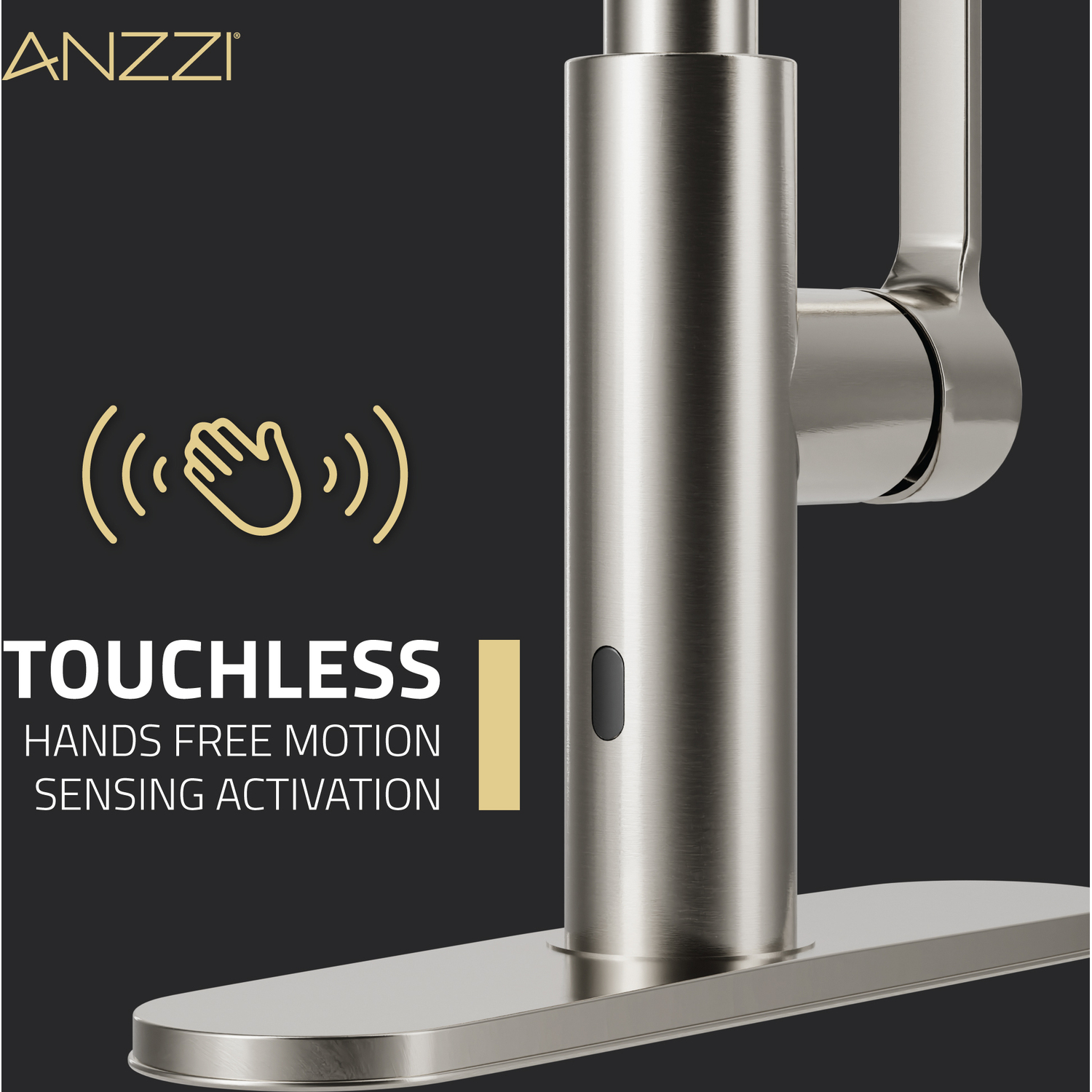 You’ll wonder how you ever lived without the touchless convenience of this premium kitchen upgrade! We built this faucet with the latest motion-detection technology so it’s simple to use, sanitary and super helpful — just wave your hand near the sensor to easily turn the water flow on or off. The sleek, stylish design features a pull-down spray head with two powerful spray modes and a swiveling spout. Available in three finishes — Brushed Nickel, Brushed Gold, Matte Black.Like what you see? You can make this kitchen suite a reality with ANZZIALSO AVAILABLE FOR PURCHASE (Search #) : Man-Made Stone Farmhouse Sink (K-AZ227-2B)TOUCHLESS MOTION-SENSOR TECHNOLOGY — hands-free operation makes faucet super easy to use, keeps the fixture cleaner and helps prevent the spread of germs. Wave once to turn it ON then wave again to turn it OFF.POWERFUL SPRAY MODE – focus the jets in a powerful rinse spray for heavy duty cleaningPULL DOWN SPRAY HEAD & SWIVELING SPOUT — makes it simple to direct a powerful spray of water right where you need itAVAILABLE IN THREE BEAUTIFUL FINISHES — choose from Brushed Nickel, Brushed Gold, or Matte BlackRHINO-ALLOY CERTIFIED — you’re guaranteed the best quality and long-lasting durabilityDECK PLATE INCLUDED — can be installed in 1-, 2- or 3-hole sinksCONNECTION SIZE: 3/8 in.POWERED by 4 AA Batteries (not included)LIMITED LIFETIME WARRANTY — when you buy it, we back it, so you can be confident in the quality of our productsGET IT FAST — ships from warehouse within 24 hours of order processingProfessional installation highly recommendedTo speak to a knowledgeable and dedicated ANZZI specialist simply call 1-844-44-ANZZI or visit us on the web at www.ANZZI.com