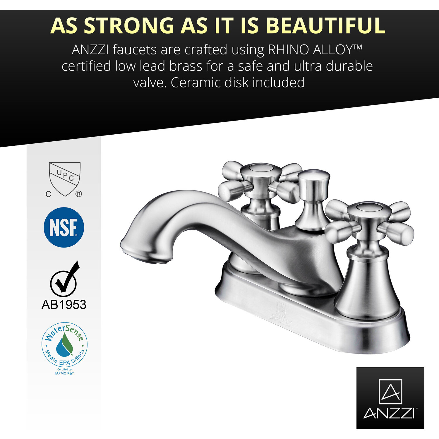 ANZZI is committed to introducing the latest in European bath fixture design to the North American home. ANZZI presents the Major Series 2-Handles Bathroom Sink Faucet. Crafted using lead-free RHINO ALLOY certified brass as the interior and our Traditional Brushed Nickel rust resistant finish. This all metal combination of high quality materials ensures you will enjoy a flawlessly performing faucet for many years to come. The elegantly simple dual handle design allows for complete and easy control of both water flow and temperature while maintain the fine minimalist aesthetic to match with any modern or contemporary décor style. The ANZZI Major Series is listed certified under cUPC, NSF, AB1953, Watersense for installation within North America.Traditional Brushed Nickel finishRHINO ALLOY certified lead-free solid brass with rust resistant finishTwin dual (2) lever handle controlElegantly arching spout inspired by the latest European stylesDeck mounted two (2) hole installationSpout Reach: 5.63 in.; Spout Height: 3.19 in.Flow rate: 1.2 gpmcUPC, NSF, AB1953, Watersense certified and listed for North AmericaLimited Lifetime WarrantyTo speak to a knowledgeable and dedicated ANZZI specialist simply call 1-844-44-ANZZI or visit us on the web at www.ANZZI.com