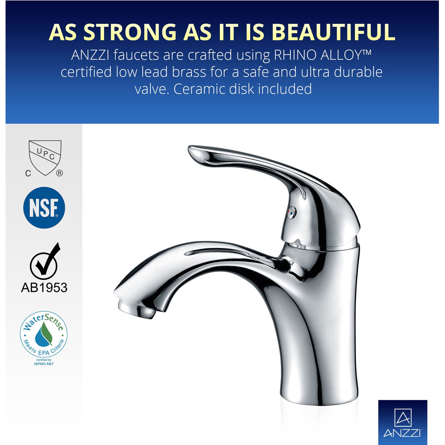 ANZZI is committed to introducing the latest in European bath fixture design to the North American home. ANZZI presents the Clavier Series Single Handle Bathroom Sink Faucet. Crafted using lead-free RHINO ALLOY certified brass as the interior and our Lustrous Polished Chrome rust resistant finish. This all metal combination of high quality materials ensures you will enjoy a flawlessly performing faucet for many years to come. The deceptively simple single handle design allows for complete and easy control of both water flow and temperature while maintain the fine minimalist aesthetic to match with any modern or contemporary décor style. The ANZZI Clavier Series is listed certified under cUPC, NSF, AB1953, Watersense for installation within North America.Lustrous Polished Chrome finishRHINO ALLOY certified lead-free solid brass with rust resistant finishSingular (1) lever handle controlElegantly arching spout inspired by the latest European stylesDeck mounted single (1) hole installationSpout Reach: 5.07 in.; Spout Height: 2.75 in.Flow rate: 1.2 gpmcUPC, NSF, AB1953, Watersense certified and listed for North AmericaLimited Lifetime WarrantyTo speak to a knowledgeable and dedicated ANZZI specialist simply call 1-844-44-ANZZI or visit us on the web at www.ANZZI.com