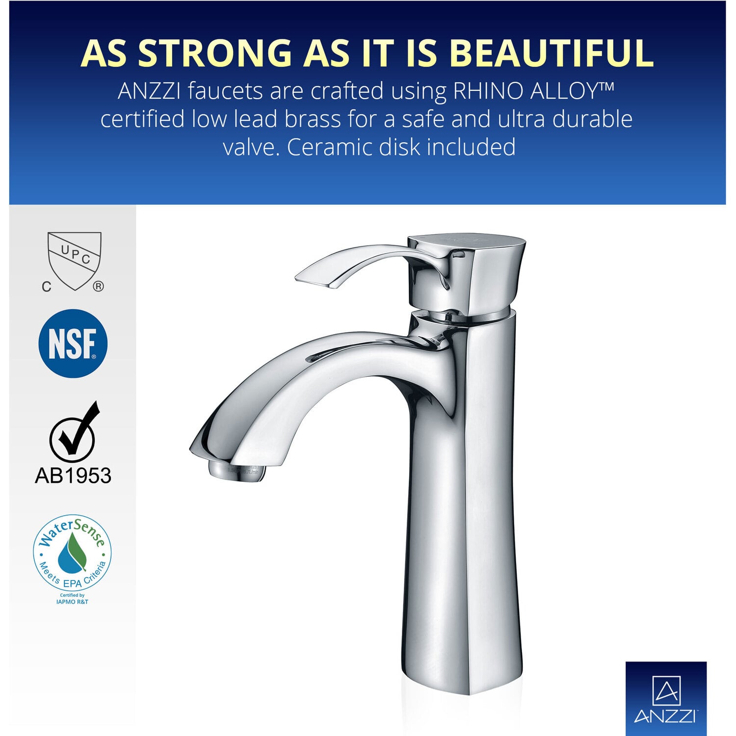 ANZZI is committed to introducing the latest in European bath fixture design to the North American home. ANZZI presents the Rhythm Series Single Handle Bathroom Sink Faucet. Crafted using lead-free RHINO ALLOY certified brass as the interior and our Lustrous Polished Chrome rust resistant finish. This all metal combination of high quality materials ensures you will enjoy a flawlessly performing faucet for many years to come. The deceptively simple single handle design allows for complete and easy control of both water flow and temperature while maintain the fine minimalist aesthetic to match with any modern or contemporary décor style. The ANZZI Rhythm Series is listed certified under cUPC, NSF, AB1953, Watersense, ADA for installation within North America.Lustrous Polished Chrome finishRHINO ALLOY certified lead-free solid brass with rust resistant finishSingular (1) lever handle controlElegantly arching spout inspired by the latest European stylesDeck mounted single (1) hole installationSpout Reach: 4.85 in.; Spout Height: 4.72 in.Flow rate: 1.2 gpmcUPC, NSF, AB1953, Watersense, ADA certified and listed for North AmericaLimited Lifetime WarrantyTo speak to a knowledgeable and dedicated ANZZI specialist simply call 1-844-44-ANZZI or visit us on the web at www.ANZZI.com