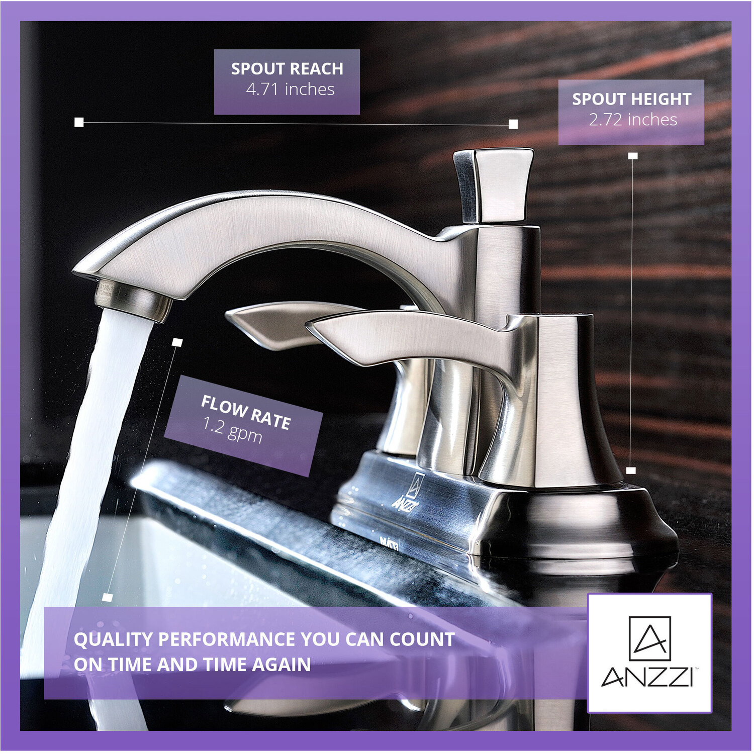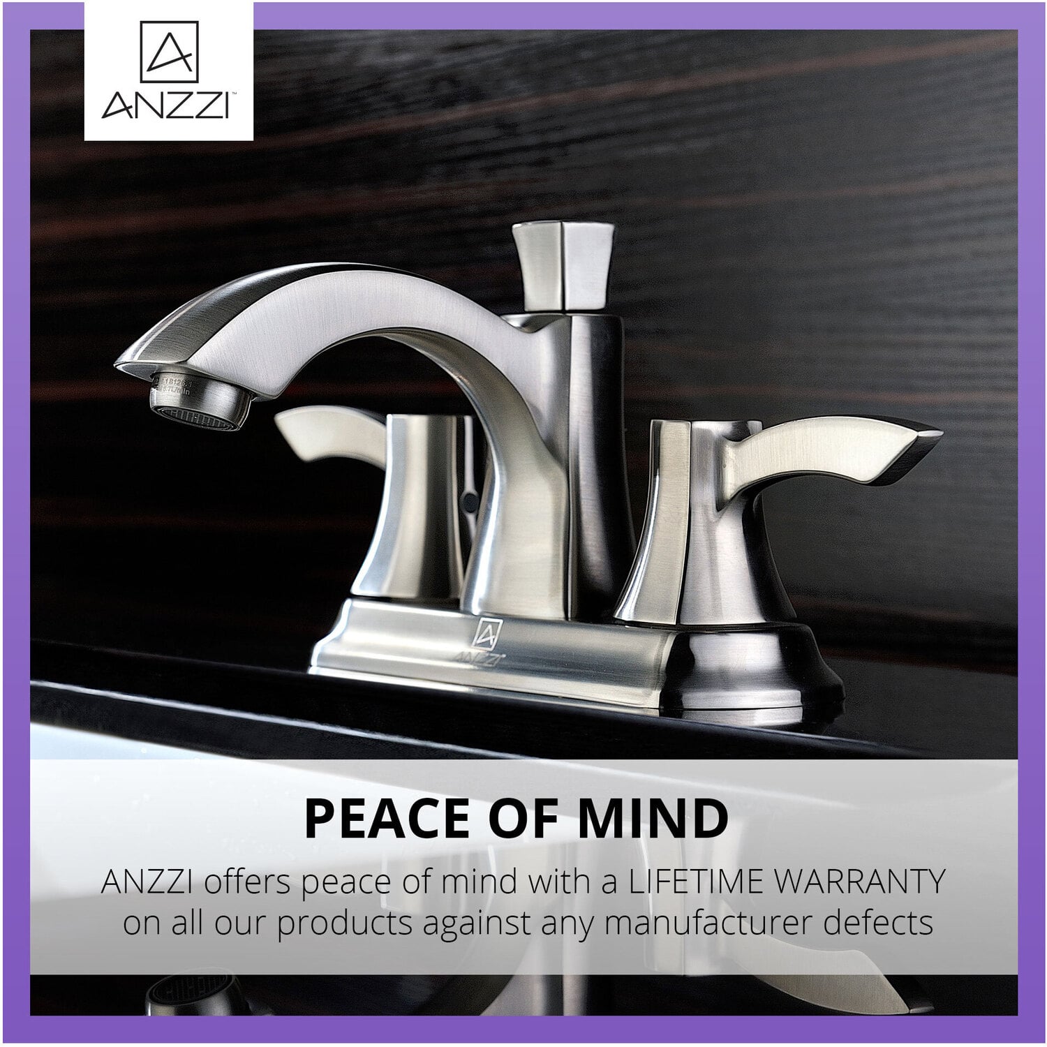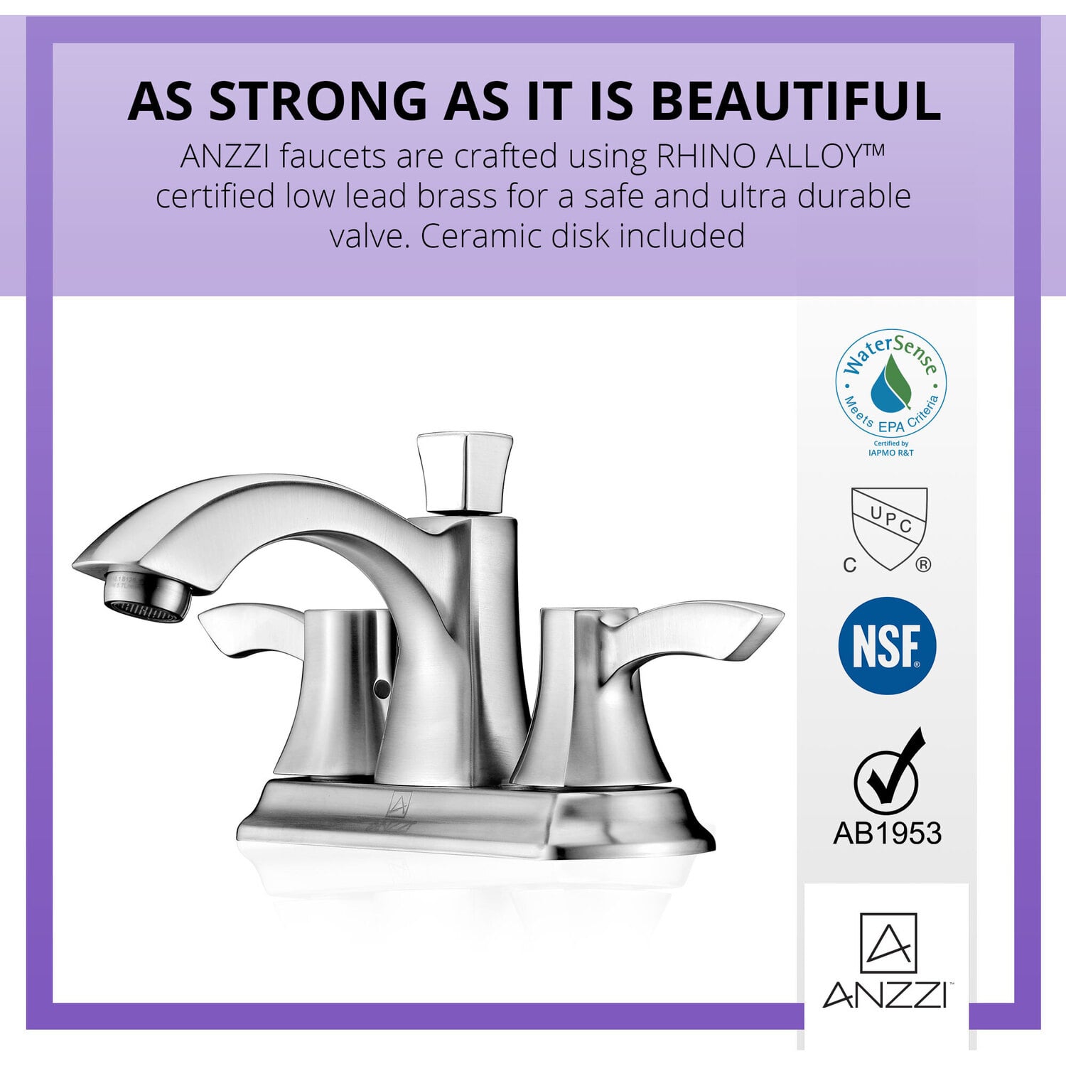 ANZZI is committed to introducing the latest in European bath fixture design to the North American home. ANZZI presents the Vista Series 2-Handles Bathroom Sink Faucet. Crafted using lead-free RHINO ALLOY certified brass as the interior and our Traditional Brushed Nickel rust resistant finish. This all metal combination of high quality materials ensures you will enjoy a flawlessly performing faucet for many years to come. The elegantly simple dual handle design allows for complete and easy control of both water flow and temperature while maintain the fine minimalist aesthetic to match with any modern or contemporary décor style. The ANZZI Vista Series is listed certified under cUPC, NSF, AB1953, Watersense, ADA for installation within North America.Traditional Brushed Nickel finishRHINO ALLOY certified lead-free solid brass with rust resistant finishTwin dual (2) lever handle controlElegantly arching spout inspired by the latest European stylesDeck mounted two (2) hole installationSpout Reach: 4.71 in.; Spout Height: 2.72 in.Flow rate: 1.2 gpmcUPC, NSF, AB1953, Watersense, ADA certified and listed for North AmericaLimited Lifetime WarrantyTo speak to a knowledgeable and dedicated ANZZI specialist simply call 1-844-44-ANZZI or visit us on the web at www.ANZZI.com
