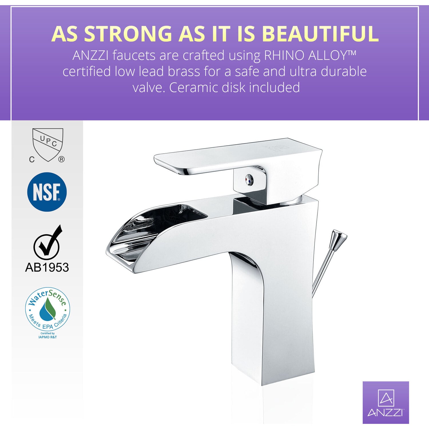 ANZZI is committed to introducing the latest in European bath fixture design to the North American home. ANZZI presents the Forza Series Single Handle Bathroom Sink Faucet. Crafted using lead-free RHINO ALLOY certified brass as the interior and our Lustrous Polished Chrome rust resistant finish. This all metal combination of high quality materials ensures you will enjoy a flawlessly performing faucet for many years to come. The deceptively simple single handle design allows for complete and easy control of both water flow and temperature while maintain the fine minimalist aesthetic to match with any modern or contemporary décor style. The ANZZI Forza Series is listed certified under cUPC, NSF, AB1953, Watersense for installation within North America.Lustrous Polished Chrome finishRHINO ALLOY certified lead-free solid brass with rust resistant finishSingular (1) lever handle controlElegantly arching spout inspired by the latest European stylesDeck mounted single (1) hole installationSpout Reach: 5.14 in.; Spout Height: 4.29 in.Flow rate: 1.2 gpmcUPC, NSF, AB1953, Watersense certified and listed for North AmericaLimited Lifetime WarrantyTo speak to a knowledgeable and dedicated ANZZI specialist simply call 1-844-44-ANZZI or visit us on the web at www.ANZZI.com