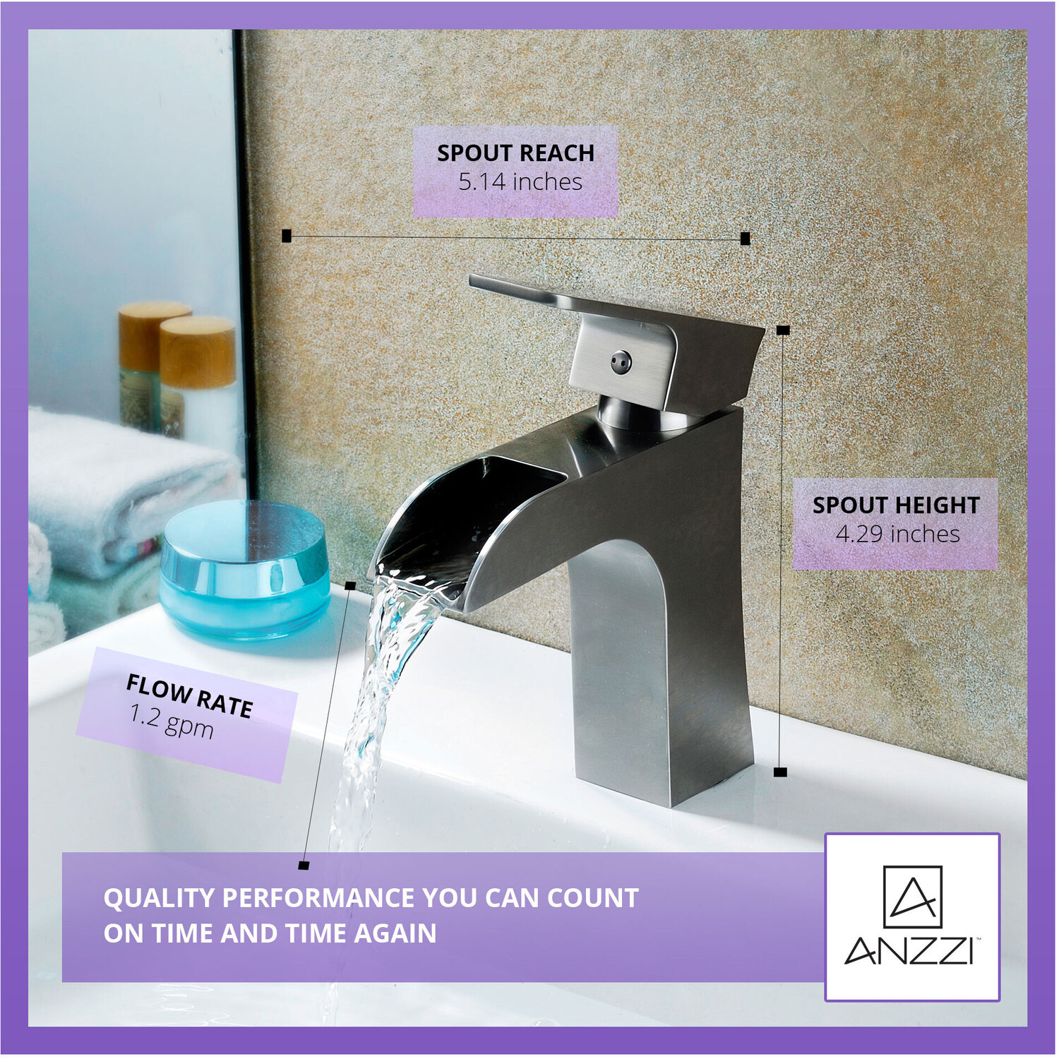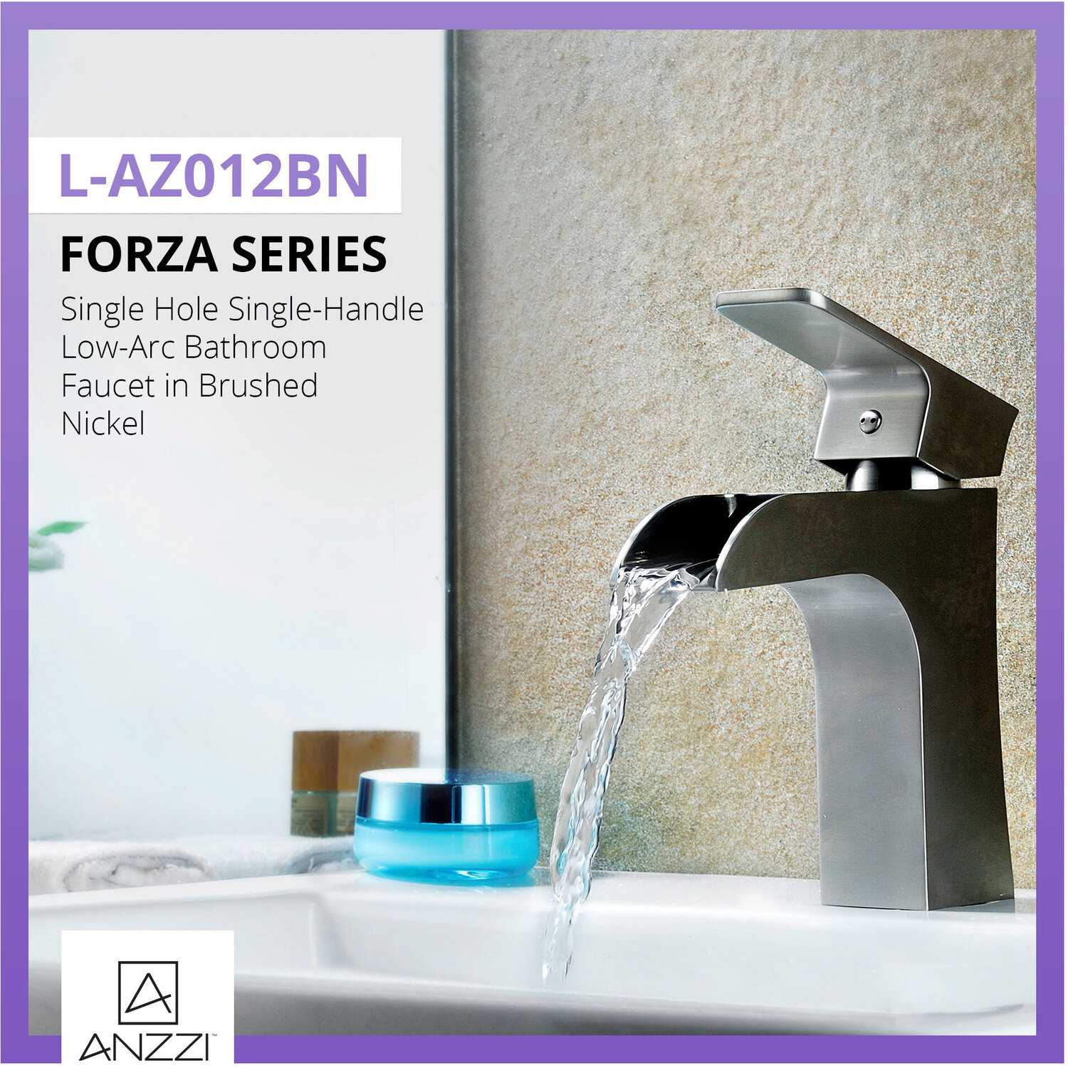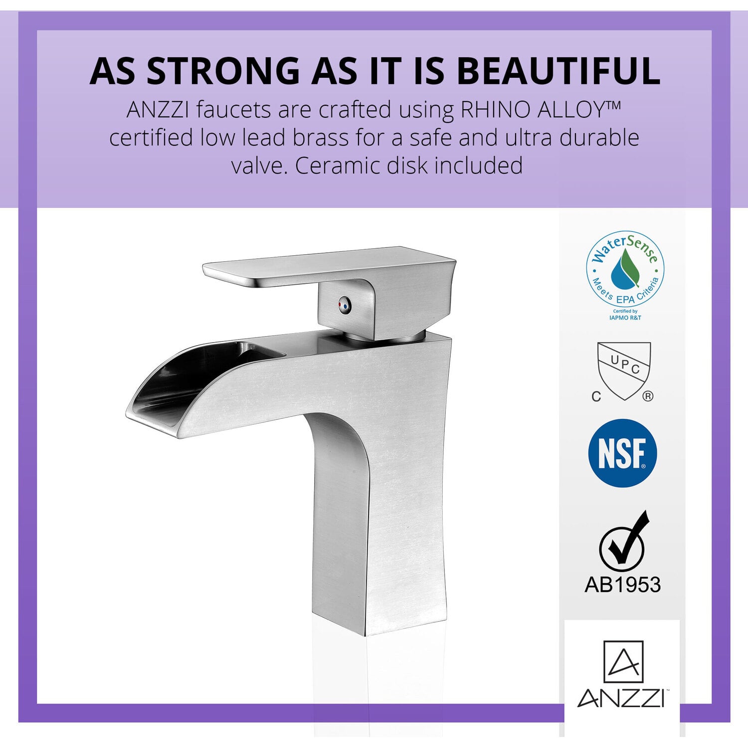 ANZZI is committed to introducing the latest in European bath fixture design to the North American home. ANZZI presents the Forza Series Single Handle Bathroom Sink Faucet. Crafted using lead-free RHINO ALLOY certified brass as the interior and our Traditional Brushed Nickel rust resistant finish. This all metal combination of high quality materials ensures you will enjoy a flawlessly performing faucet for many years to come. The deceptively simple single handle design allows for complete and easy control of both water flow and temperature while maintain the fine minimalist aesthetic to match with any modern or contemporary décor style. The ANZZI Forza Series is listed certified under cUPC, NSF, AB1953, Watersense for installation within North America.Traditional Brushed Nickel finishRHINO ALLOY certified lead-free solid brass with rust resistant finishSingular (1) lever handle controlElegantly arching spout inspired by the latest European stylesDeck mounted single (1) hole installationSpout Reach: 5.14 in.; Spout Height: 4.29 in.Flow rate: 1.2 gpmcUPC, NSF, AB1953, Watersense certified and listed for North AmericaLimited Lifetime WarrantyTo speak to a knowledgeable and dedicated ANZZI specialist simply call 1-844-44-ANZZI or visit us on the web at www.ANZZI.com