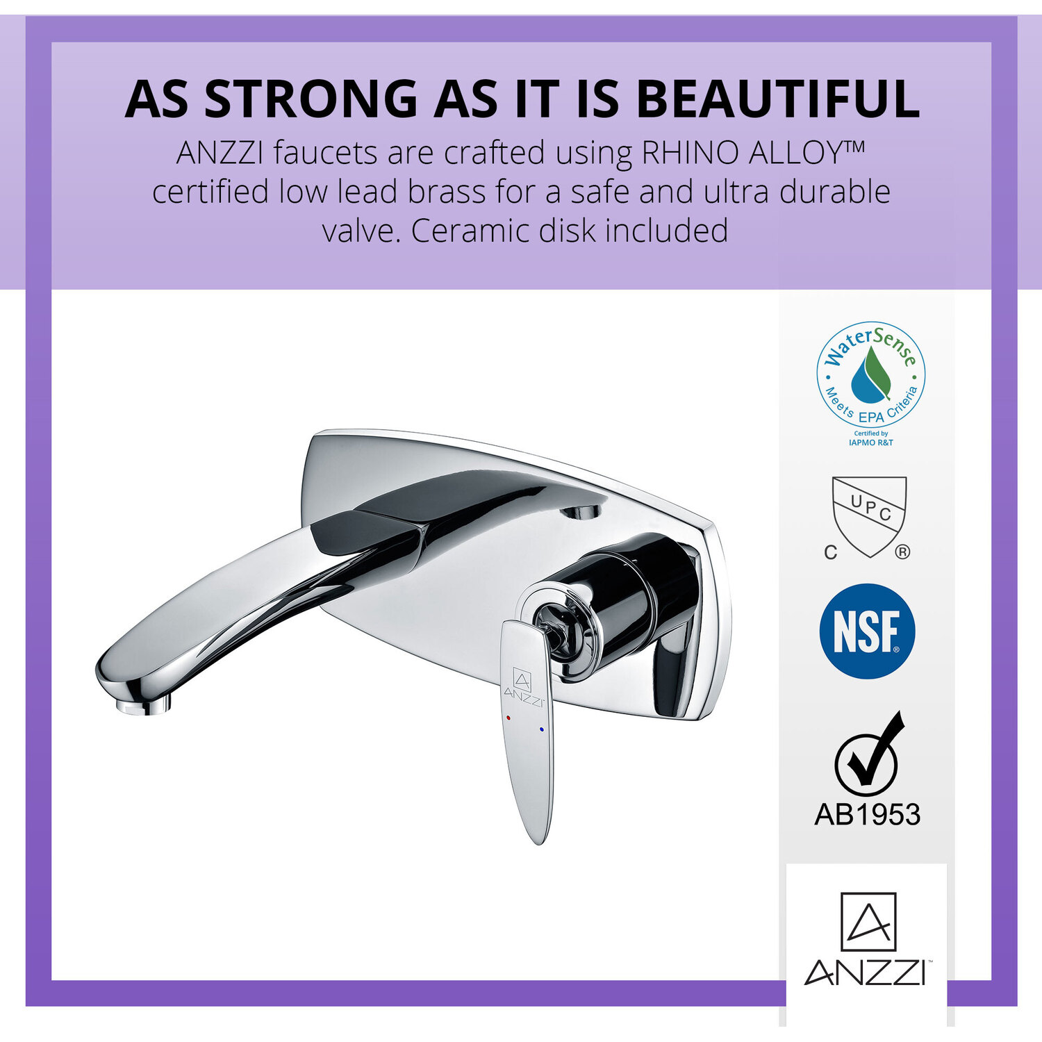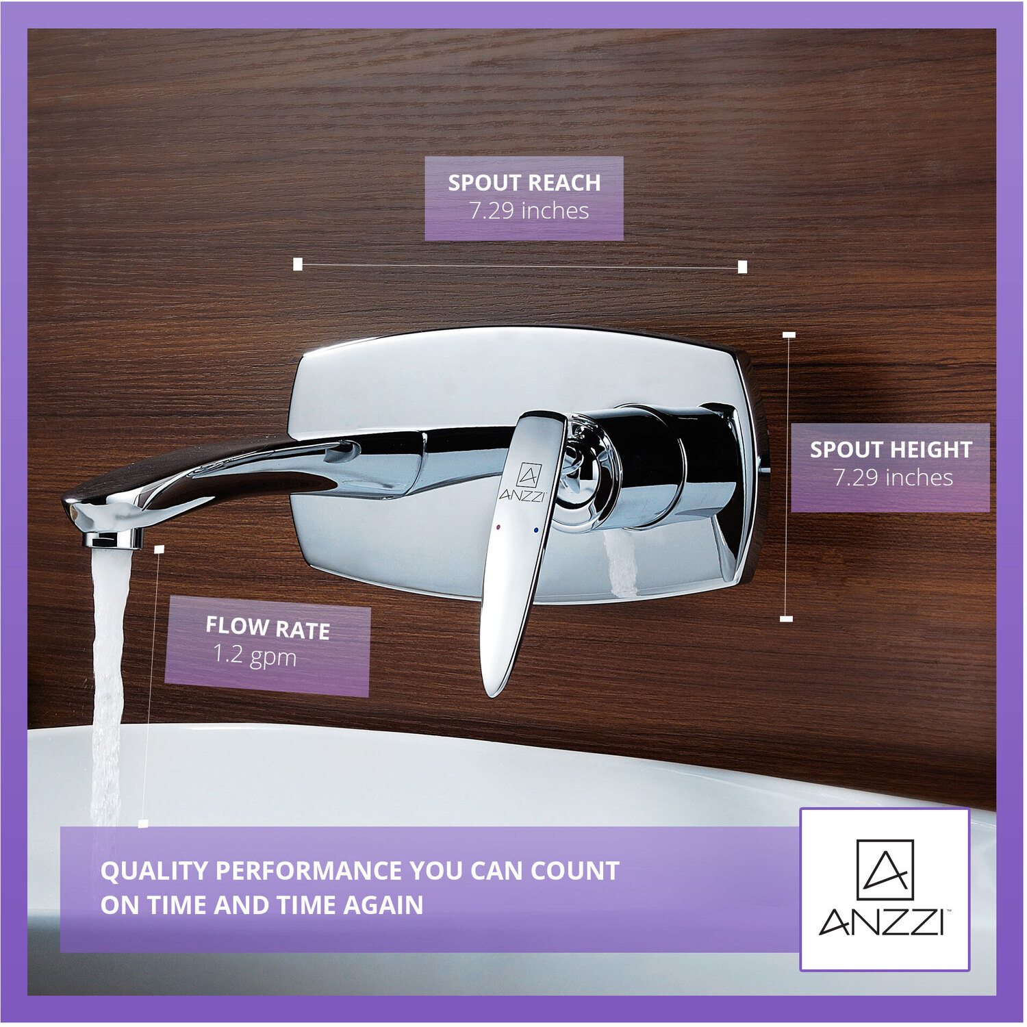 ANZZI is committed to introducing the latest in European bath fixture design to the North American home. ANZZI presents the Voce Series 2-Handles Bathroom Sink Faucet. Crafted using lead-free RHINO ALLOY certified brass as the interior and our Lustrous Polished Chrome rust resistant finish. This all metal combination of high quality materials ensures you will enjoy a flawlessly performing faucet for many years to come. The elegantly simple dual handle design allows for complete and easy control of both water flow and temperature while maintain the fine minimalist aesthetic to match with any modern or contemporary décor style. The ANZZI Voce Series is listed certified under cUPC, NSF, AB1953, Watersense for installation within North America.Lustrous Polished Chrome finishRHINO ALLOY certified lead-free solid brass with rust resistant finishSingle (1) lever handle controlSleek aerodynamic spout inspired by the latest European stylesWall mounted installationSpout Reach: 7.29 in.Flow rate: 1.2 gpmcUPC, NSF, AB1953, Watersense certified and listed for North AmericaLimited Lifetime WarrantyTo speak to a knowledgeable and dedicated ANZZI specialist simply call 1-844-44-ANZZI or visit us on the web at www.ANZZI.com