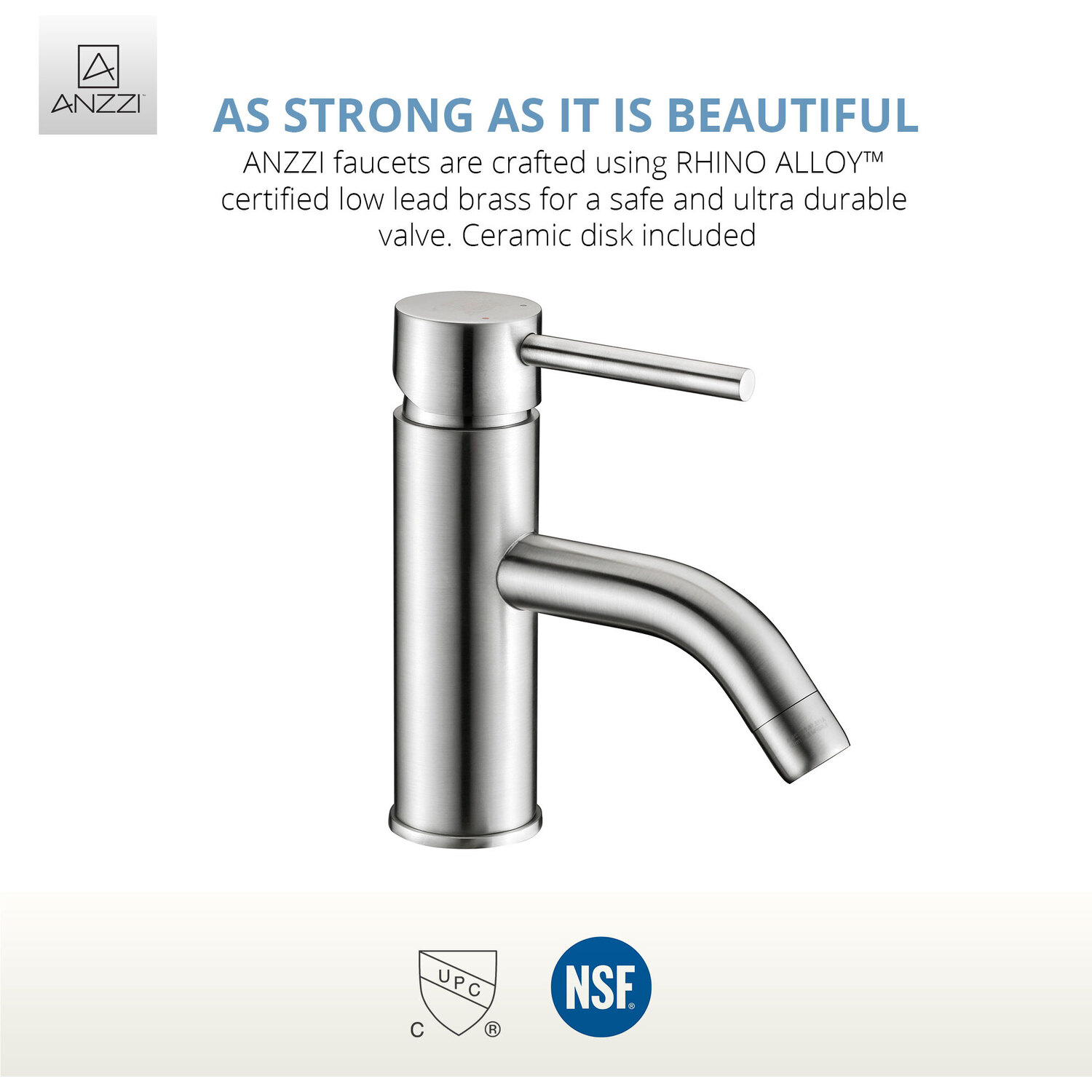 ANZZI is committed to introducing the latest in European bath fixture design to the North American home. ANZZI presents the Bravo Series Single Handle Bathroom Sink Faucet. Crafted using lead-free RHINO ALLOY certified brass as the interior and our Traditional Brushed Nickel rust resistant finish. This all metal combination of high quality materials ensures you will enjoy a flawlessly performing faucet for many years to come. The deceptively simple single handle design allows for complete and easy control of both water flow and temperature while maintain the fine minimalist aesthetic to match with any modern or contemporary décor style. The ANZZI Bravo Series is listed certified under cUPC, NSF for installation within North America.Traditional Brushed Nickel finishRHINO ALLOY certified lead-free solid brass with rust resistant finishSingular (1) lever handle controlElegantly arching spout inspired by the latest European stylesDeck mounted single (1) hole installationSpout Reach: 5.04 in.; Spout Height: 1.87 in.Flow rate: 1.2 gpmcUPC, NSF certified and listed for North AmericaLimited Lifetime WarrantyTo speak to a knowledgeable and dedicated ANZZI specialist simply call 1-844-44-ANZZI or visit us on the web at www.ANZZI.com