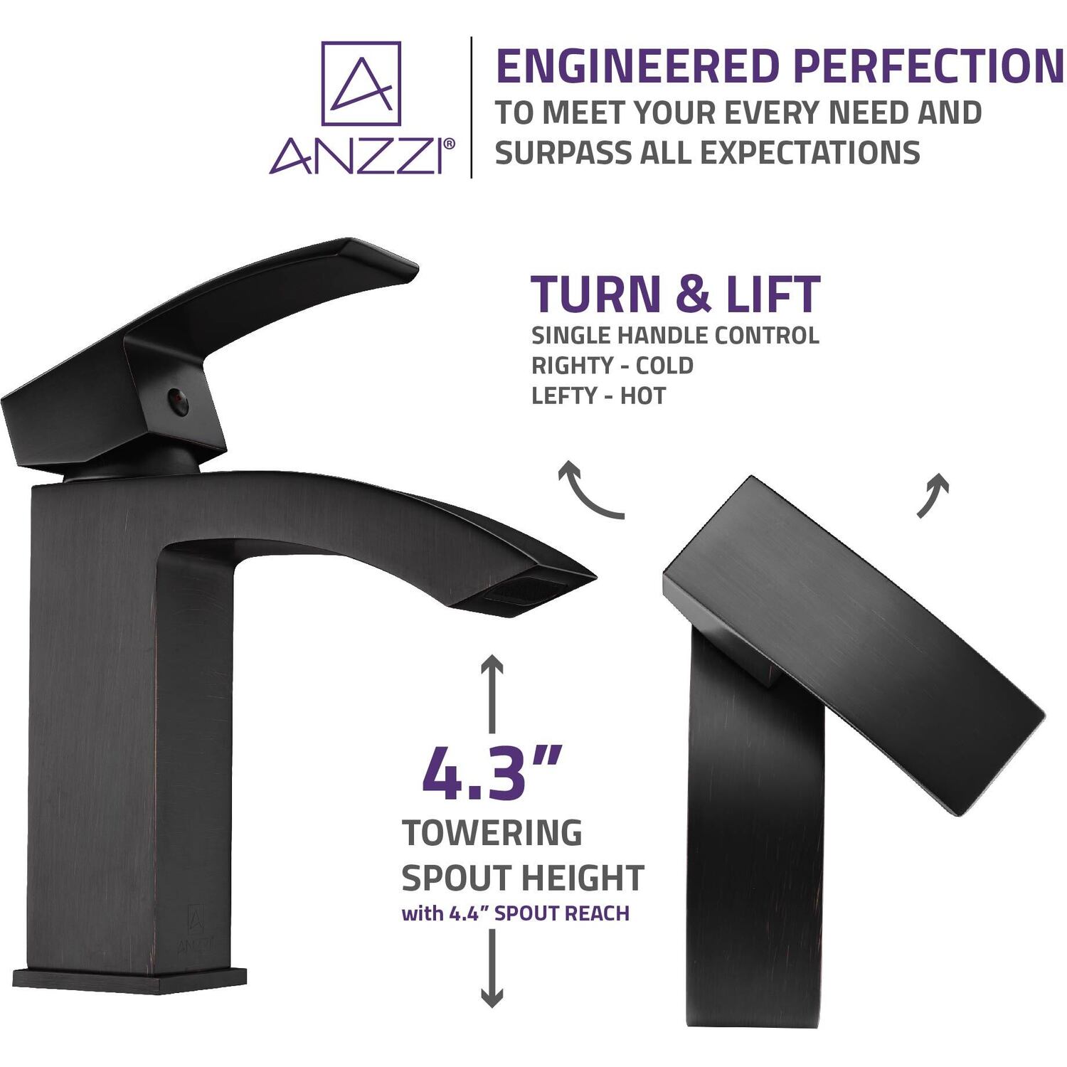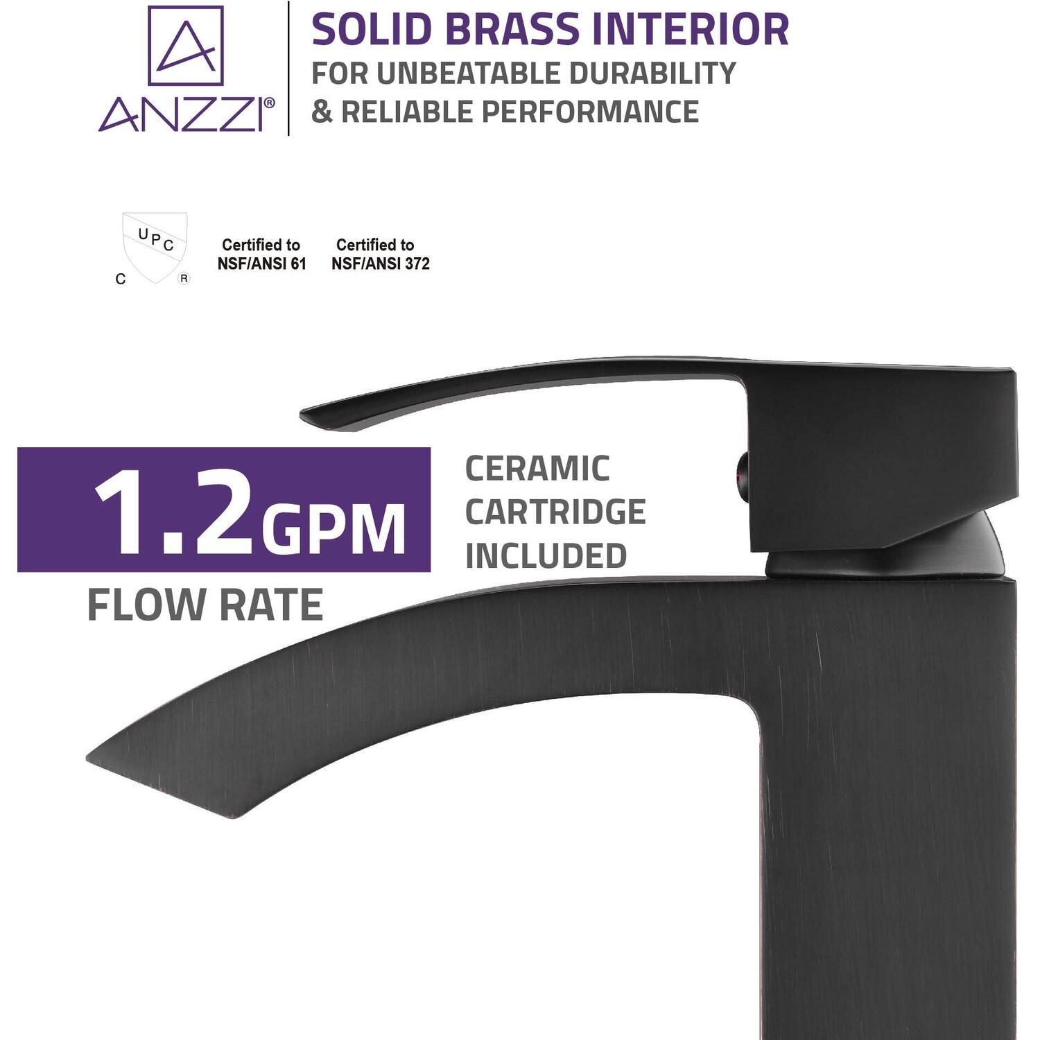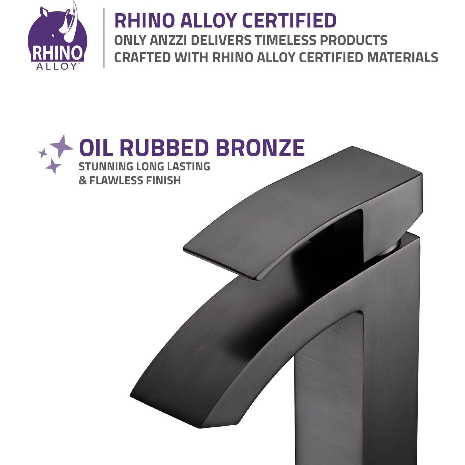 ANZZI is committed to introducing the latest in European bath fixture design to the North American home. ANZZI presents the Revere Single Handle Bathroom Sink Faucet. Crafted using lead-free RHINO ALLOY certified brass as the interior and our Traditional Oil Rubbed Bronze rust resistant finish. This all metal combination of high quality materials ensures you will enjoy a flawlessly performing faucet for many years to come. The deceptively simple single handle design allows for complete and easy control of both water flow and temperature while maintain the fine minimalist aesthetic to match with any modern or contemporary décor style. The ANZZI Revere is listed certified under CUPC, AB 1953, NSF, Water Sense for installation within North America.Traditional Oil Rubbed BronzeRHINO ALLOY certified lead-free solid brass with rust resistant finishSingular (1) lever handle controlElegantly arching spout inspired by the latest European stylesDeck mounted single (1) hole installationSpout Reach: 5.08 in.; Spout Height: 3.93 in.Flow rate: 1.2 gpmCUPC, AB 1953, NSF, Water Sense certified and listed for North AmericaMarine grade quality ceramic disk valve includeShips from factory within 24 hours once order is processedLifetime WarrantyTo speak to a knowledgeable and dedicated ANZZI specialist simply call 1-844-44-ANZZI or visit us on the web at www.ANZZI.com