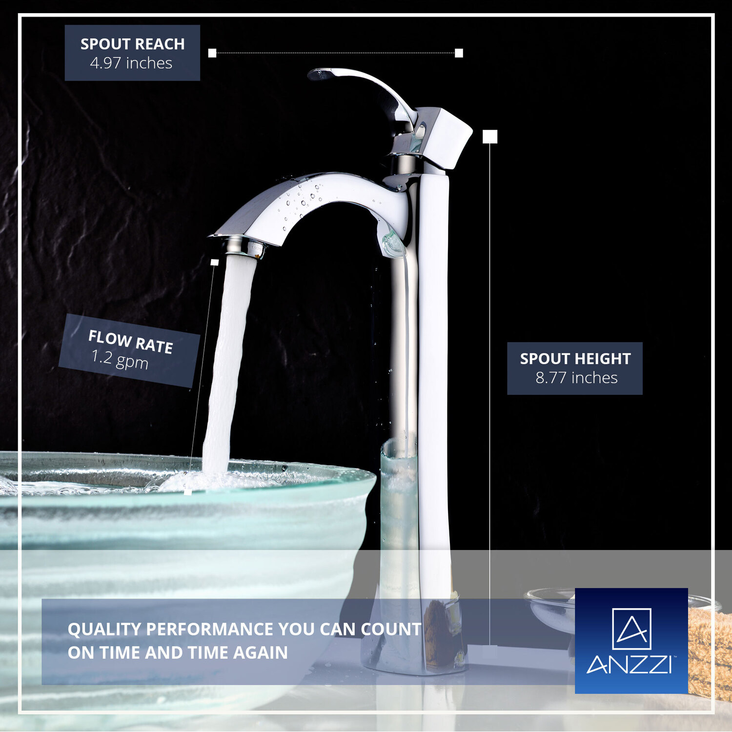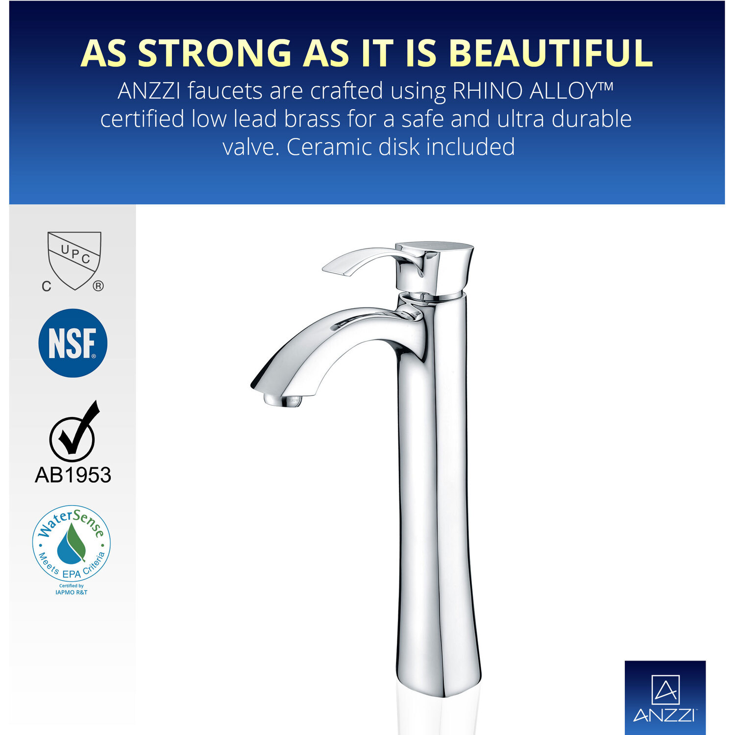 ANZZI is committed to introducing the latest in European bath fixture design to the North American home. ANZZI presents the Harmony Series Single Handle Vessel Sink Faucet. Crafted using lead-free RHINO ALLOY certified brass as the interior and our Lustrous Polished Chrome rust resistant finish. This all metal combination of high quality materials ensures you will enjoy a flawlessly performing faucet for many years to come. The deceptively simple single handle design allows for complete and easy control of both water flow and temperature while maintain the fine minimalist aesthetic to match with any modern or contemporary décor style. The ANZZI Harmony Series is listed certified under cUPC, NSF, AB1953, Watersense for installation within North America.Lustrous Polished Chrome finishRHINO ALLOY certified lead-free solid brass with rust resistant finishSingular (1) lever handle controlElegantly arching spout inspired by the latest European stylesDeck mounted single (1) hole installationSpout Reach: 4.97 in.; Spout Height: 8.77 in.Flow rate: 1.2 gpmcUPC, NSF, AB1953, Watersense certified and listed for North AmericaLimited Lifetime WarrantyTo speak to a knowledgeable and dedicated ANZZI specialist simply call 1-844-44-ANZZI or visit us on the web at www.ANZZI.com