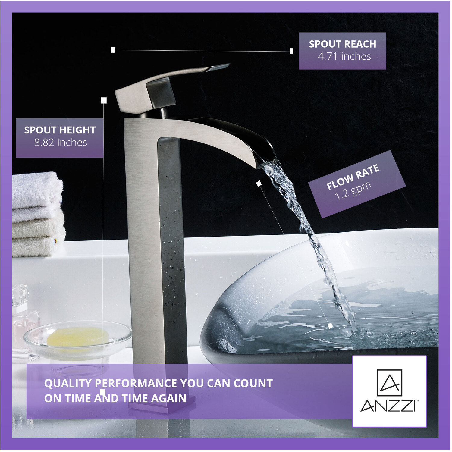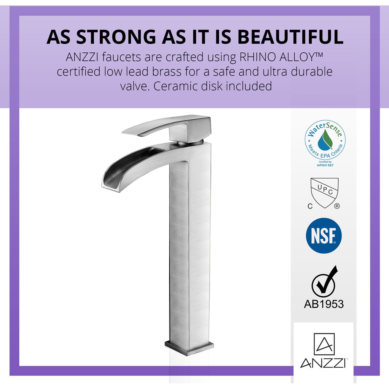 ANZZI is committed to introducing the latest in European bath fixture design to the North American home. ANZZI presents the Key Series Single Handle Vessel Sink Faucet. Crafted using lead-free RHINO ALLOY certified brass as the interior and our Traditional Brushed Nickel rust resistant finish. This all metal combination of high quality materials ensures you will enjoy a flawlessly performing faucet for many years to come. The deceptively simple single handle design allows for complete and easy control of both water flow and temperature while maintain the fine minimalist aesthetic to match with any modern or contemporary décor style. The ANZZI Key Series is listed certified under cUPC, NSF, AB1953, Watersense, ADA for installation within North America.Traditional Brushed Nickel finishRHINO ALLOY certified lead-free solid brass with rust resistant finishSingular (1) lever handle controlElegantly arching spout inspired by the latest European stylesDeck mounted single (1) hole installationSpout Reach: 4.71 in.; Spout Height: 8.82 in.Flow rate: 1.2 gpmcUPC, NSF, AB1953, Watersense, ADA certified and listed for North AmericaLimited Lifetime WarrantyTo speak to a knowledgeable and dedicated ANZZI specialist simply call 1-844-44-ANZZI or visit us on the web at www.ANZZI.com