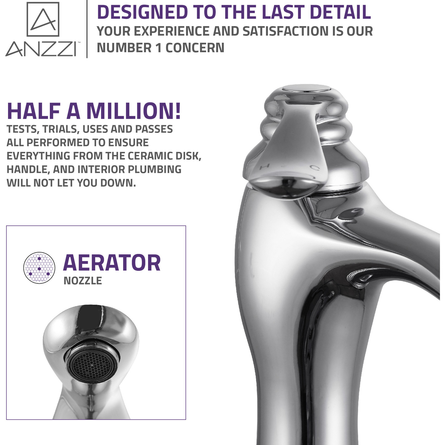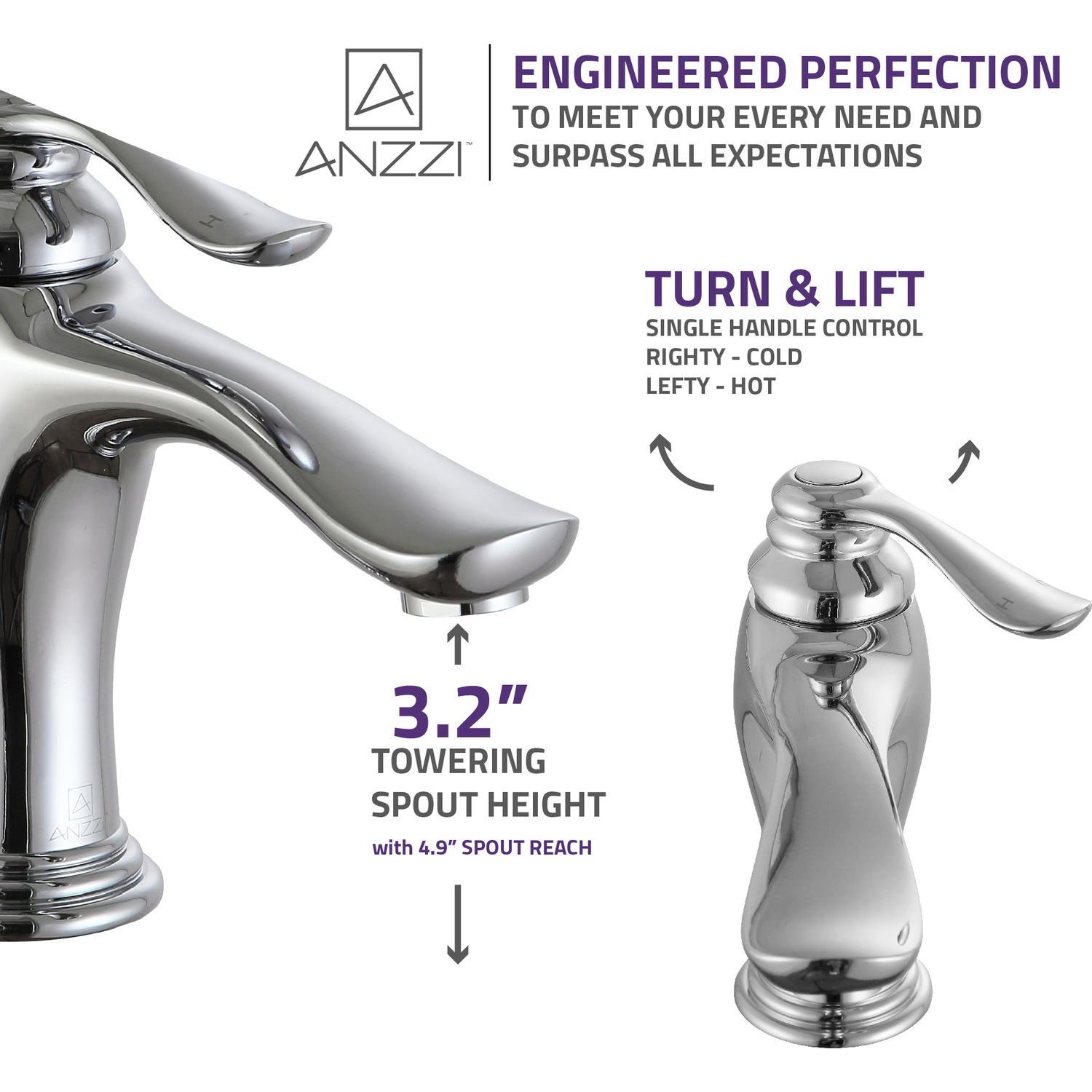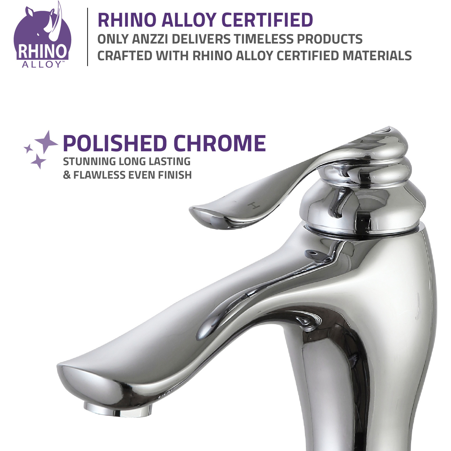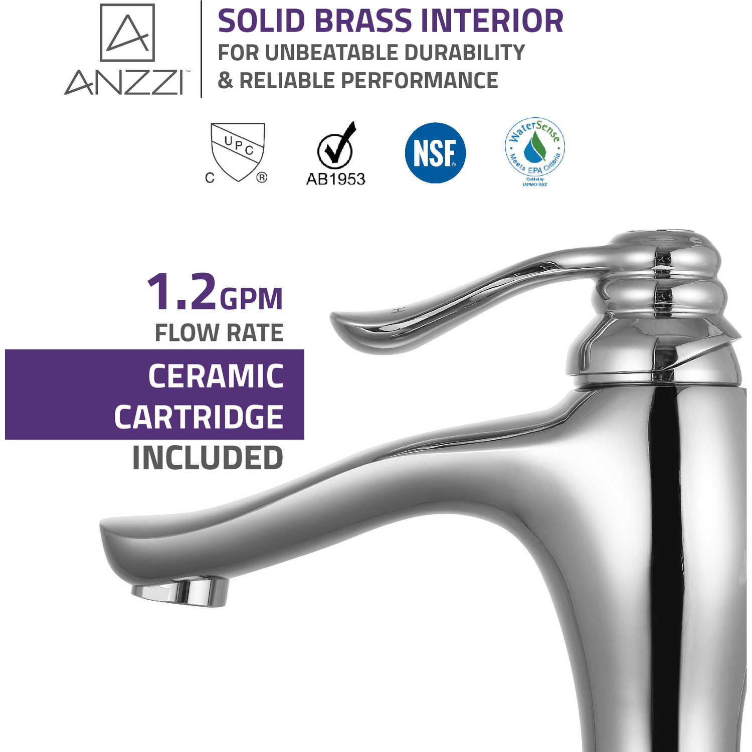 ANZZI is committed to introducing the latest in European bath fixture design to the North American home. ANZZI presents the Anfore single handle bathroom sink faucet. Crafted using RHINO ALLOY certified brass interior, marine grade ceramic disk and polished chrome lead-free rust resistant finish. The elegance and style of our ANZZI faucets is matched by their proven performance and reliability, which is why our faucets are backed by the ANZZI Limited Lifetime Warranty. Become a member of the ANZZI family and experience why Perfection is our Tradition.Lustrous polished chrome finishRHINO ALLOY certified lead-free solid brass with rust resistant finishSingle (1) handle operationSingle (1) hole installationMarine grade ceramic disk includedSpout reach: 4.92 in.; spout height: 3.25 in.Flow rate: 1.2 gpmConnection size: 3/8 in.cUPC, NSF, AB1953 and Watersense certifiedLimited lifetime warrantyShips from factory within 24 hours of orderTo speak to a knowledgeable and dedicated ANZZI specialist simply call 1-844-44-ANZZI or visit us on the web at www.ANZZI.com