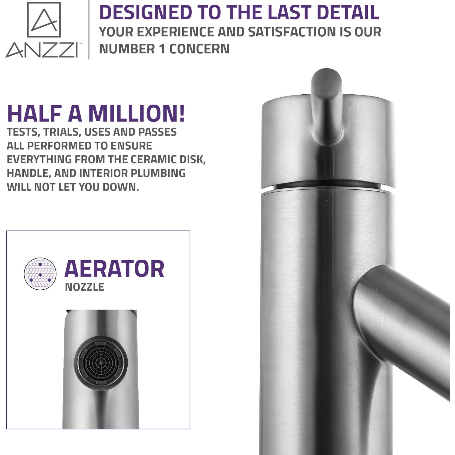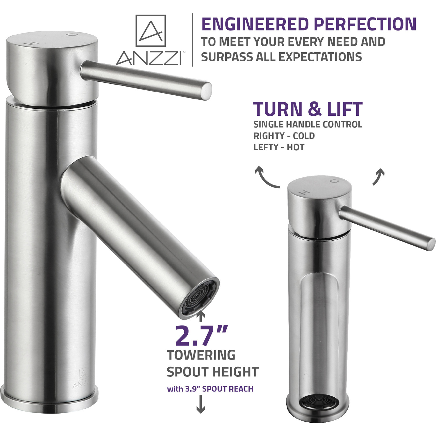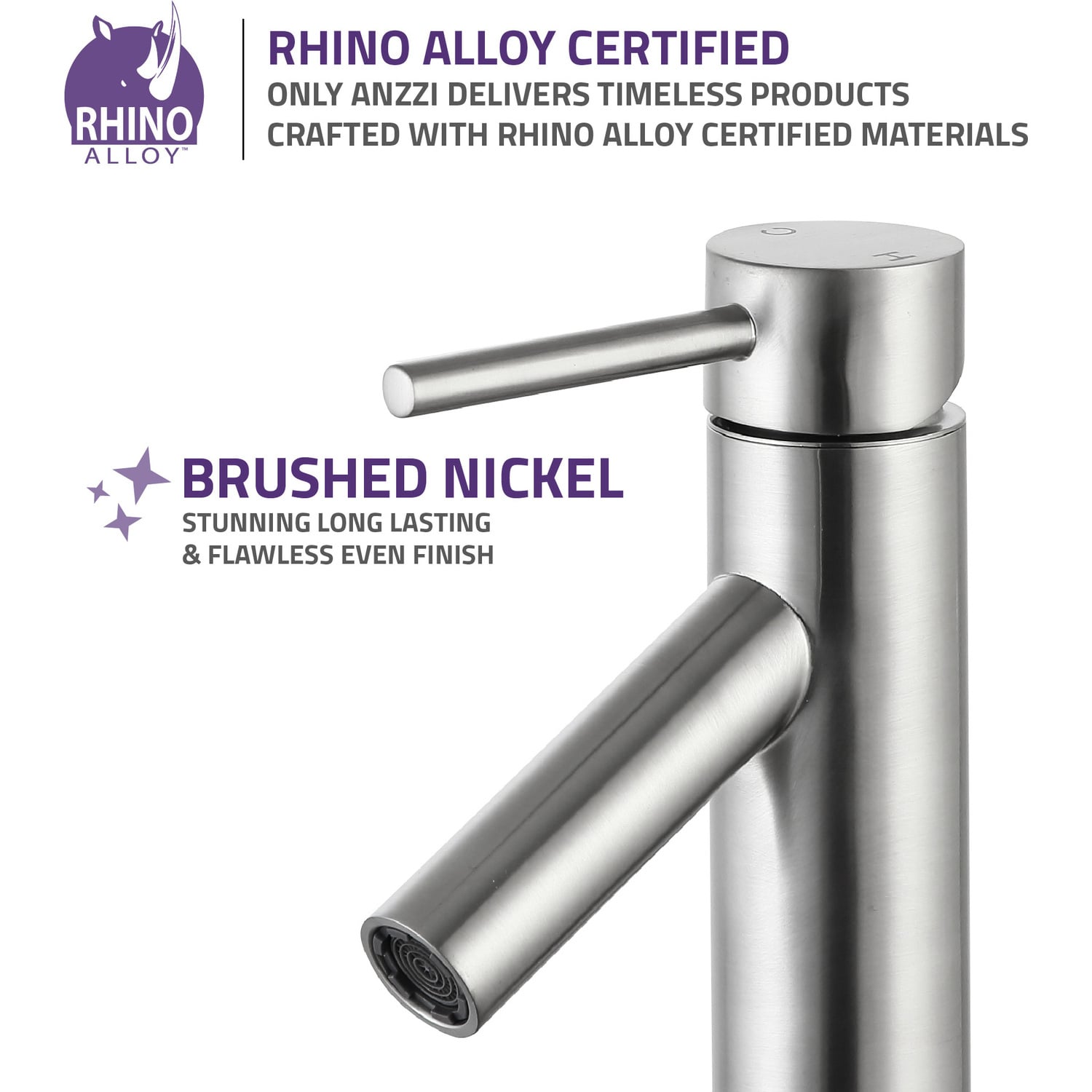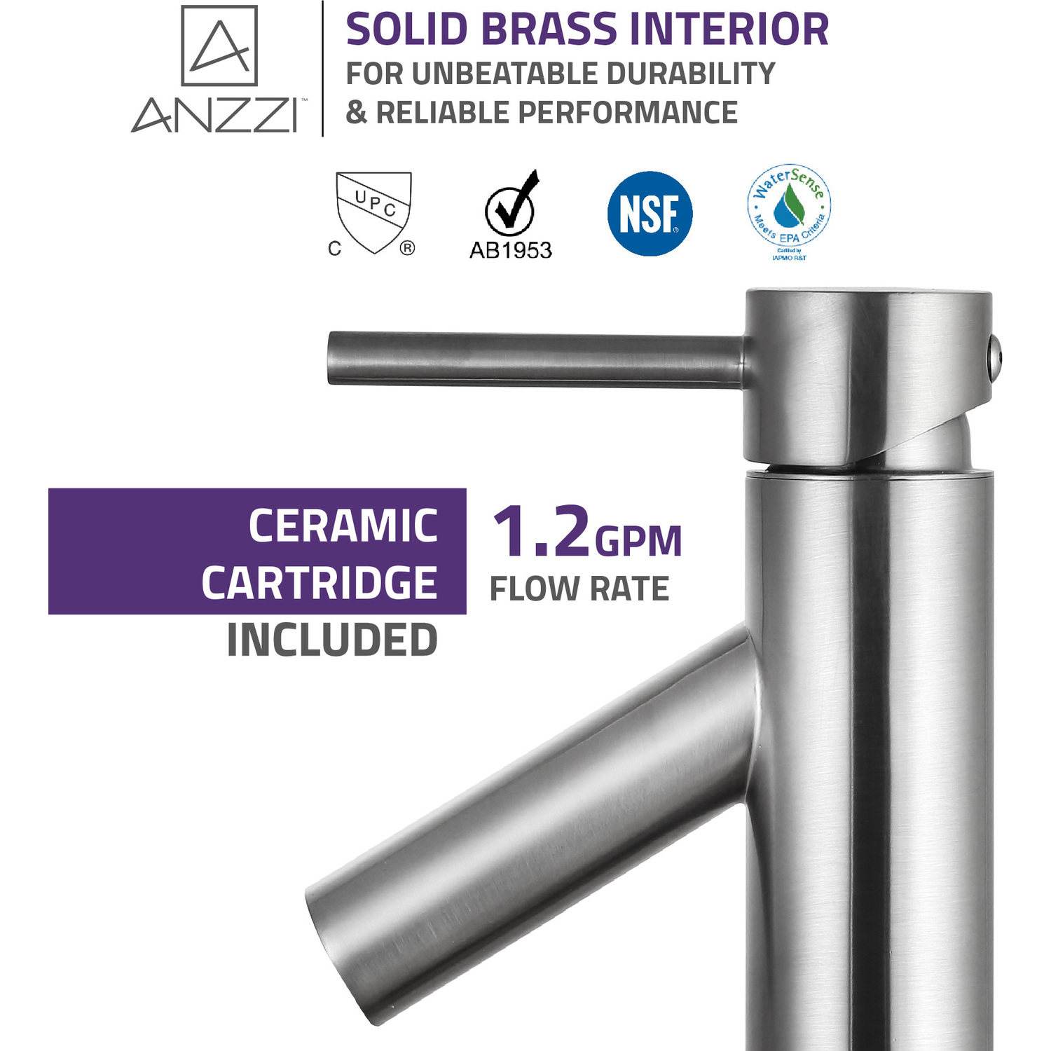 ANZZI is committed to introducing the latest in European bath fixture design to the North American home. ANZZI presents the Valle single handle bathroom sink faucet. Crafted using RHINO ALLOY certified brass interior, marine grade ceramic disk and brushed nickel lead-free rust resistant finish. The elegance and style of our ANZZI faucets is matched by their proven performance and reliability, which is why our faucets are backed by the ANZZI Limited Lifetime Warranty. Become a member of the ANZZI family and experience why Perfection is our Tradition.Stunning brushed nickel finishRHINO ALLOY certified lead-free solid brass with rust resistant finishSingle (1) handle operationSingle (1) hole installationMarine grade ceramic disk includedSpout reach: 3.94 in.; spout height: 2.75 in.Flow rate: 1.2 gpmConnection size: 3/8 in.cUPC, NSF, AB1953 and Watersense certifiedLimited lifetime warrantyShips from factory within 24 hours of orderTo speak to a knowledgeable and dedicated ANZZI specialist simply call 1-844-44-ANZZI or visit us on the web at www.ANZZI.com